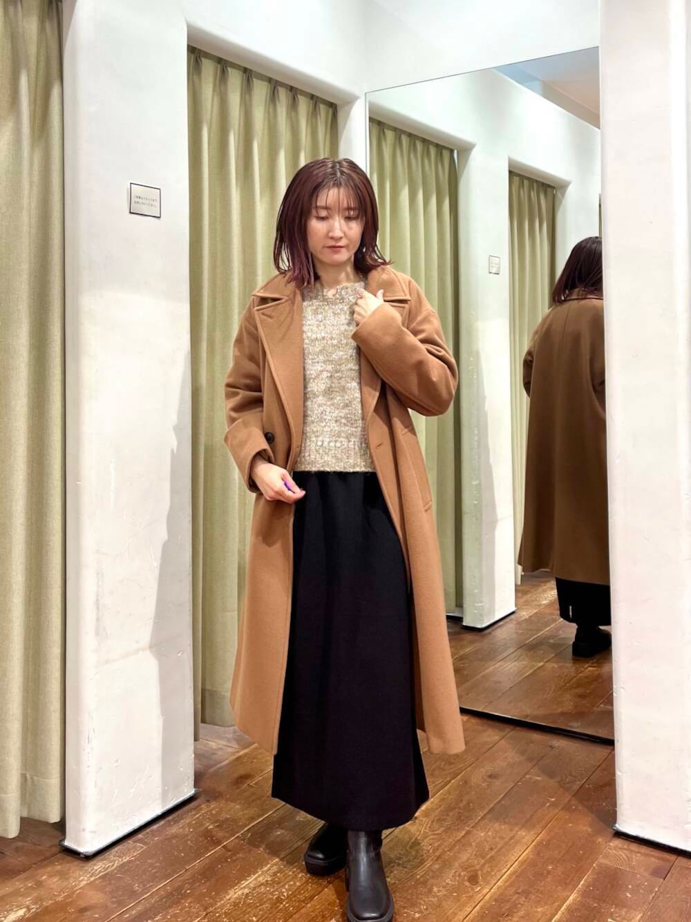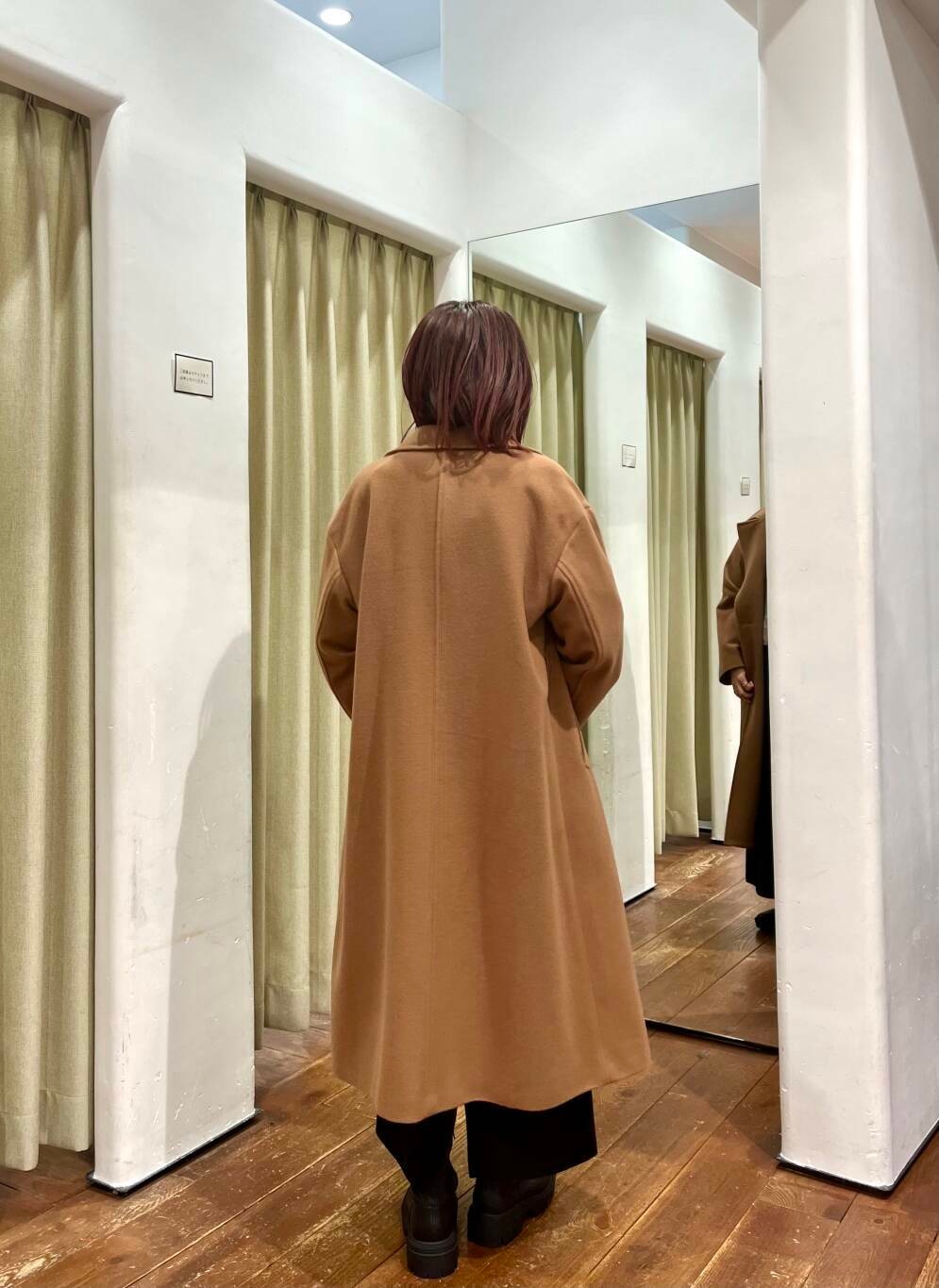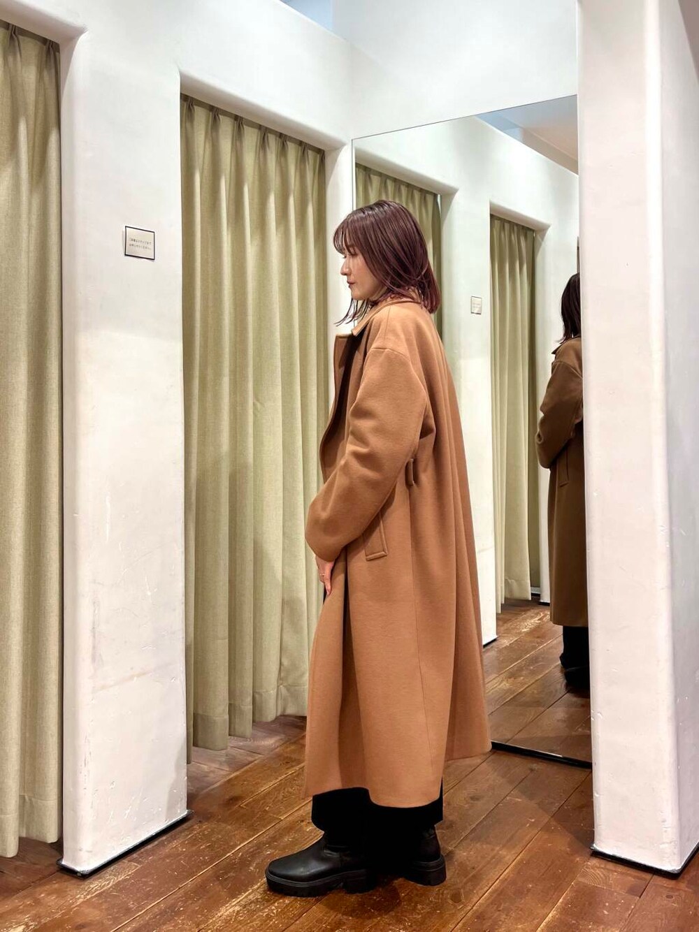 前を開けてもすっきりと見えるゆるすぎないサイズ感です。ベルトもついているのでウエストをマークすれば女性らしいメリハリのあるシルエットになります。