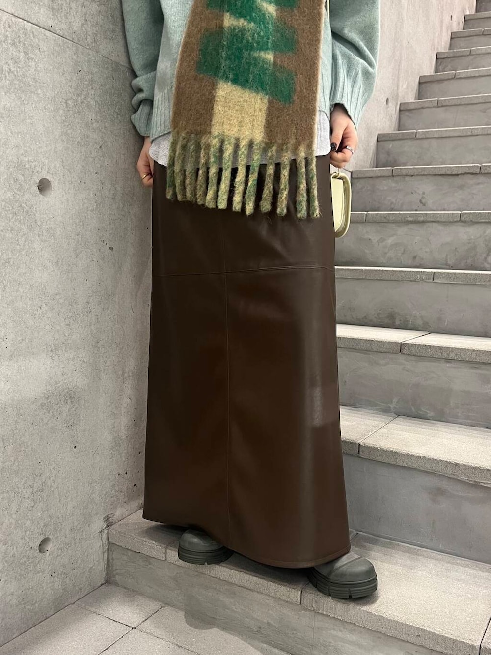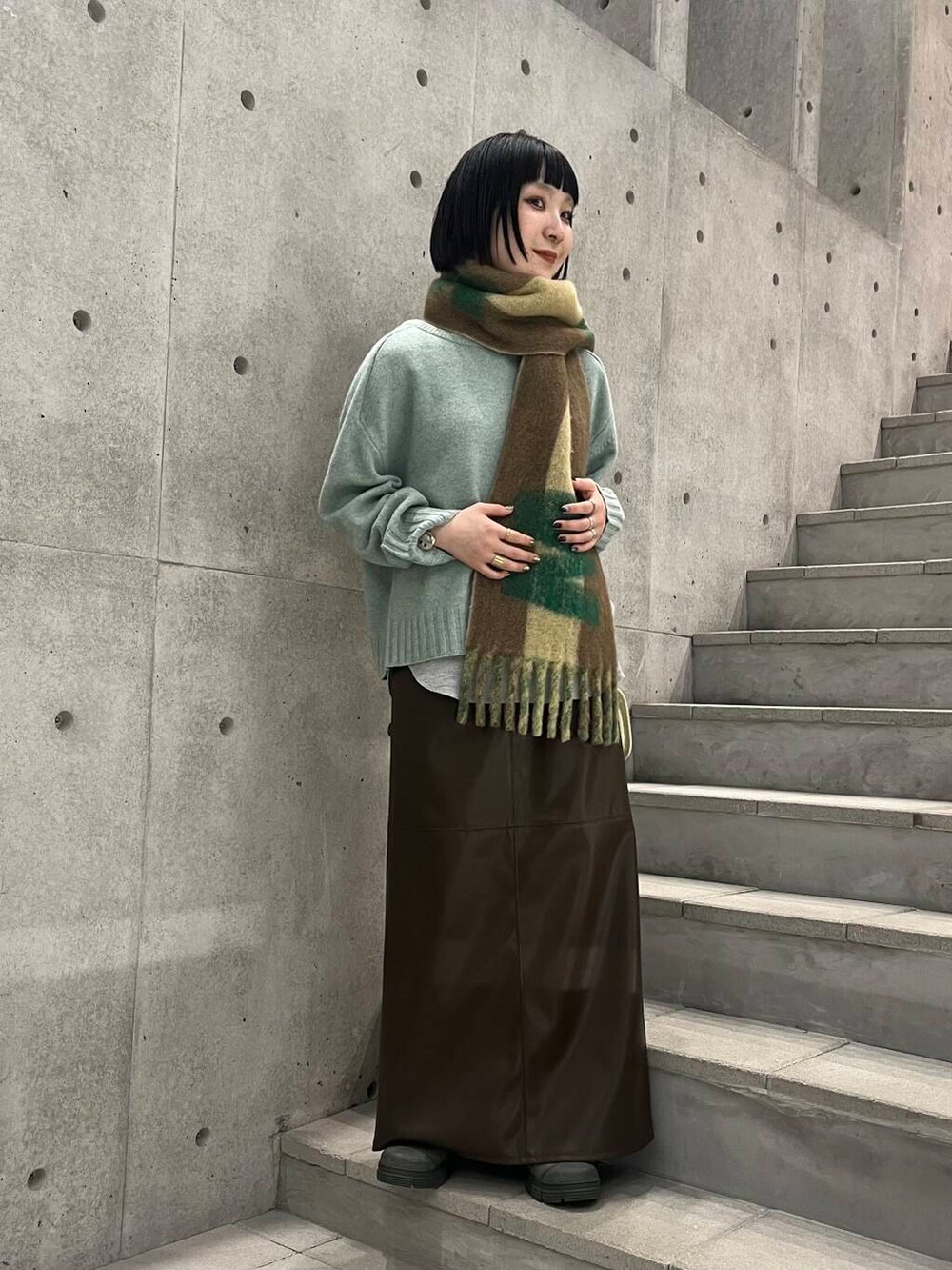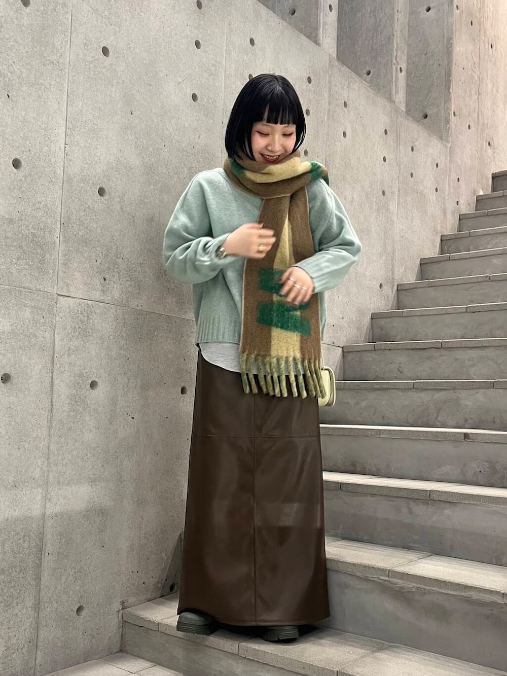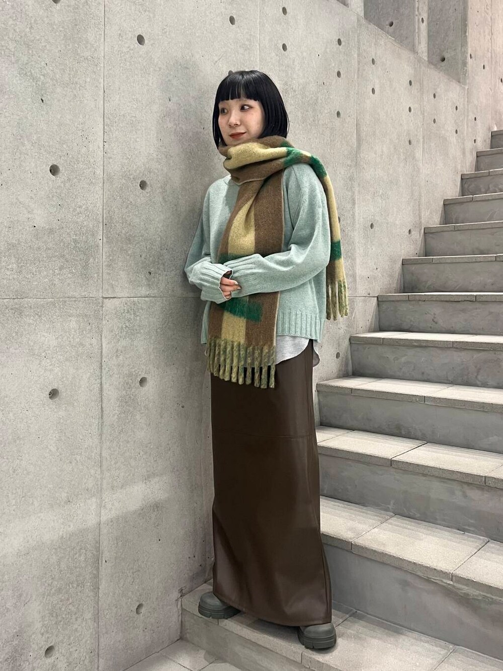 グリーン、ブラウン、イエローのおちついた冬コーデにしてみました!