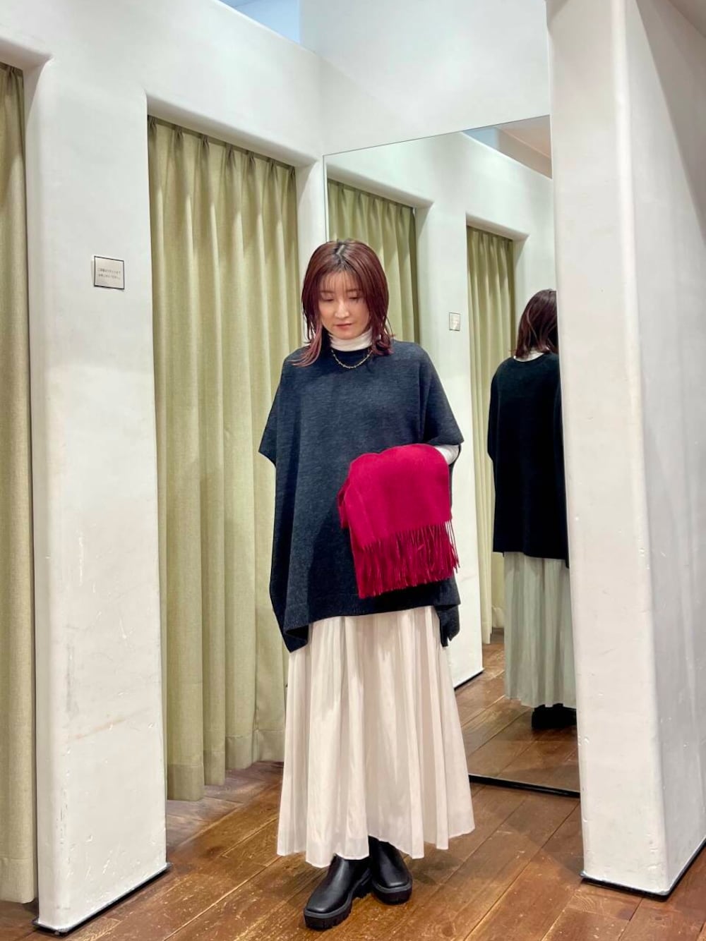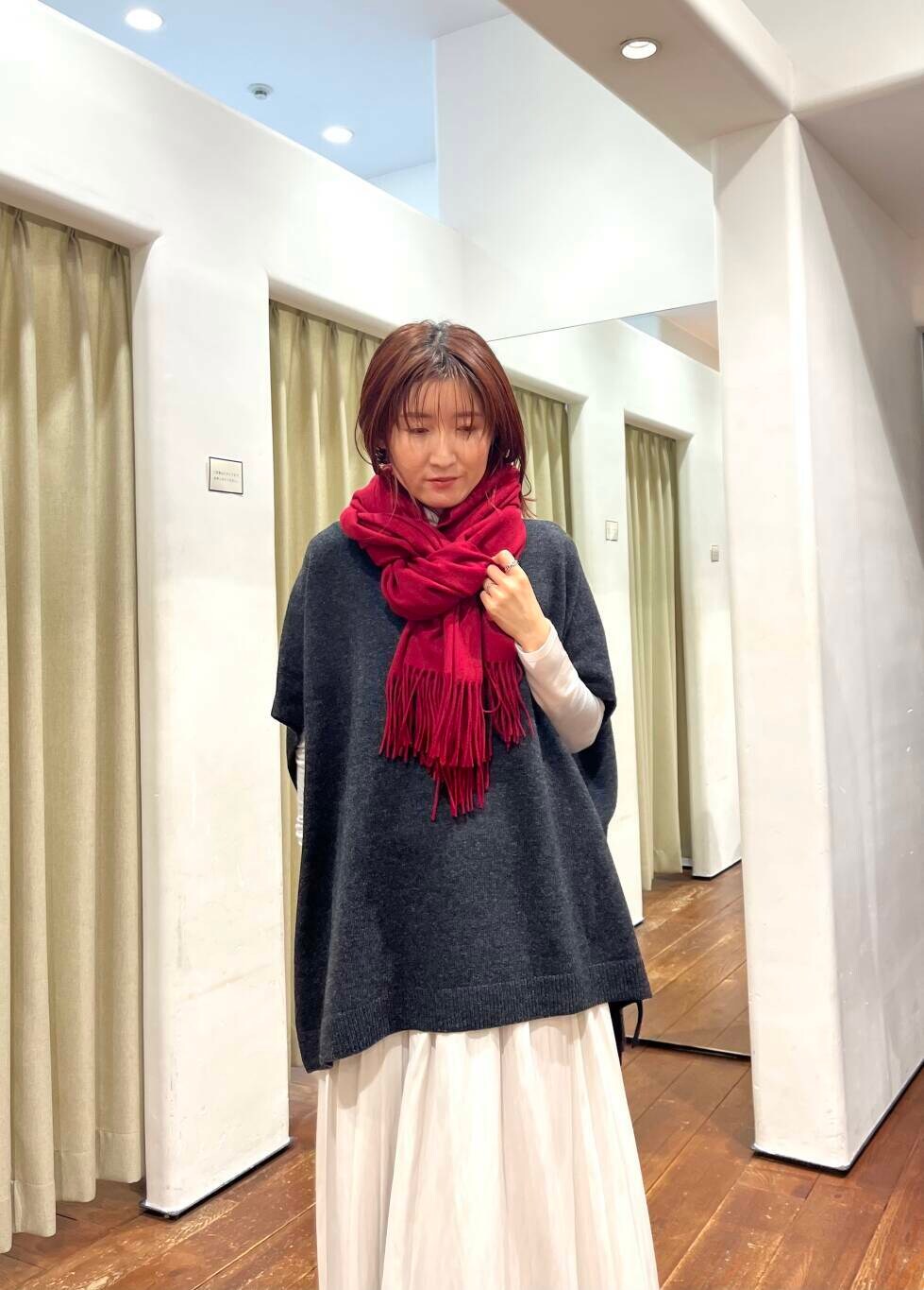 シンプルなのでアクセントカラーのストールを巻いて色味を足しました。こちらのストールは肌触りが良いので1枚あれば大活躍します。