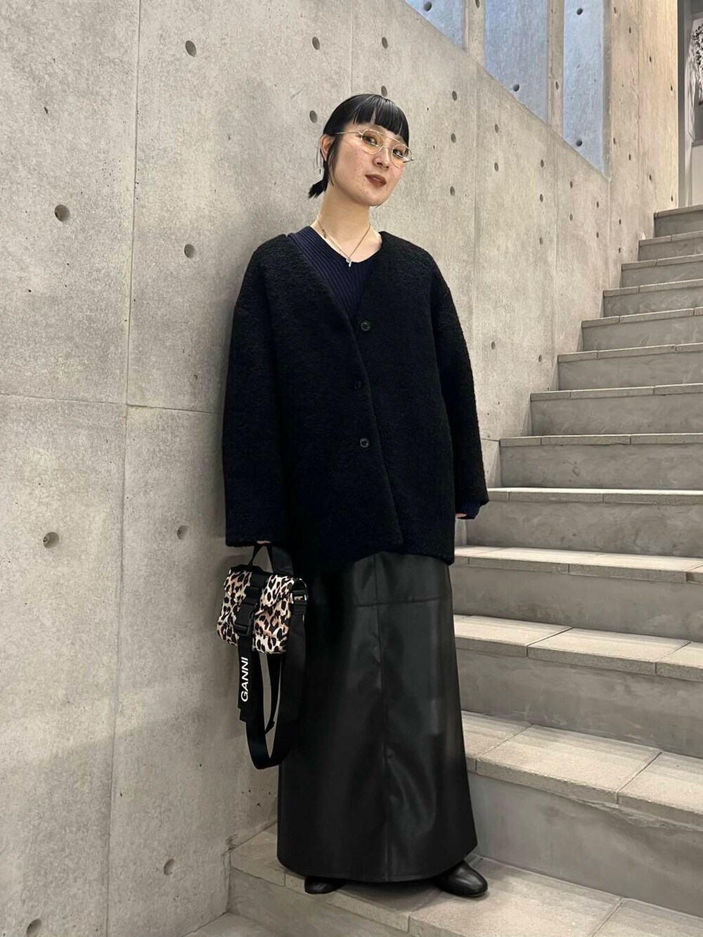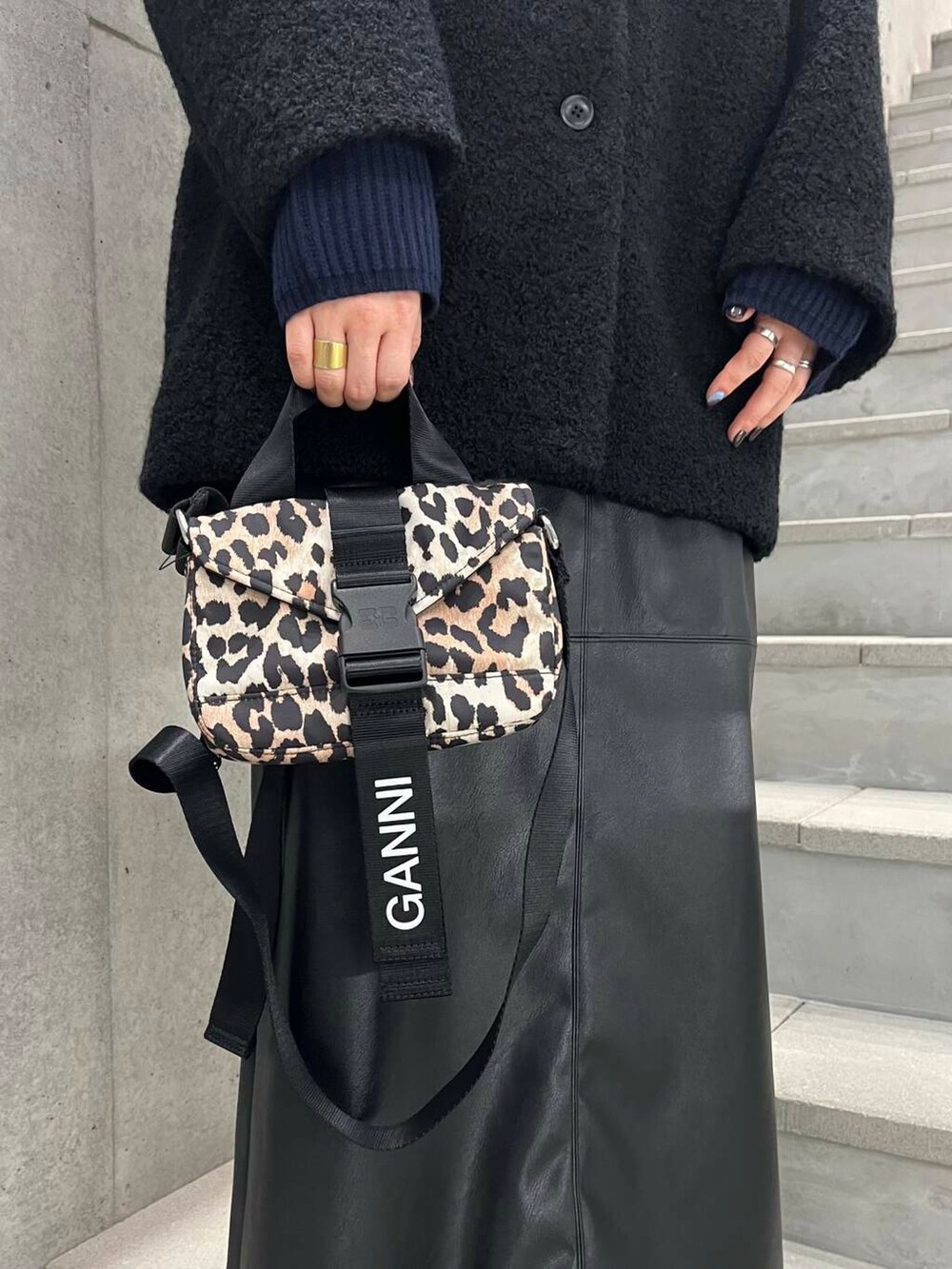 GANNIのレオパードのバッグを差し色にしてます。こちらはミニサイズですが、バックパックもございますので是非UR KYOTOにてご覧くださいませ。