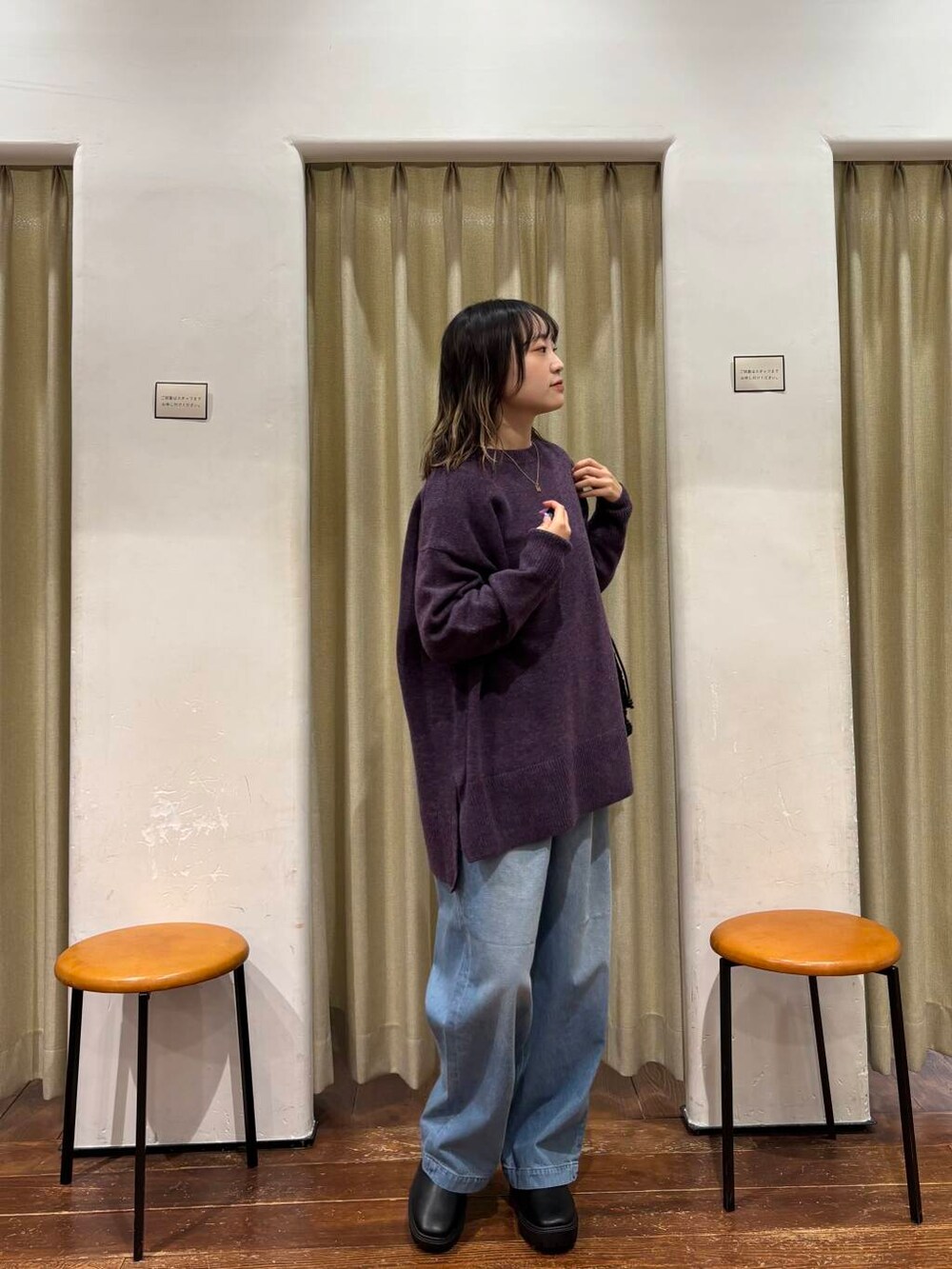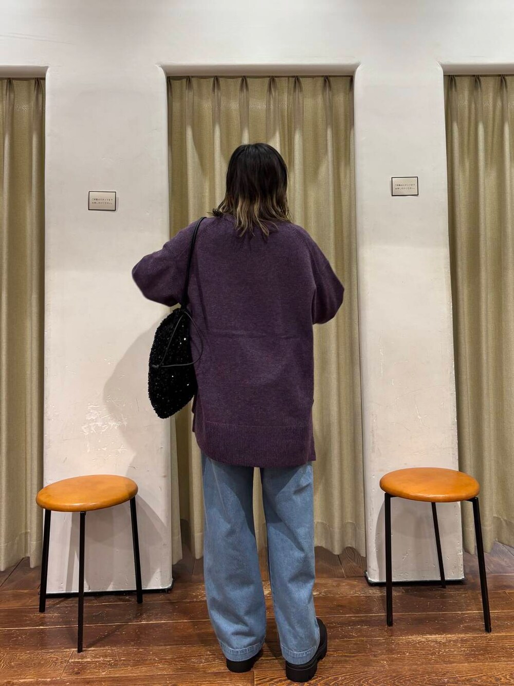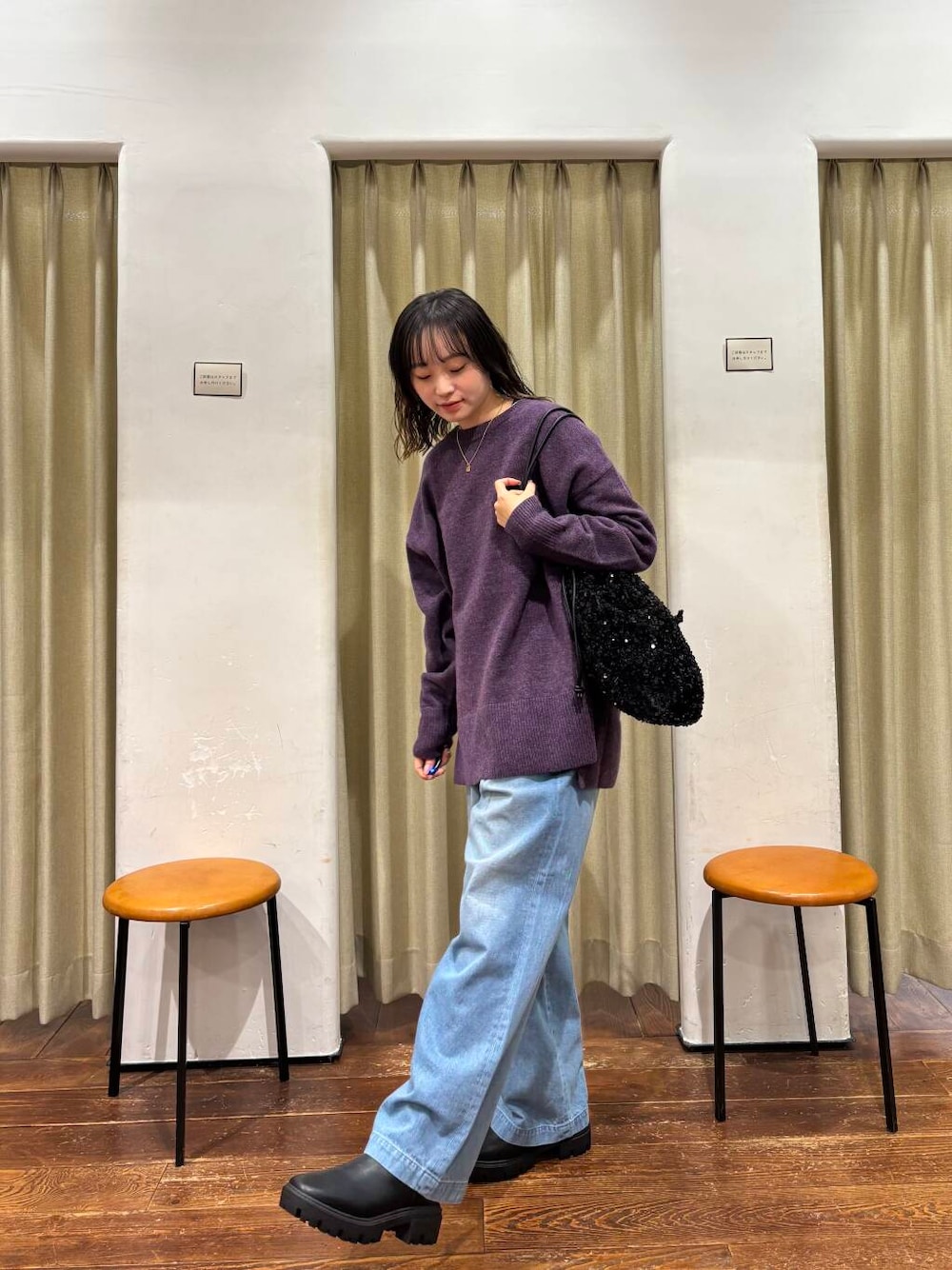 ニットが少しオーバーでゆったりとしているので、バッグとブーツを黒にしてスッキリみえるようにしました!!