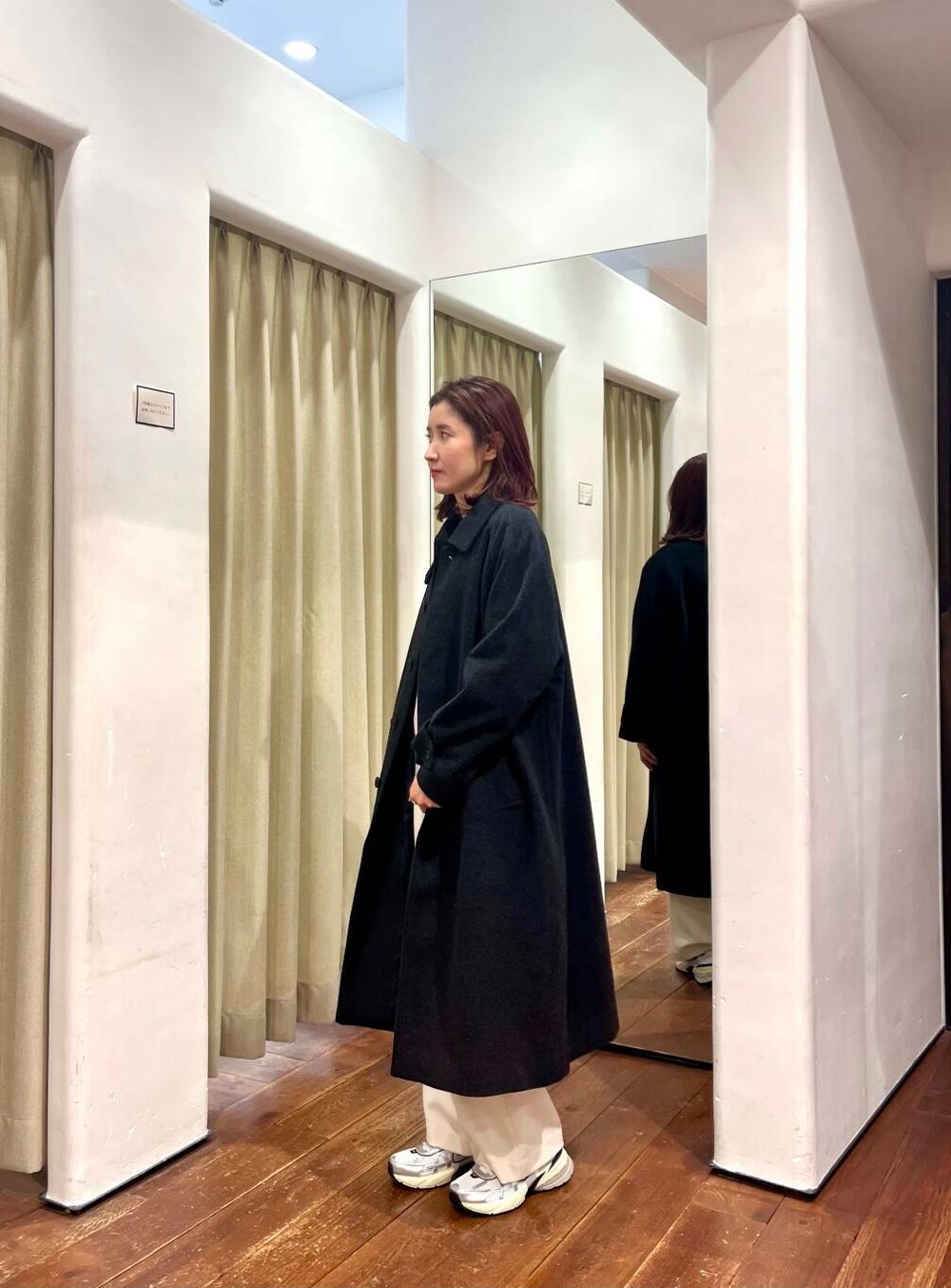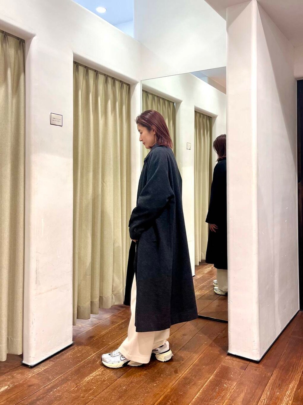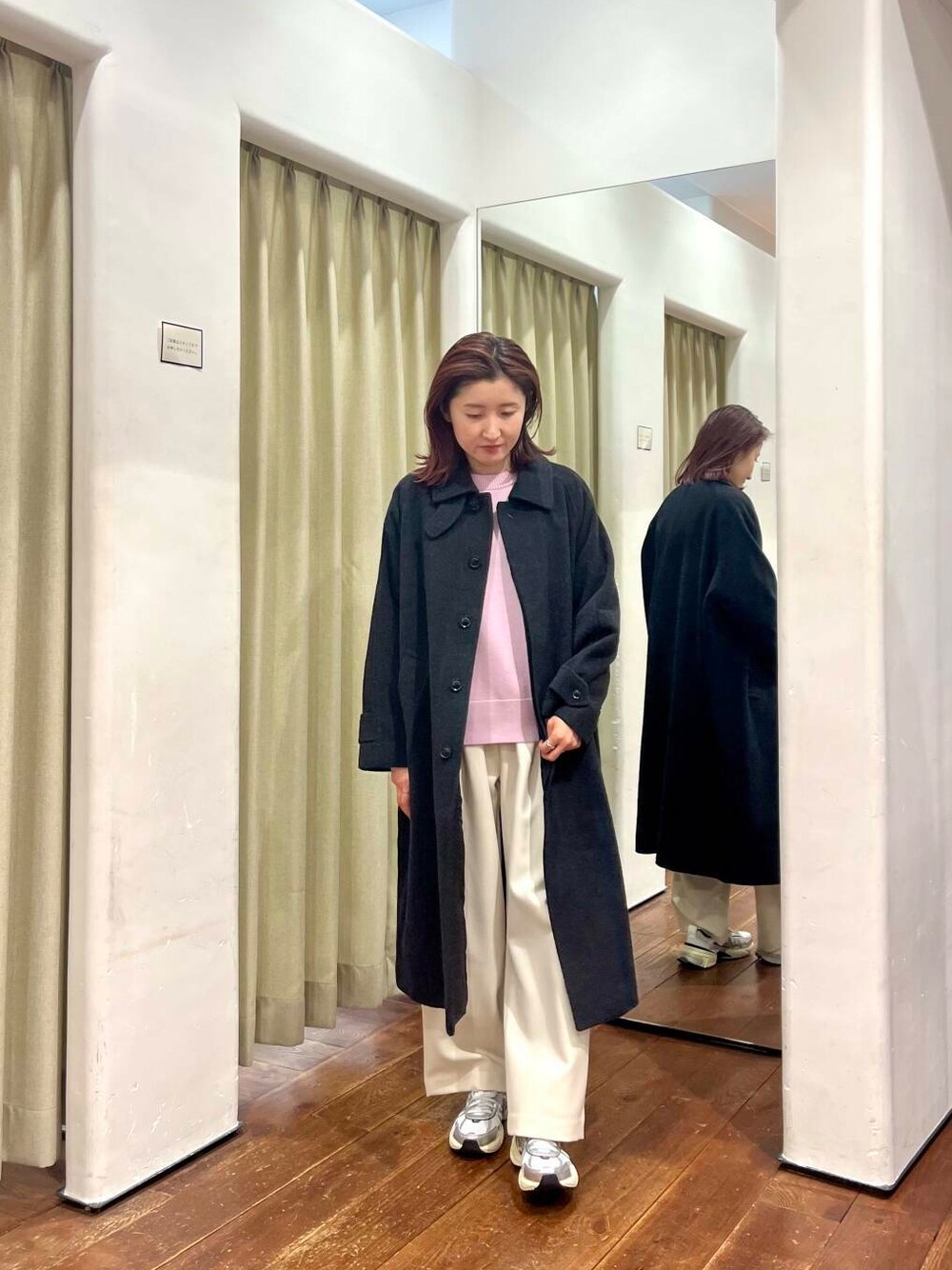 ボトムスにも白を合わせることでコートの色が落ち着いていてもパッと明るいコーディネートに仕上がります。