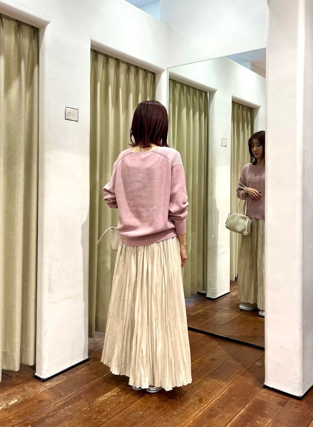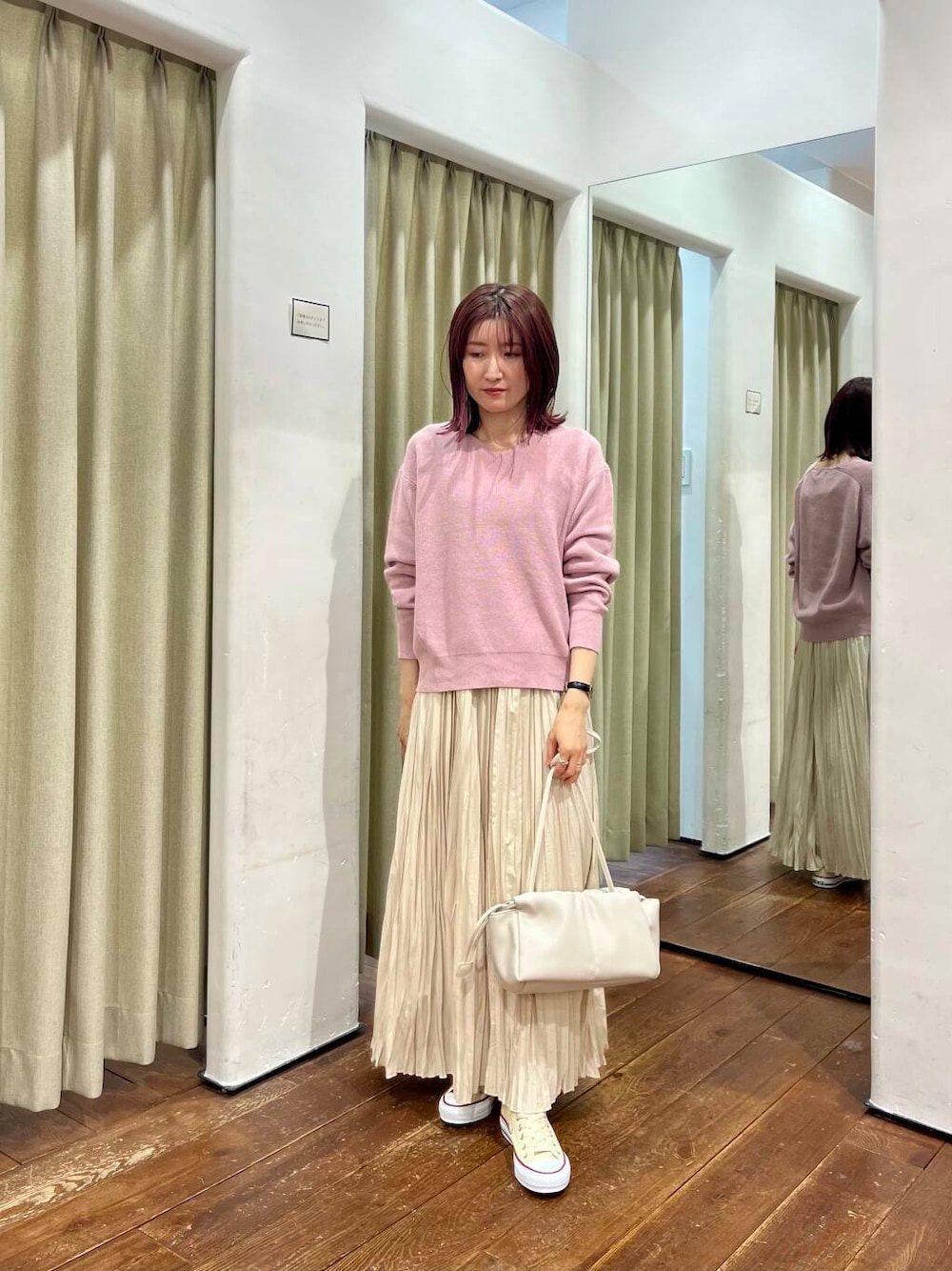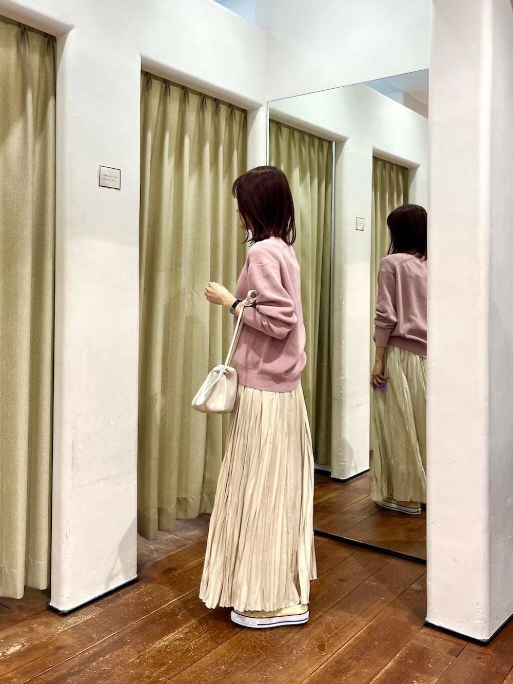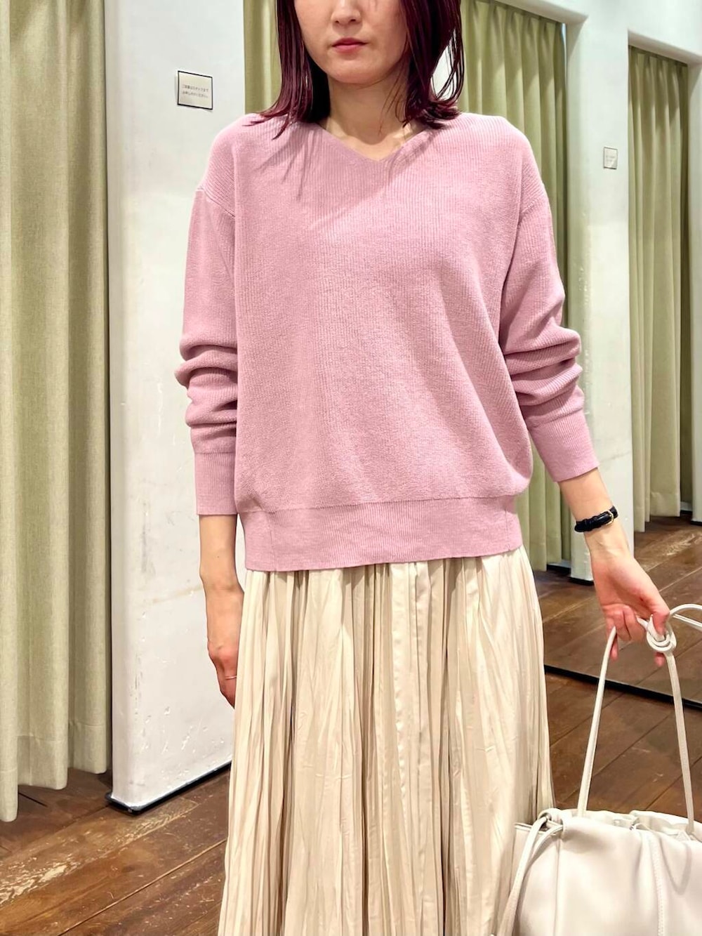 トップスのニットはVネックが深過ぎないので合わせやすく、顔まわりをすっきり見せてくれます。優しいカラーのピンクなので取り入れやすくておすすめです◎
