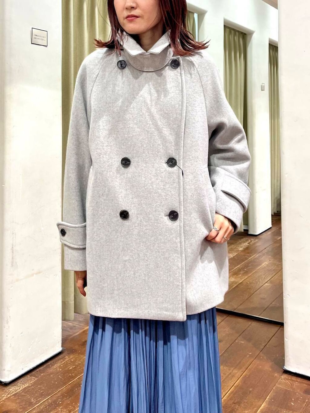 コートは人気のPコートです。こちらもウール100%で裏地も付いているのであたたかく軽いです。襟元まで留めると雰囲気がガラッと変わって落ち着いた雰囲気になります。