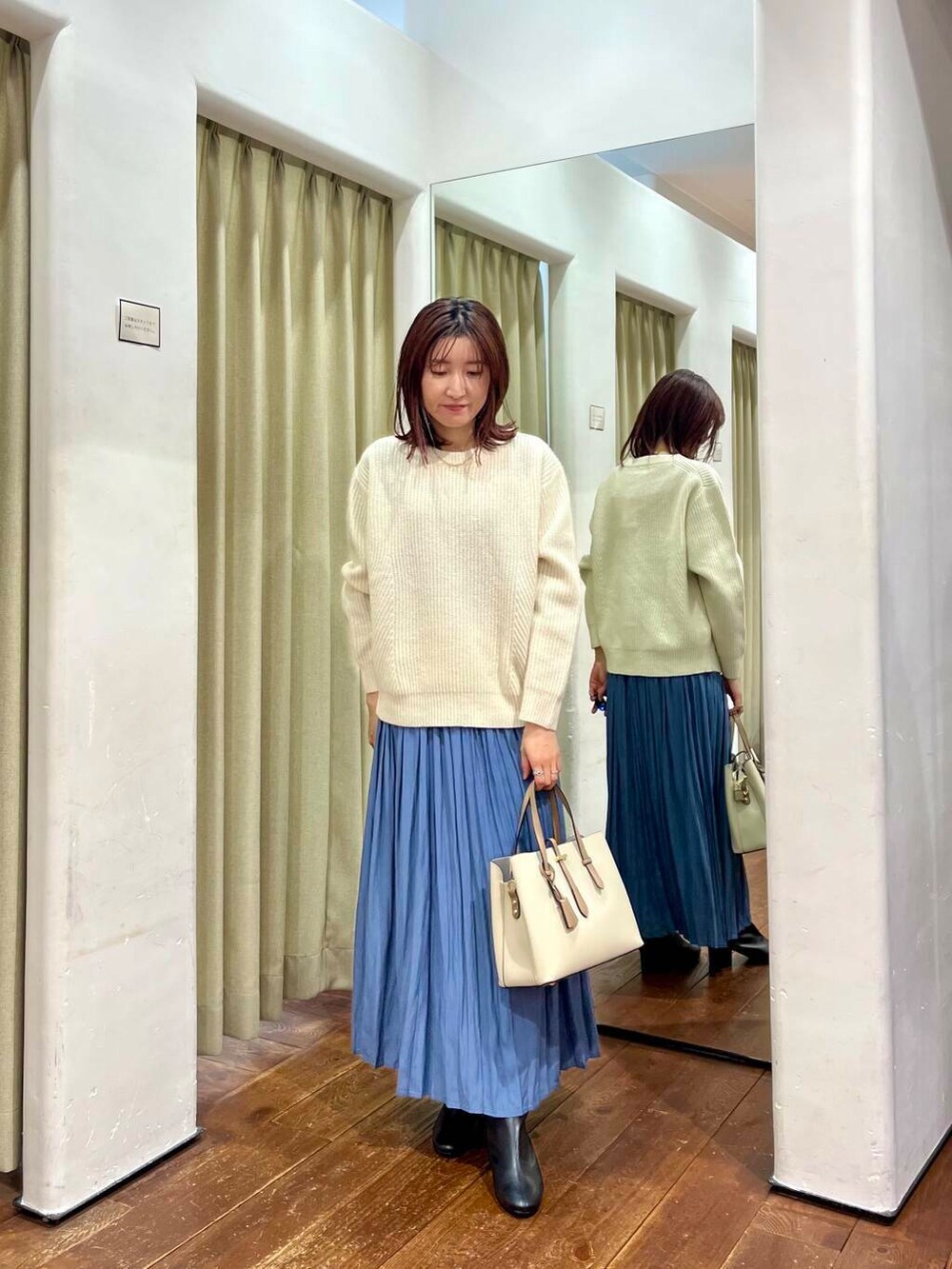 スカートはランダムプリーツなので動きもあって下着などのラインも出ないので楽に履いていただけます。春先まで使えるカラーでおすすめです◎