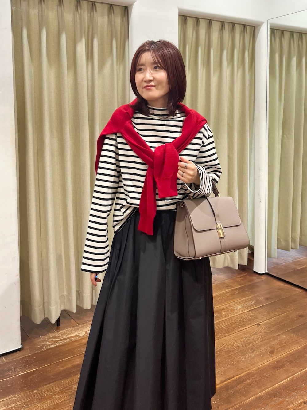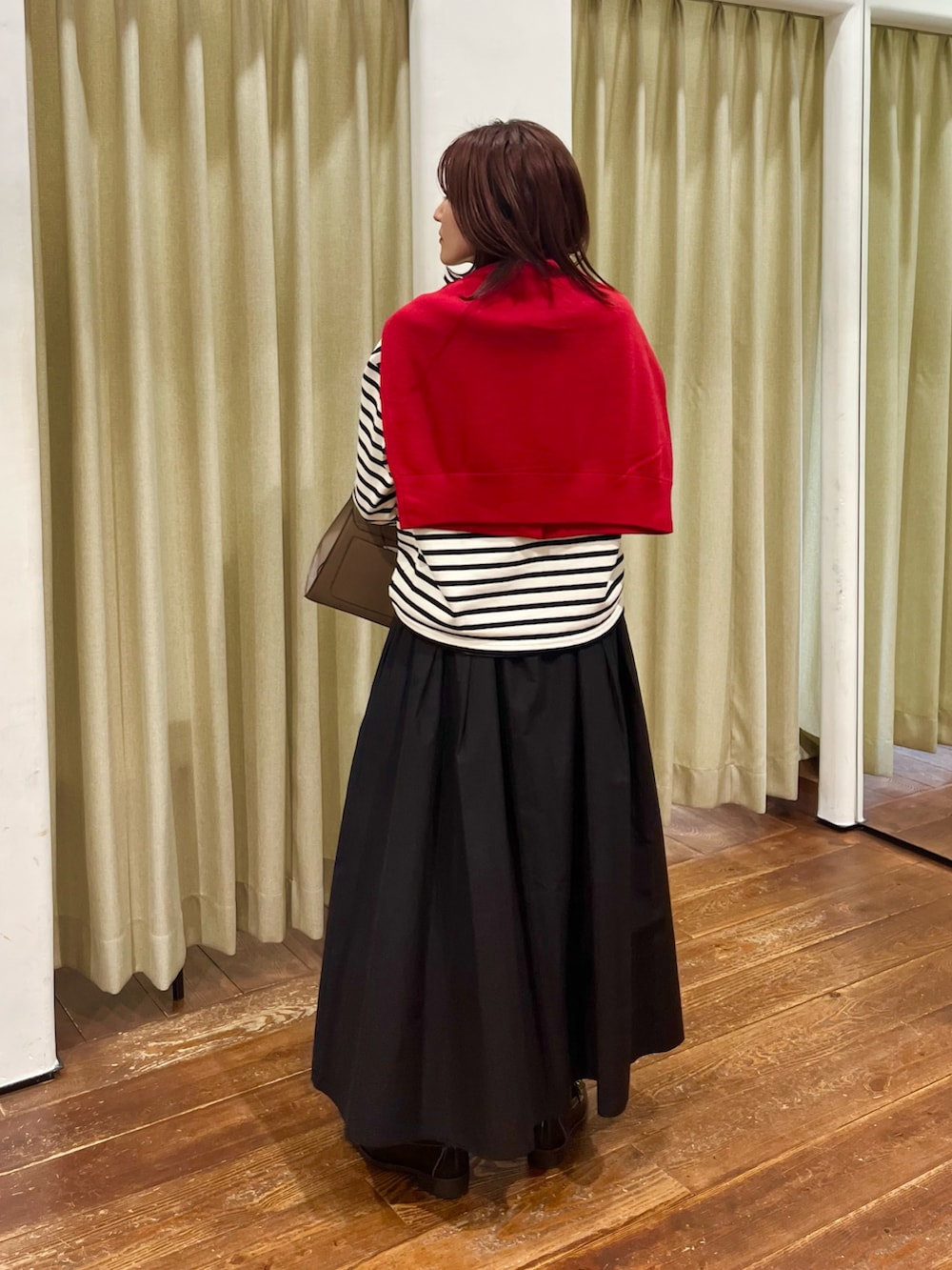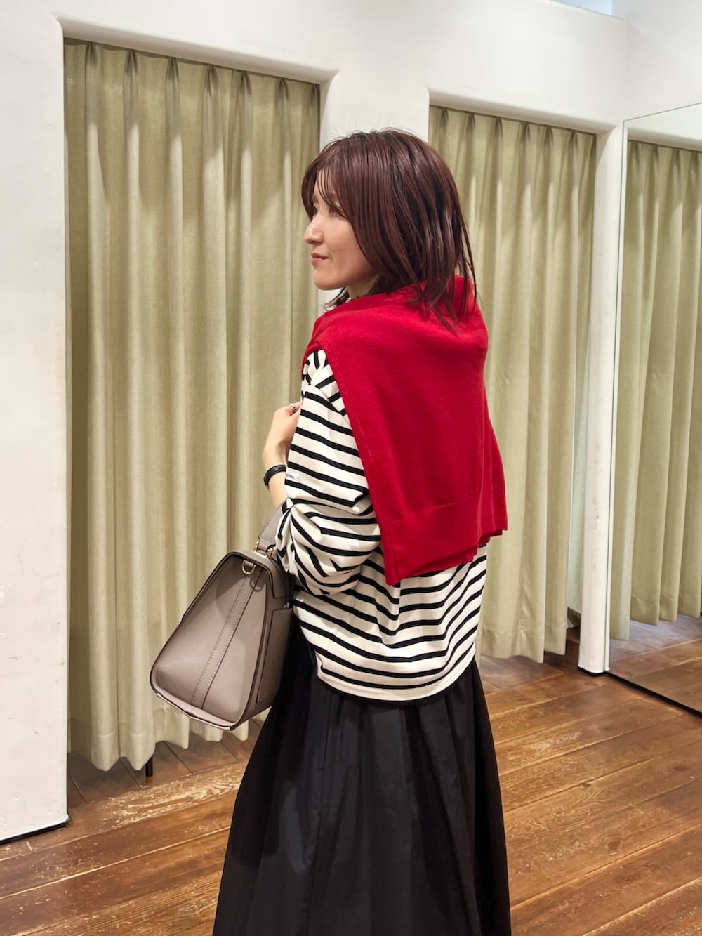 ポイントに赤のカーディガンを巻きましたが着ていただいても可愛いので1枚あると便利ですよ♪