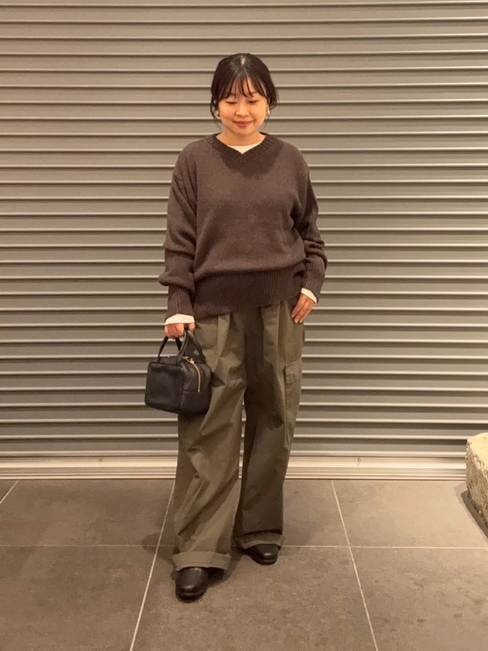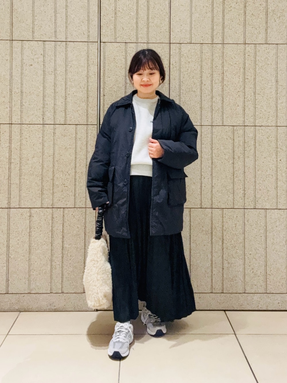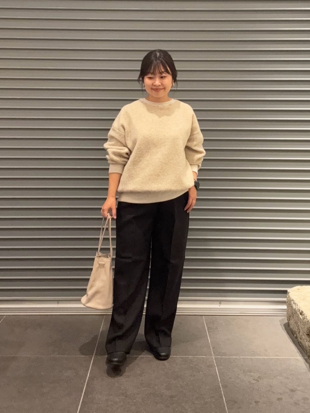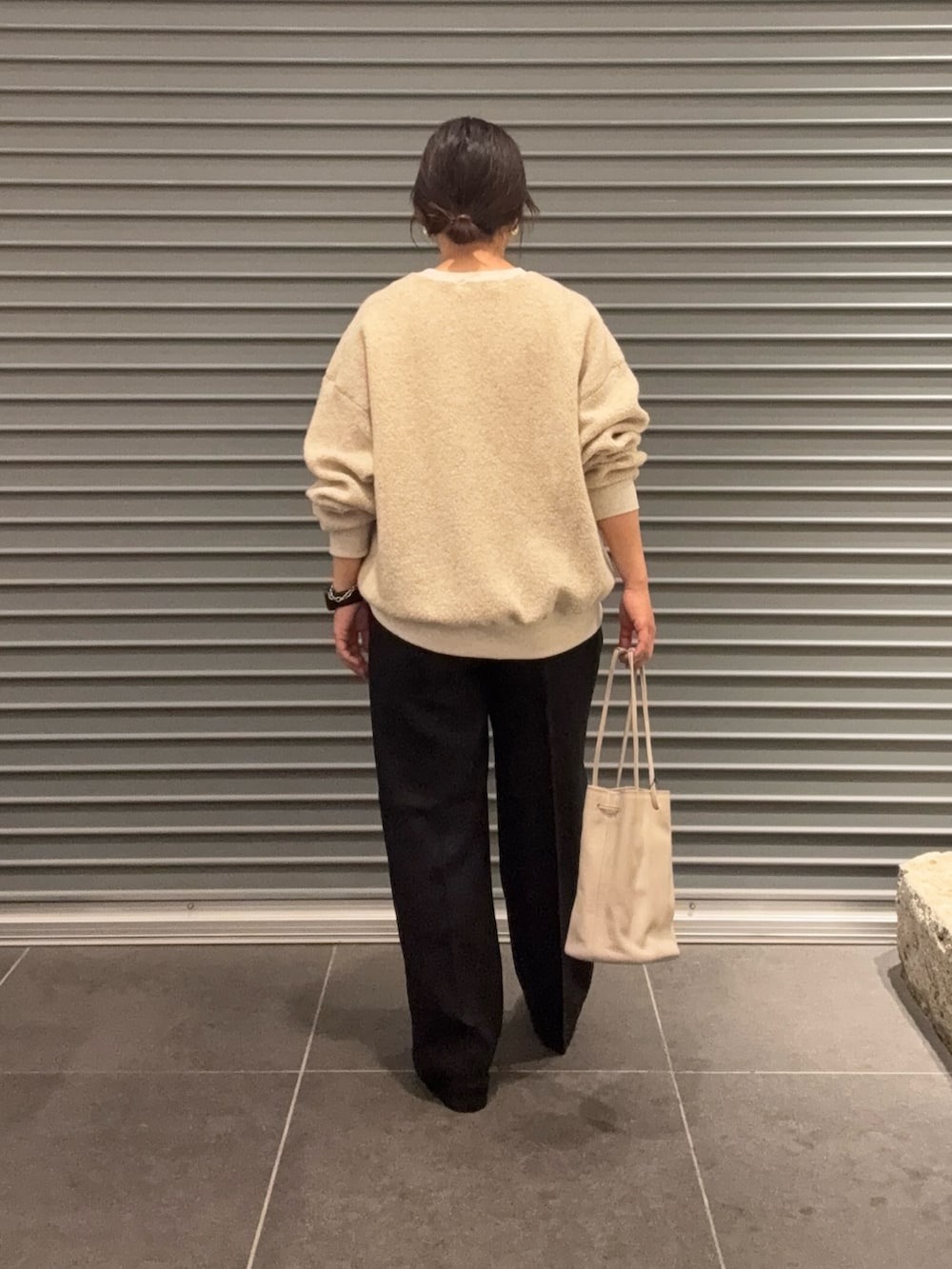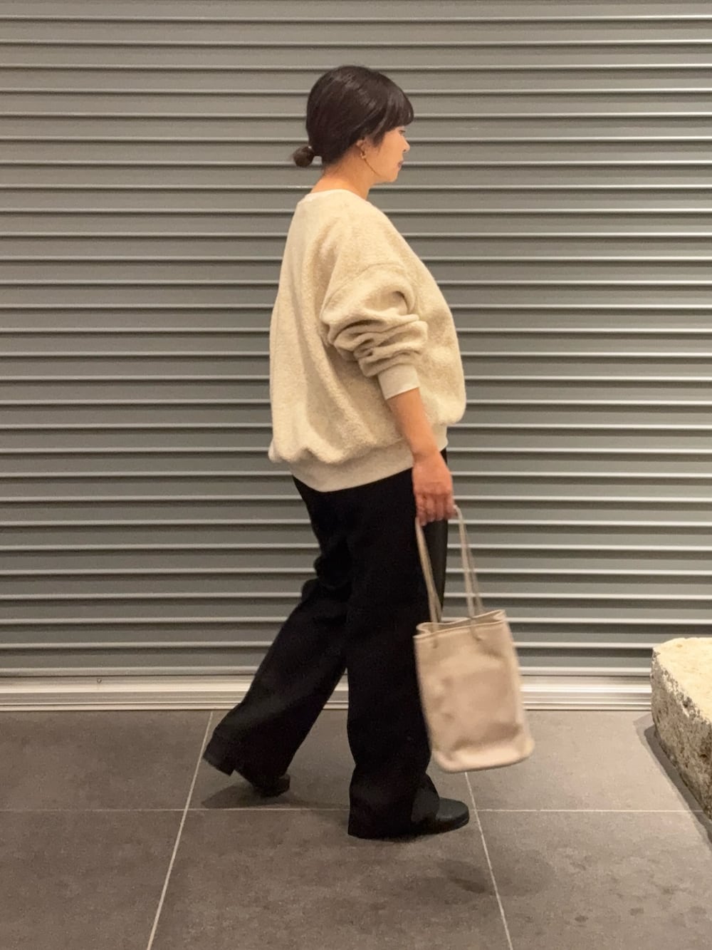 大人のシンプルモノトーンコーデにしました。パンツはウールライクな素材感で洗濯機洗い可能、静電気防止加工と嬉しい機能が。ウエストは総ゴムで、とても楽にゆったり履けてキレイ見えするので、通勤スタイルにもおすすめです。