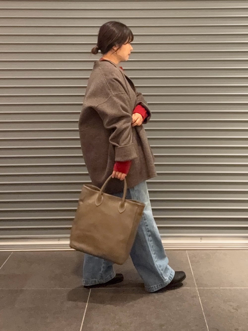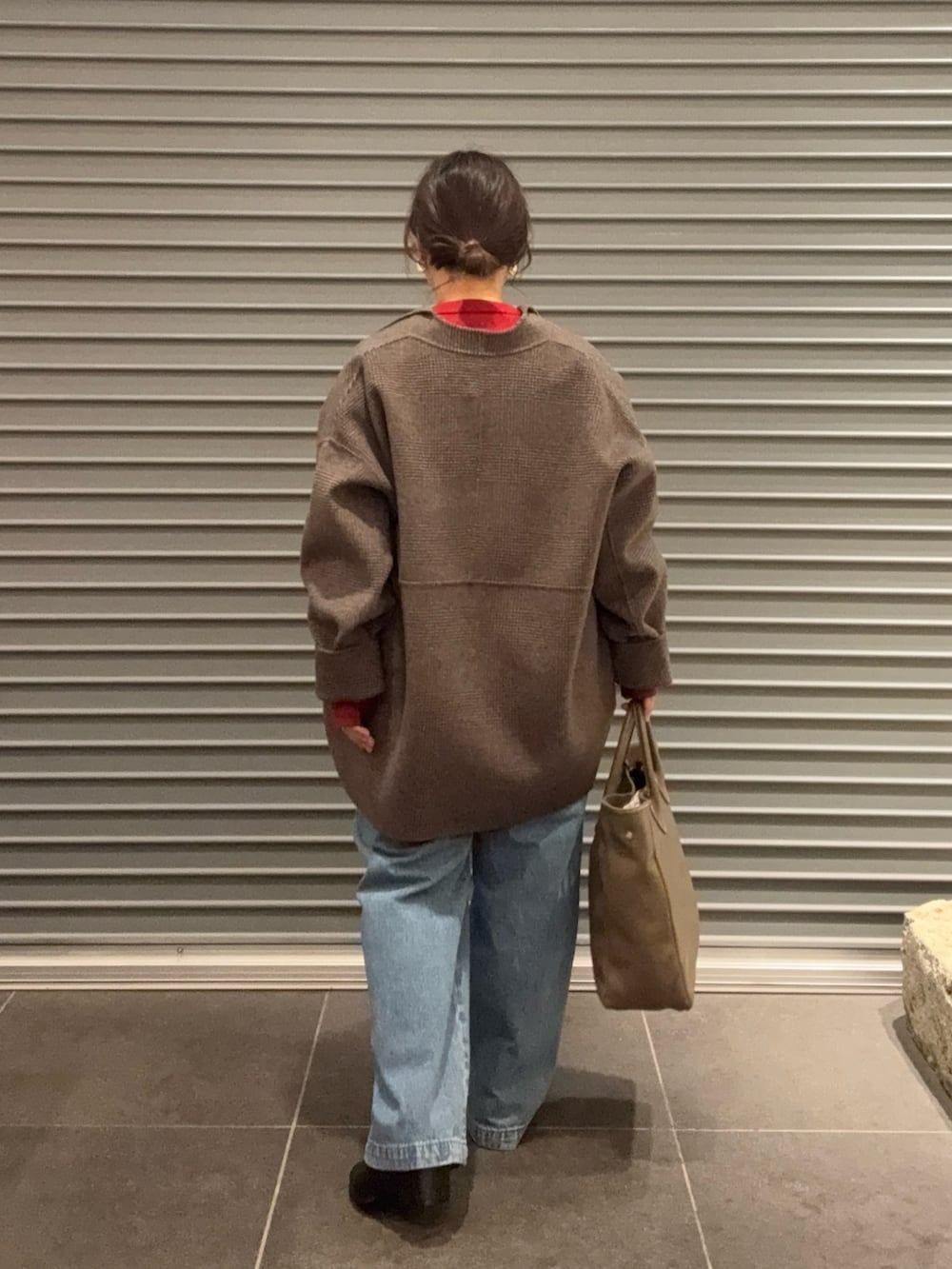 私には袖丈が少し長いので一折りして赤ニットとレイヤードして着てみました。