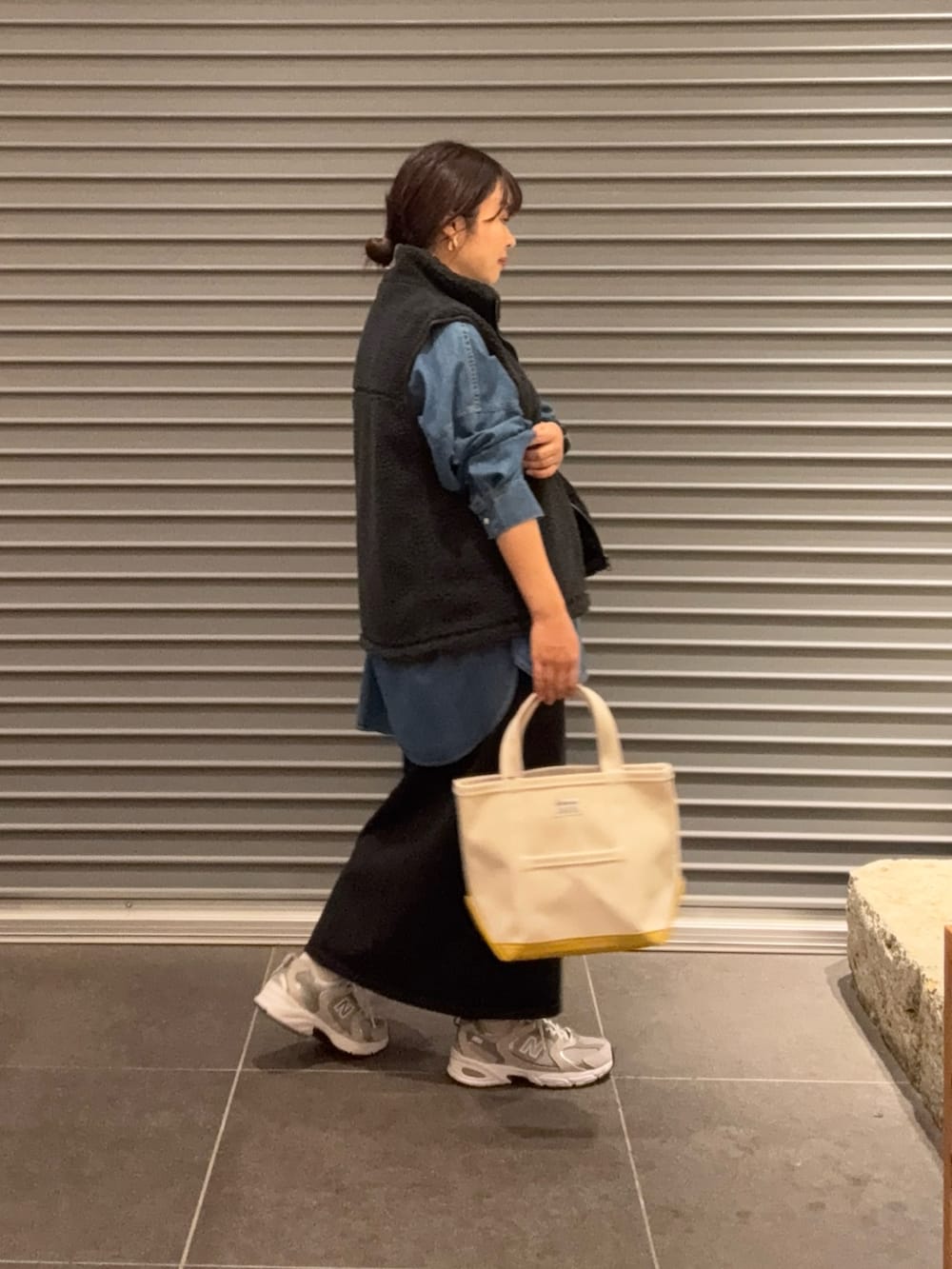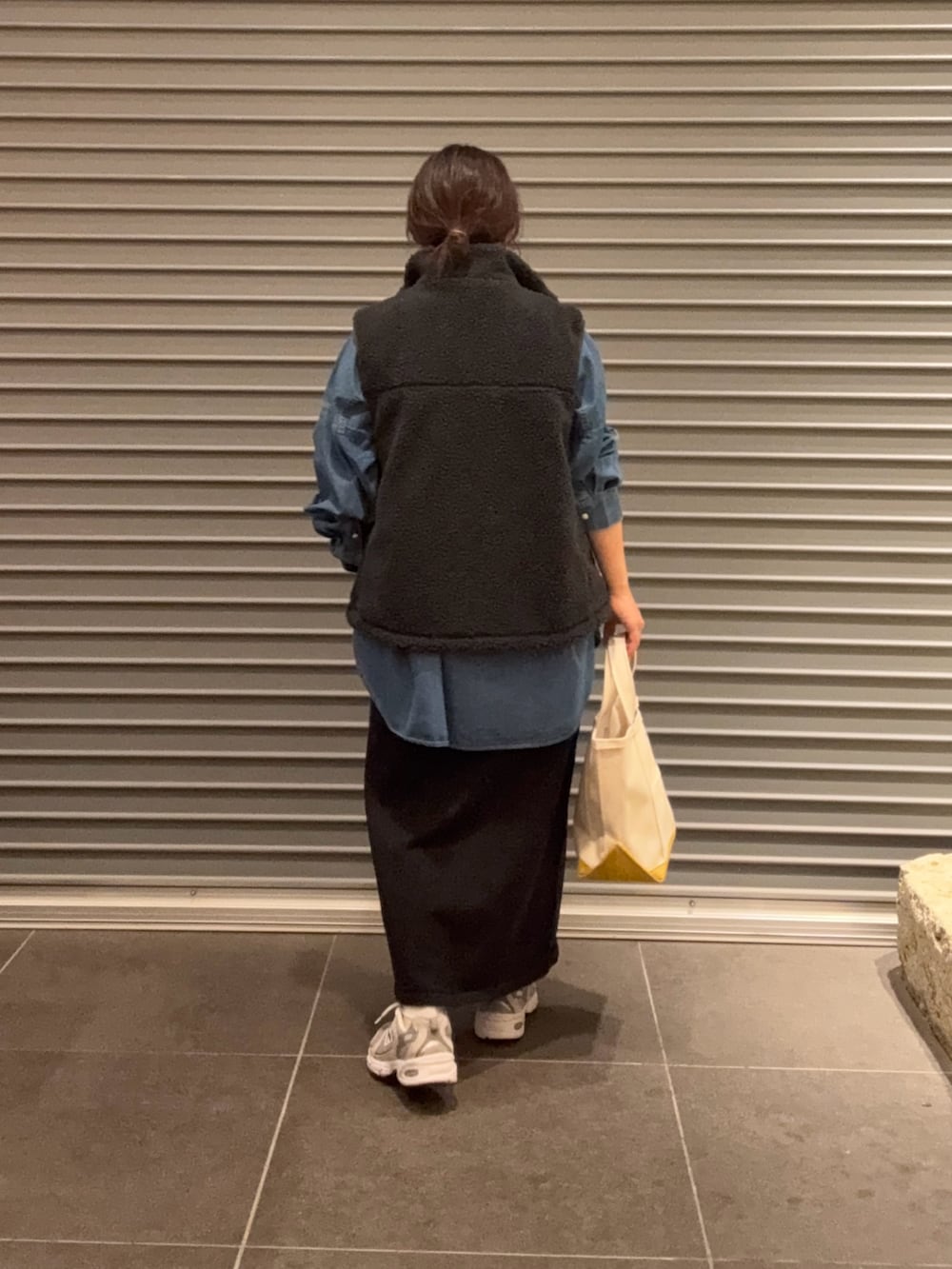 デニムシャツにニットスカート合わせで大人カジュアルコーデにしました。