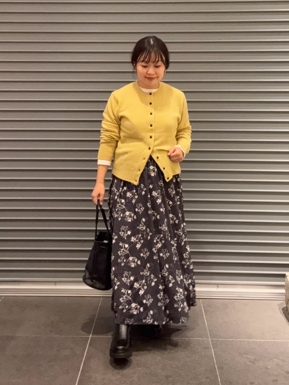 インナーに着たカーディガンはパッと華やぐイエロー可愛いです。マタニティでも下ボタン開けたら大丈夫でした。コンパクトなサイズ感なのでお仕事着にも。