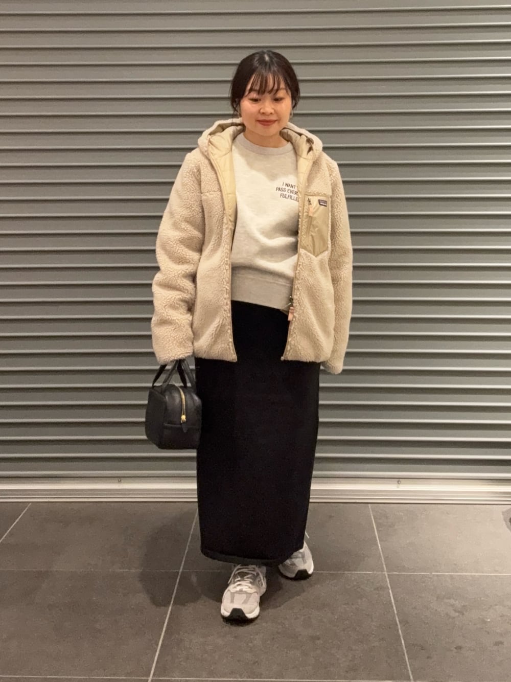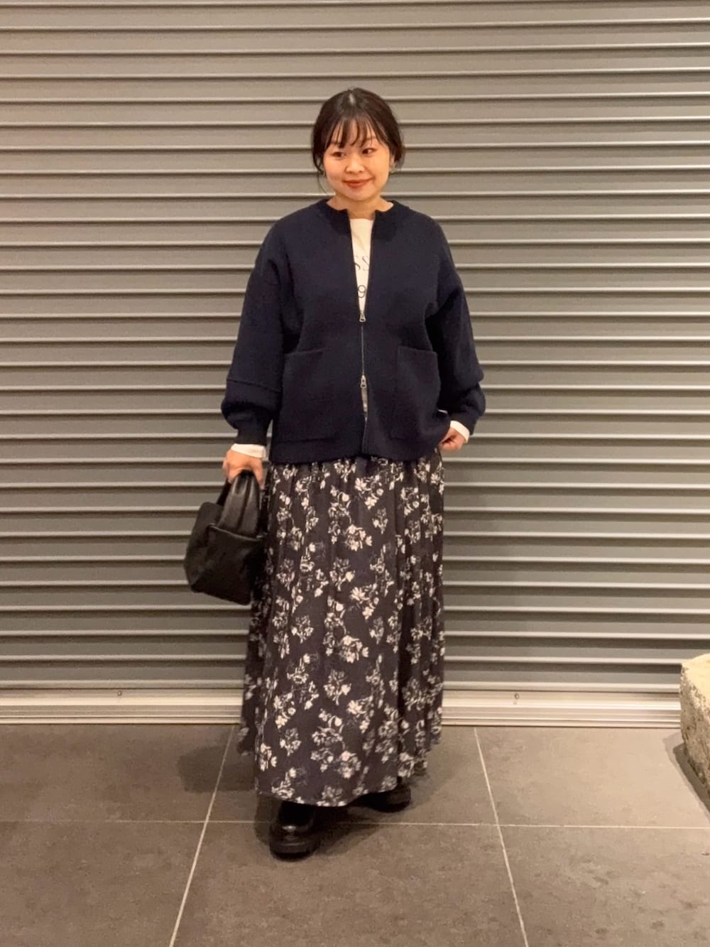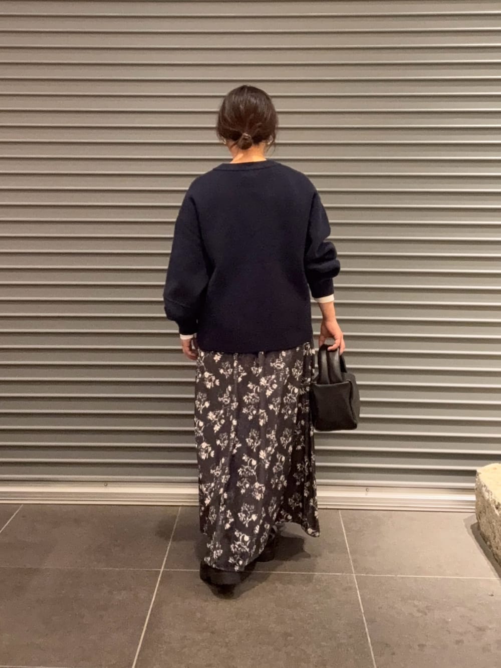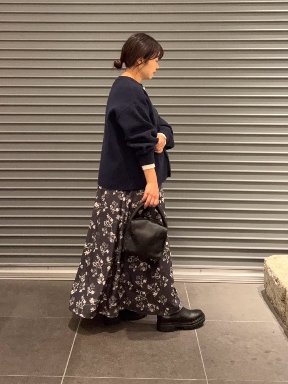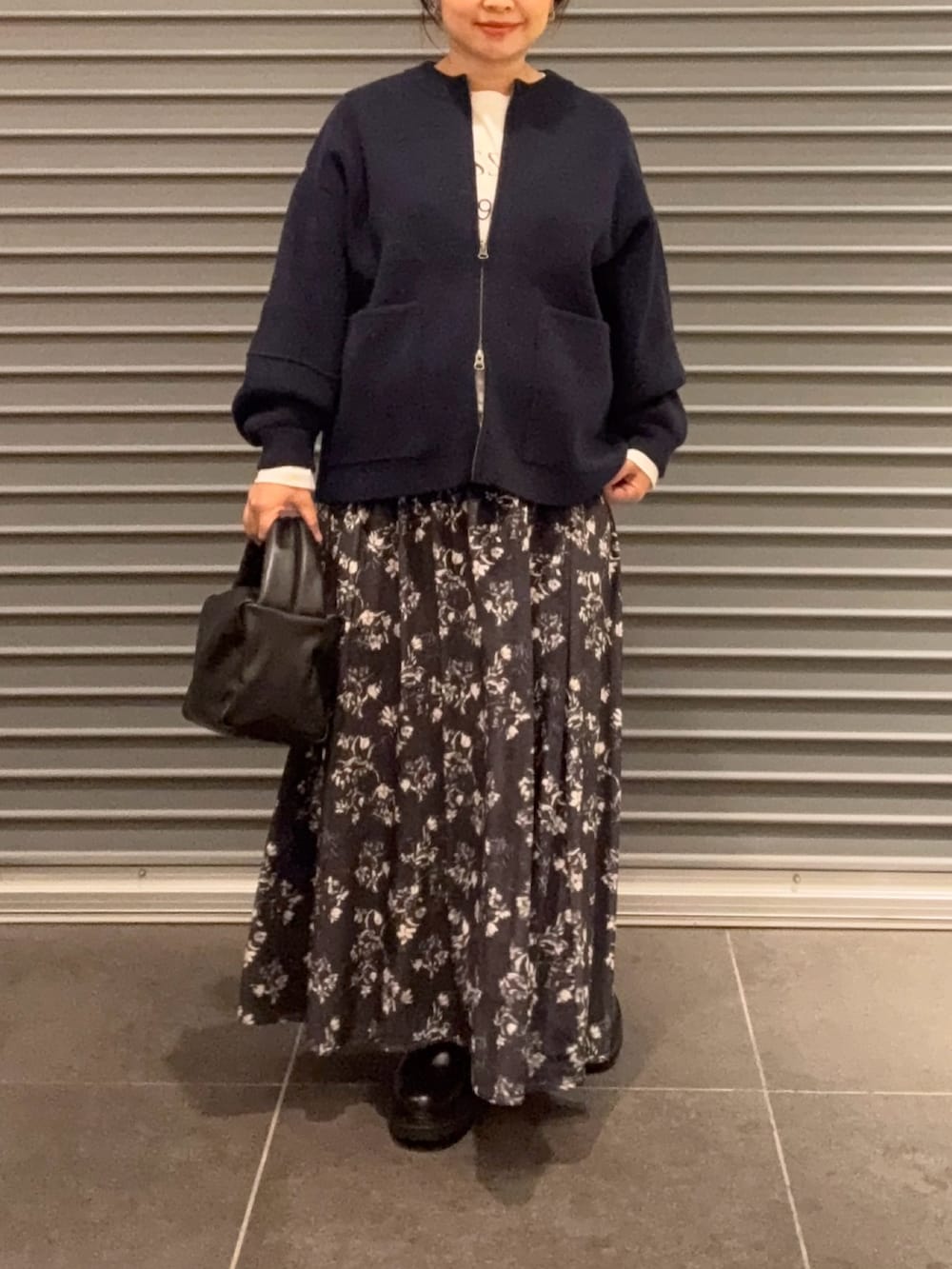 ベロアプリントスカート合わせでワントーンコーデにしました。エネスのブーツはソールの安定感がしっかりあり、サイドゴアなのでとても履きやすいです。