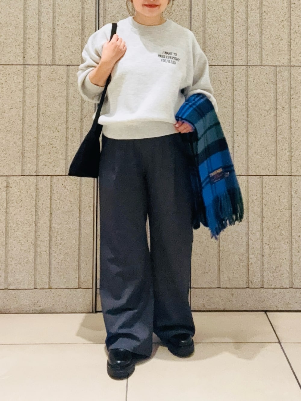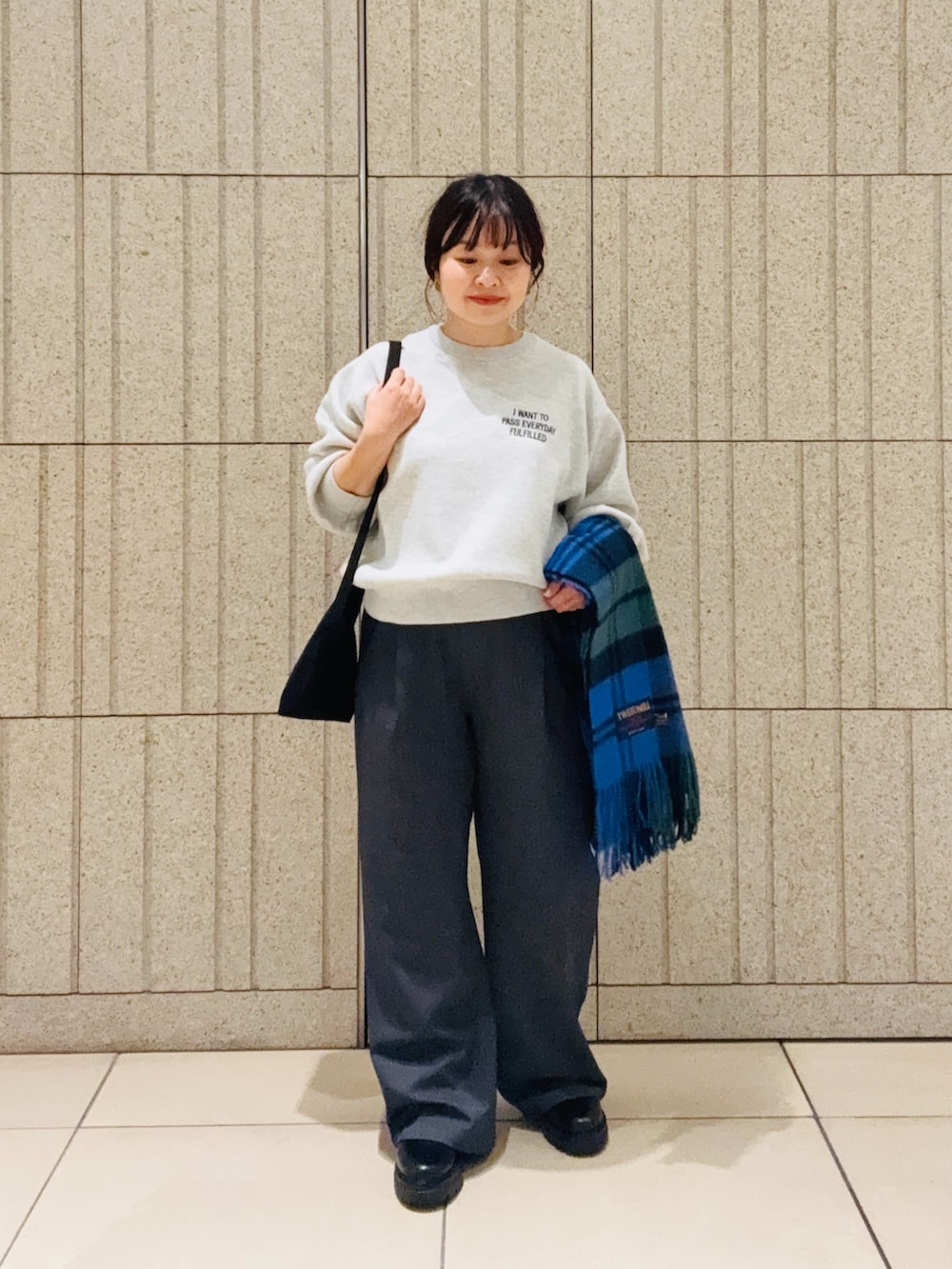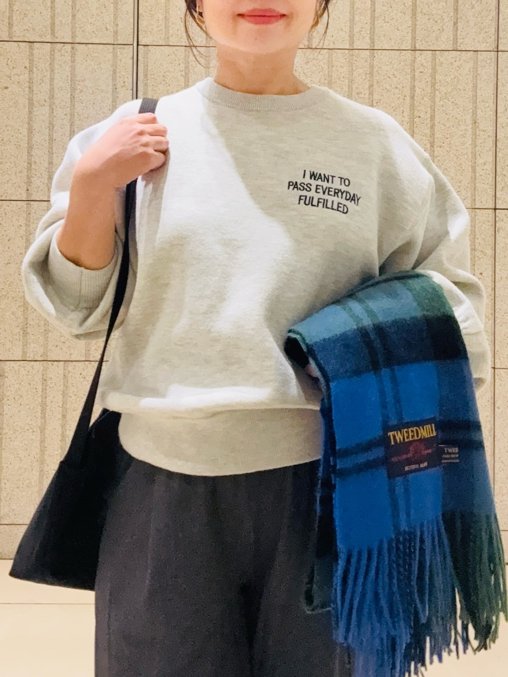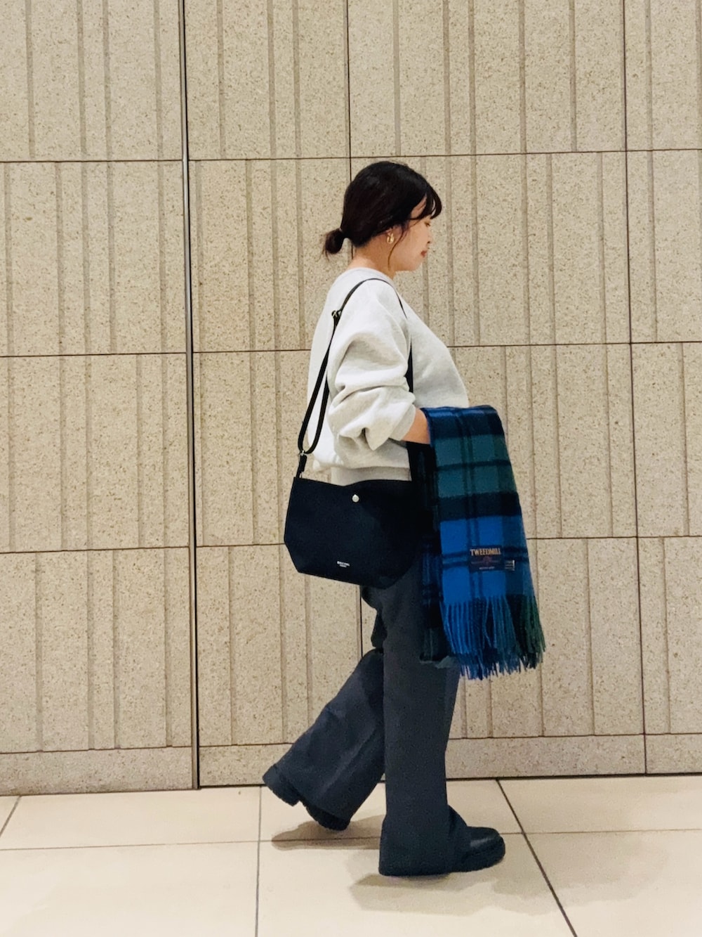 グレーの完声ワイドパンツにTWEED MILLの大判ストールをプラスした秋冬ワントーンコーデにしました。