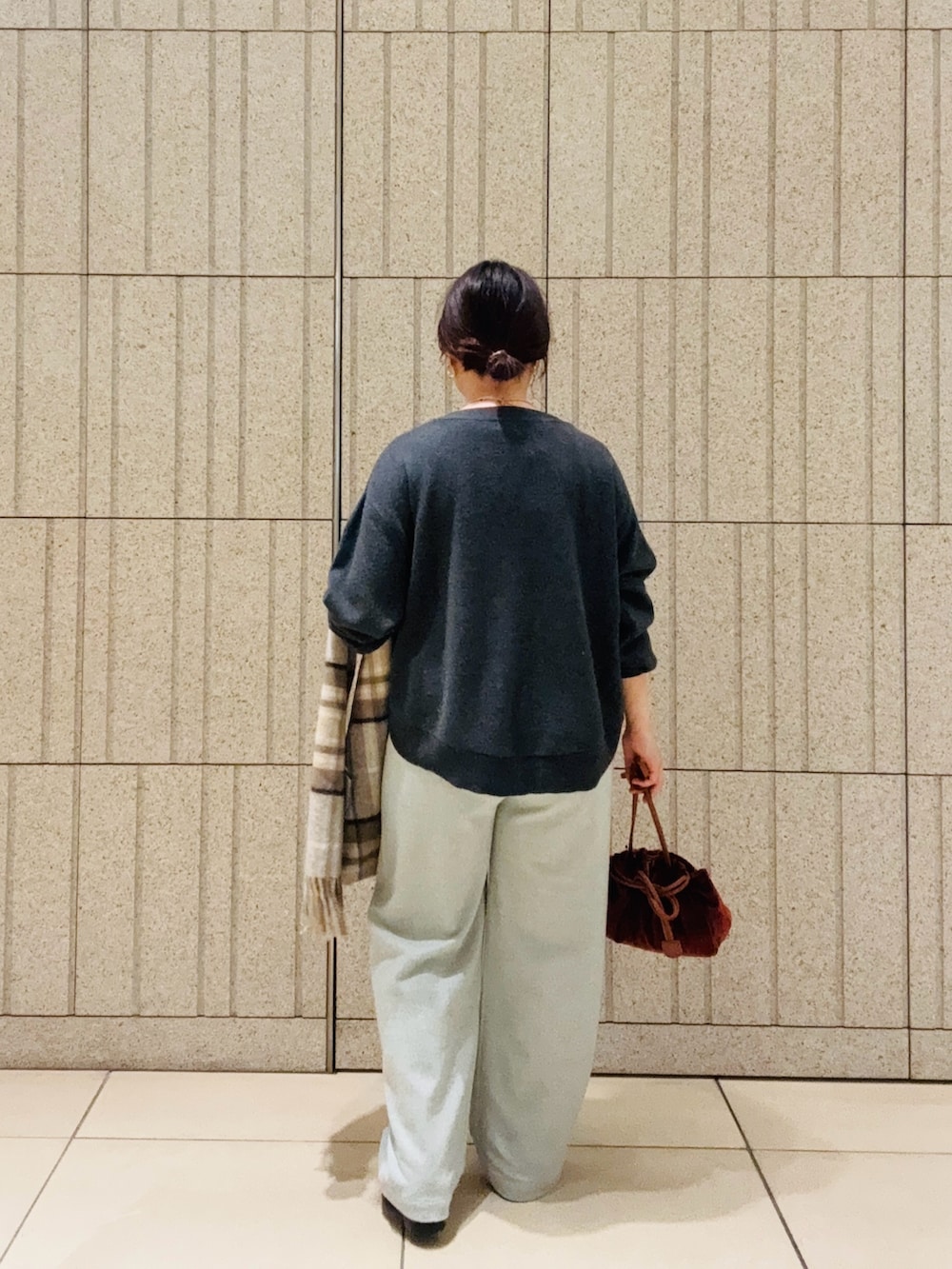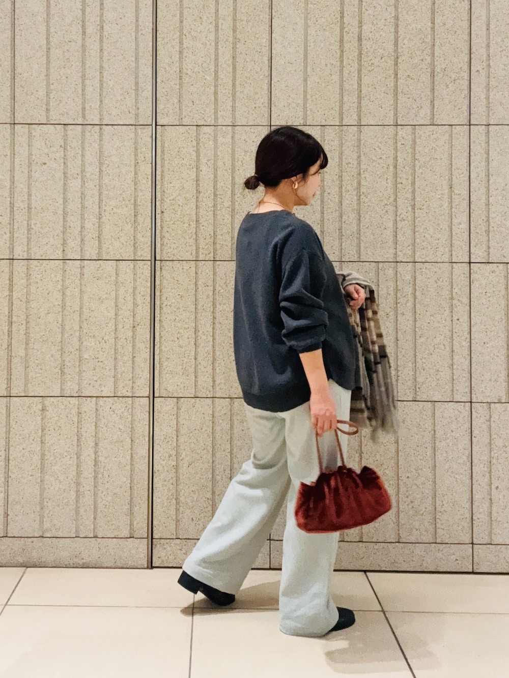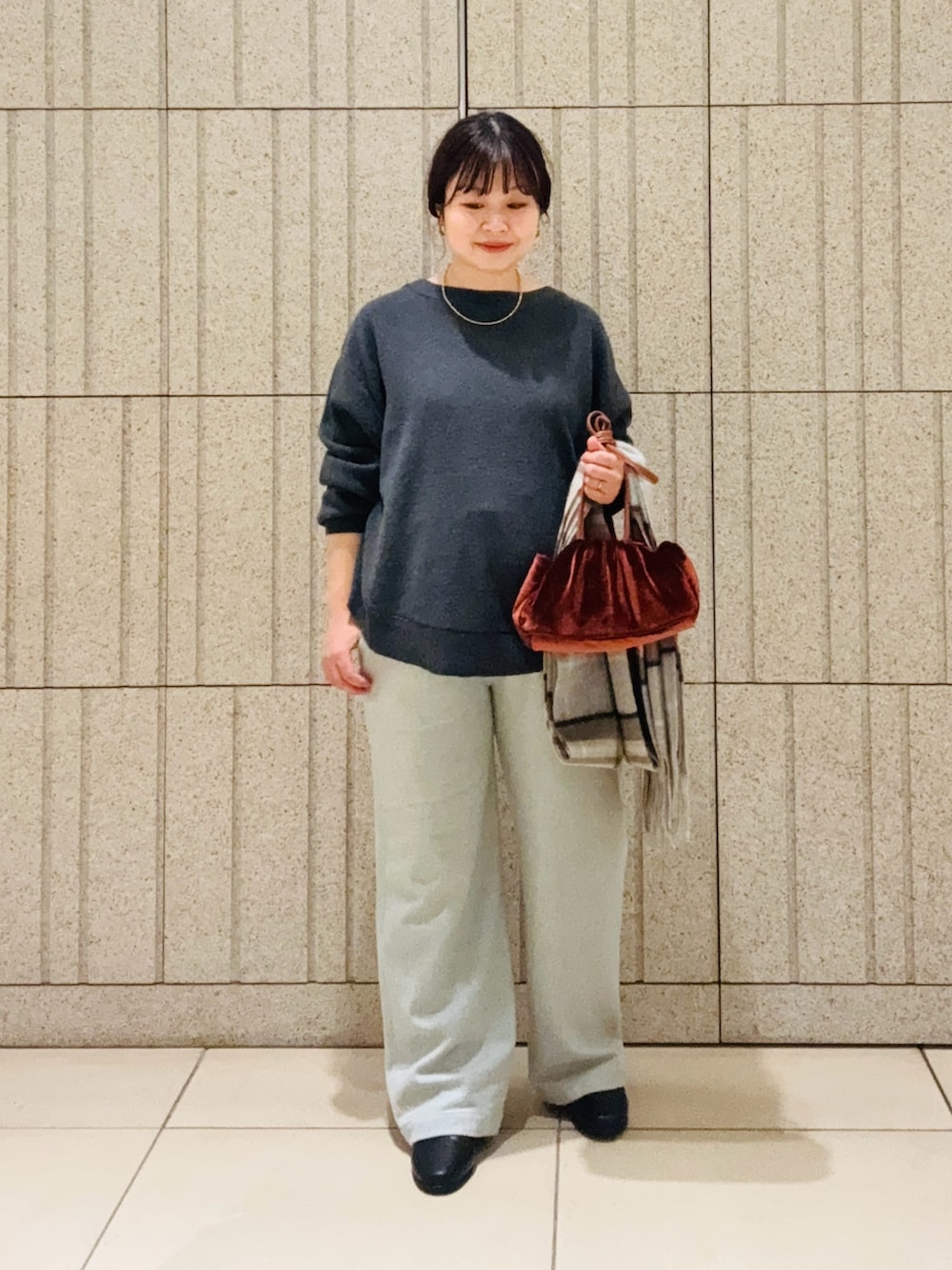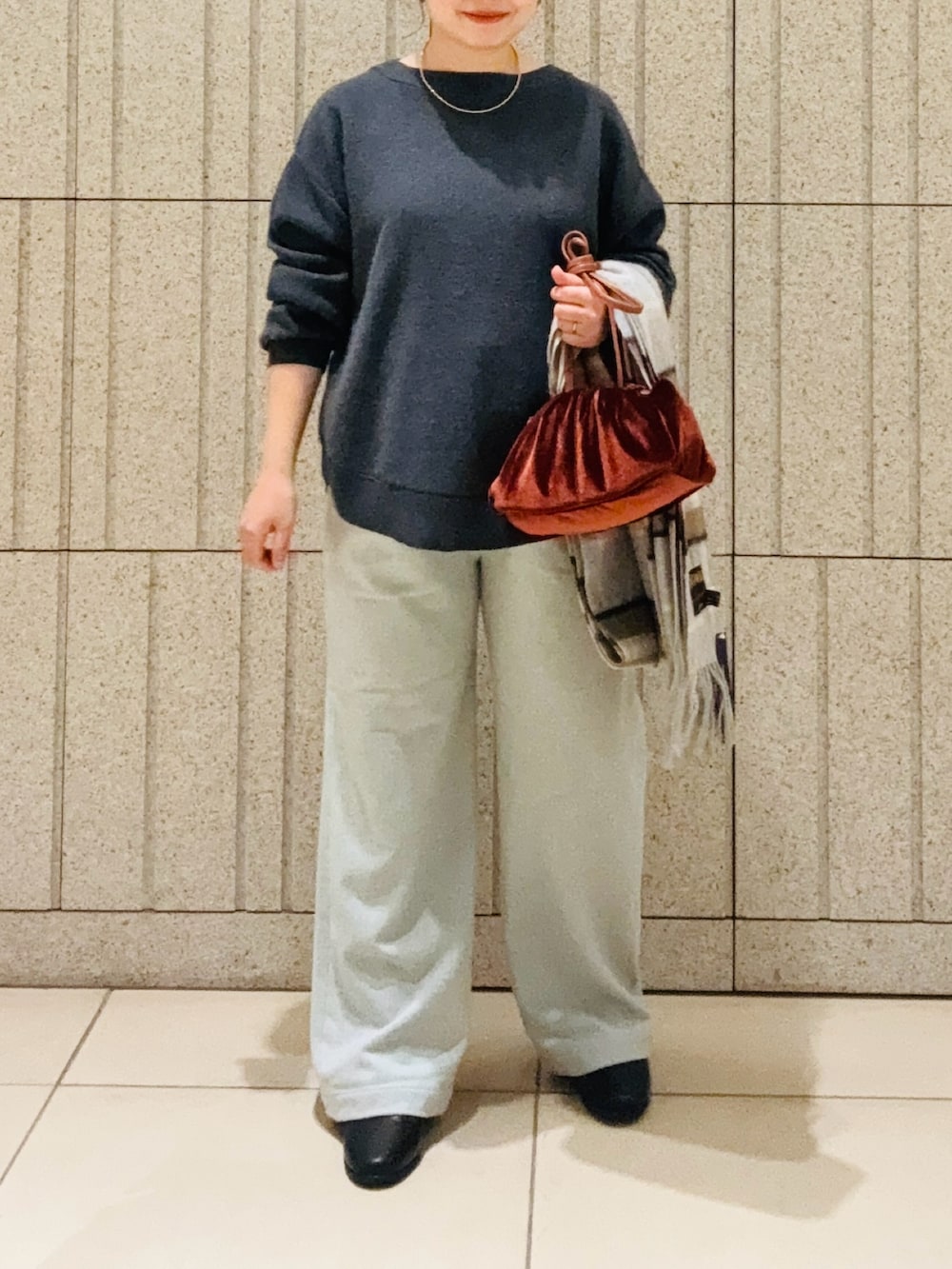 グレーのブラッシュドパンツと合わせてワントーンコーデにしました。