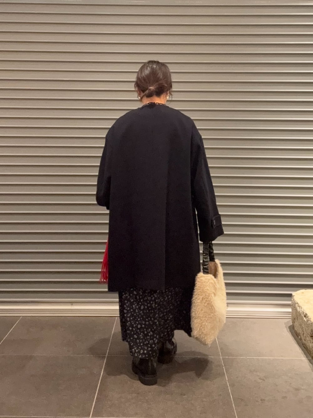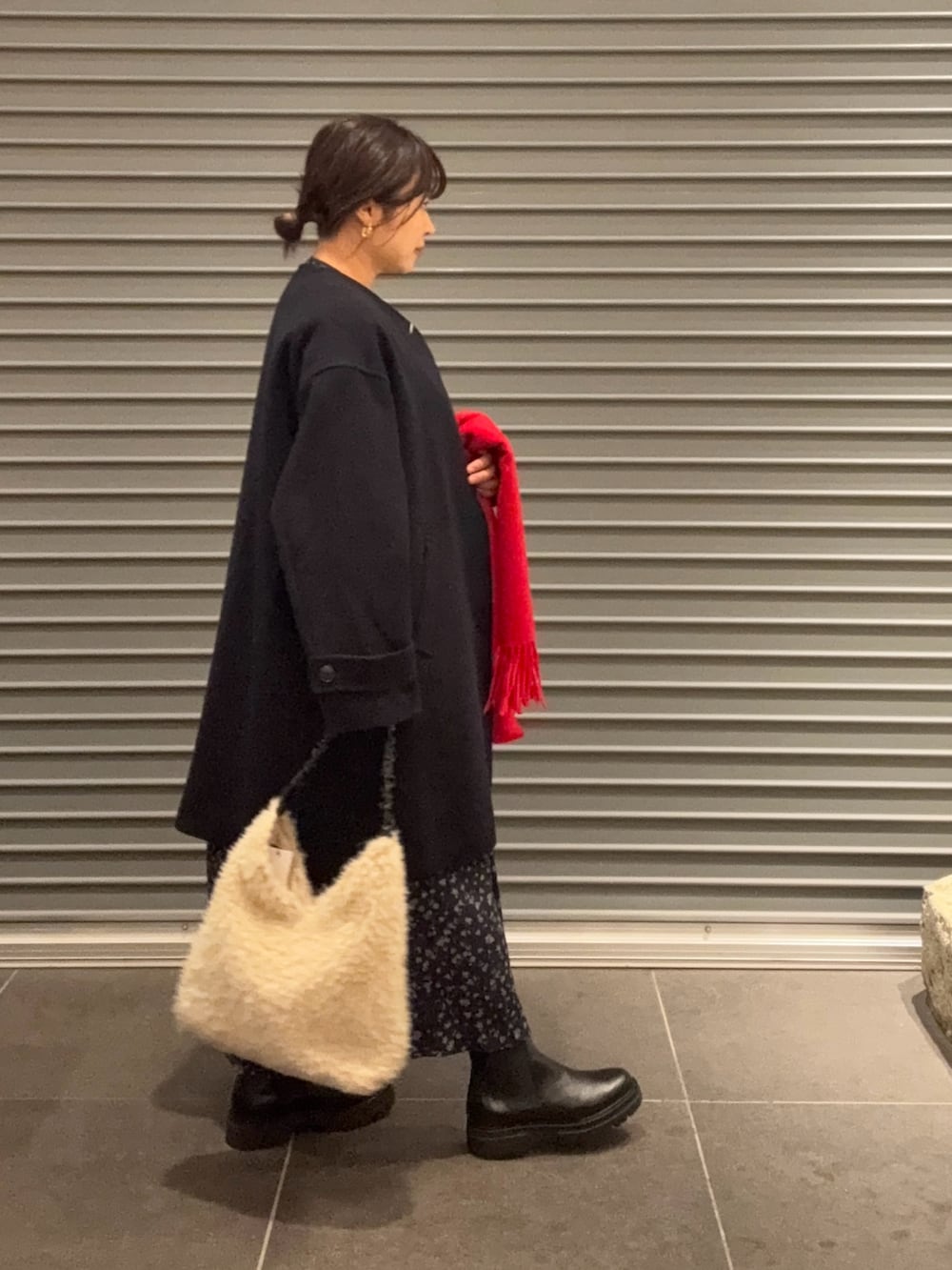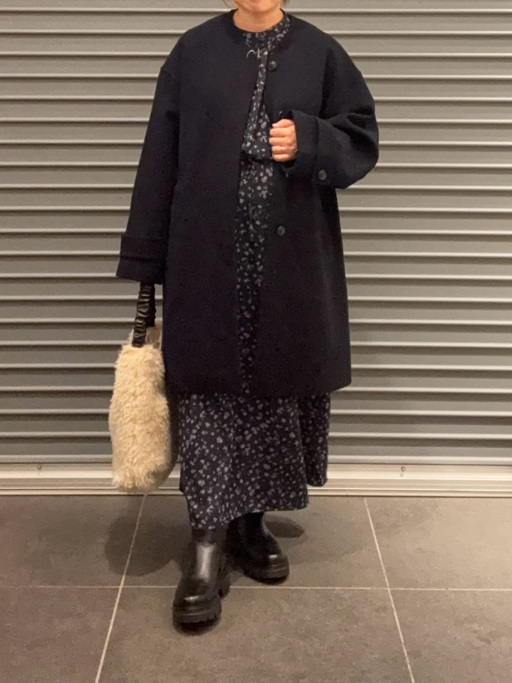 フラワープリントワンピースにボア小物をプラスして、クリスマスや年末年始のお出かけコーデにしてみました。