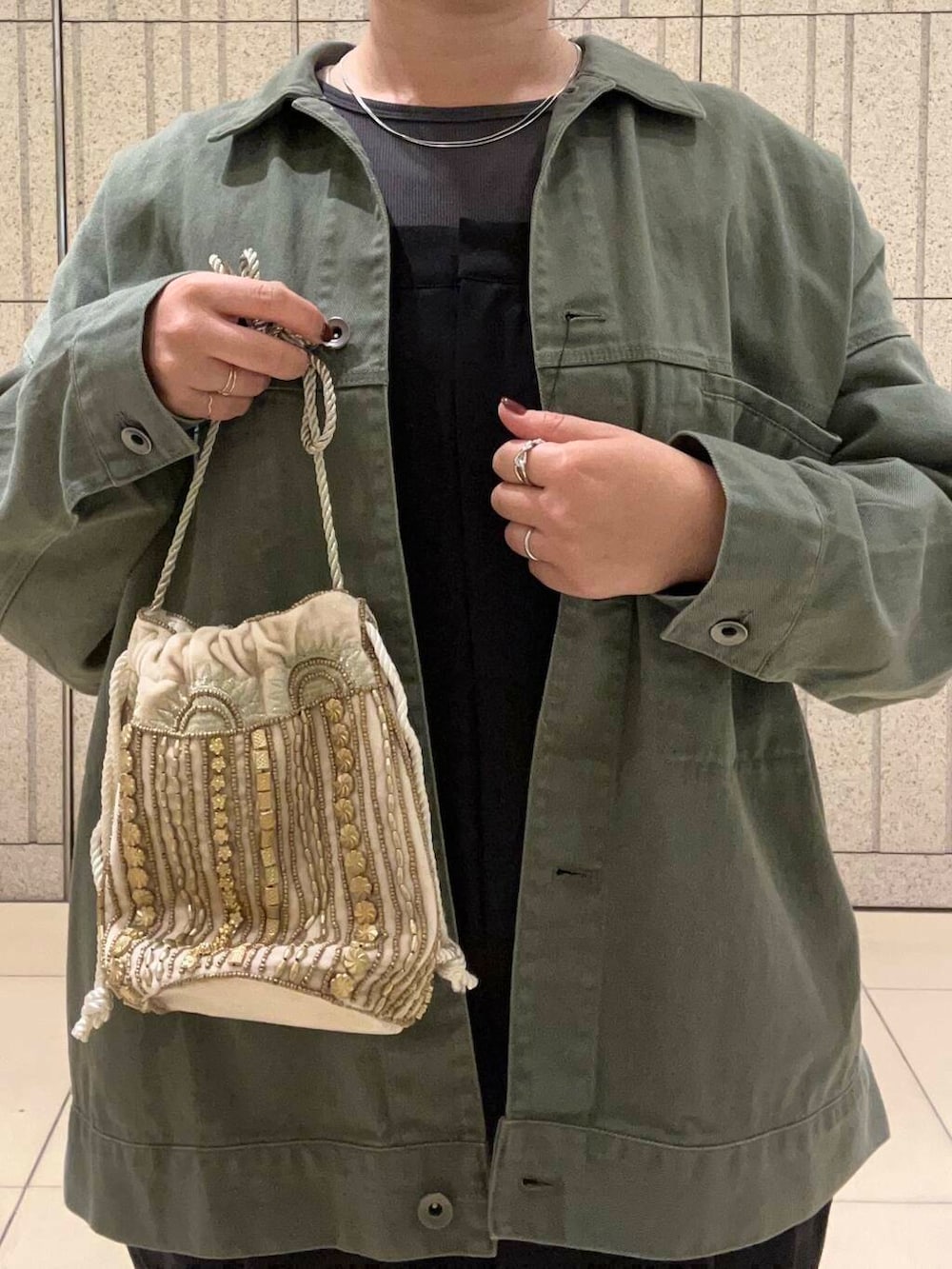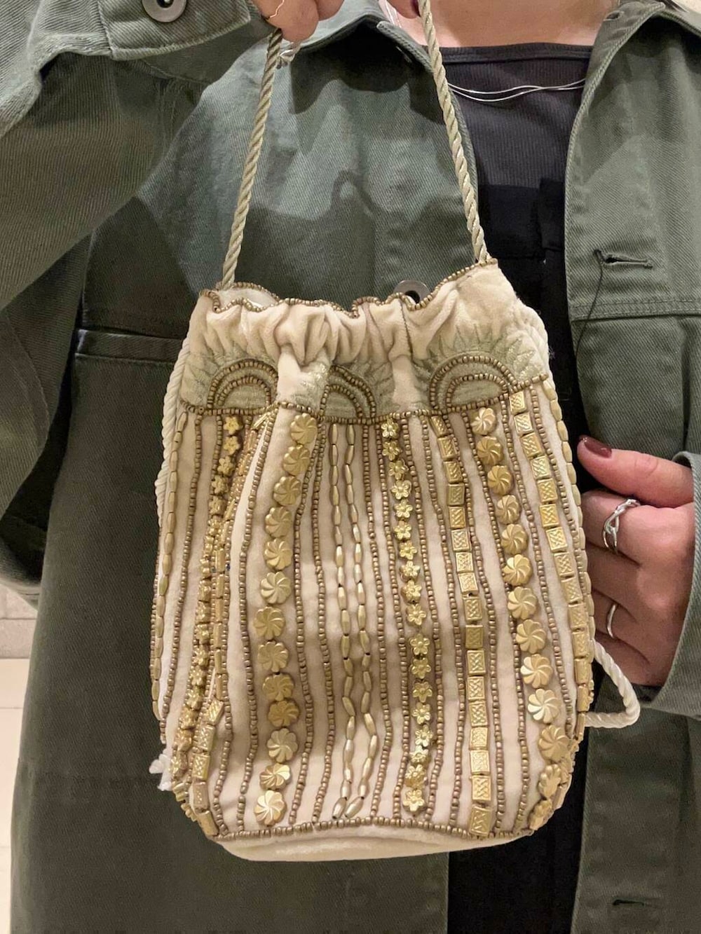 インドビーズ巾着バックは、シンプルなコーディネートのポイントに!小ぶりながら、マチあります。