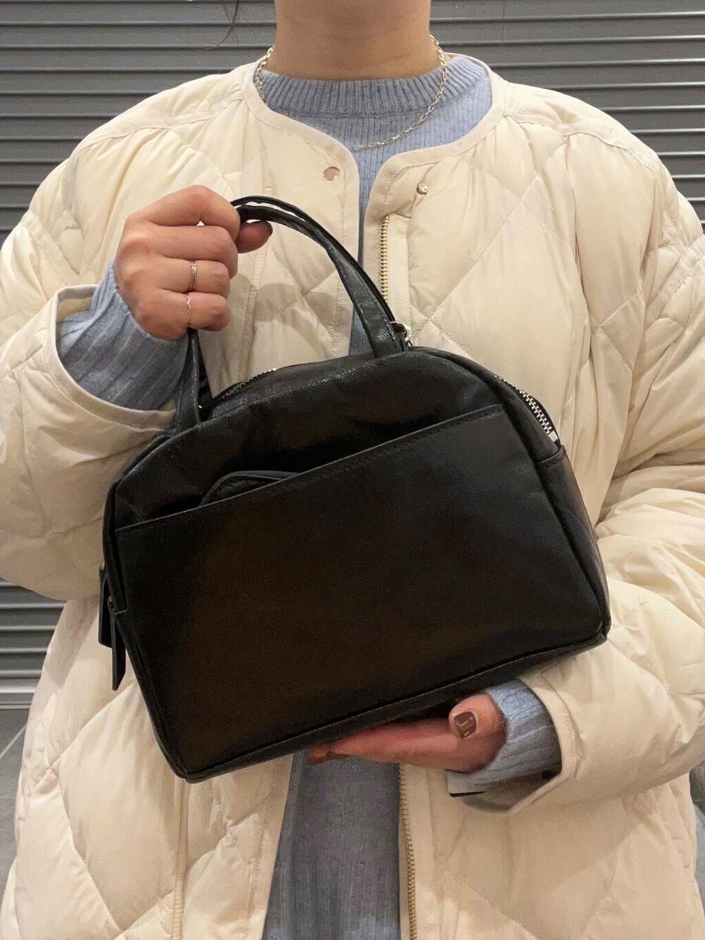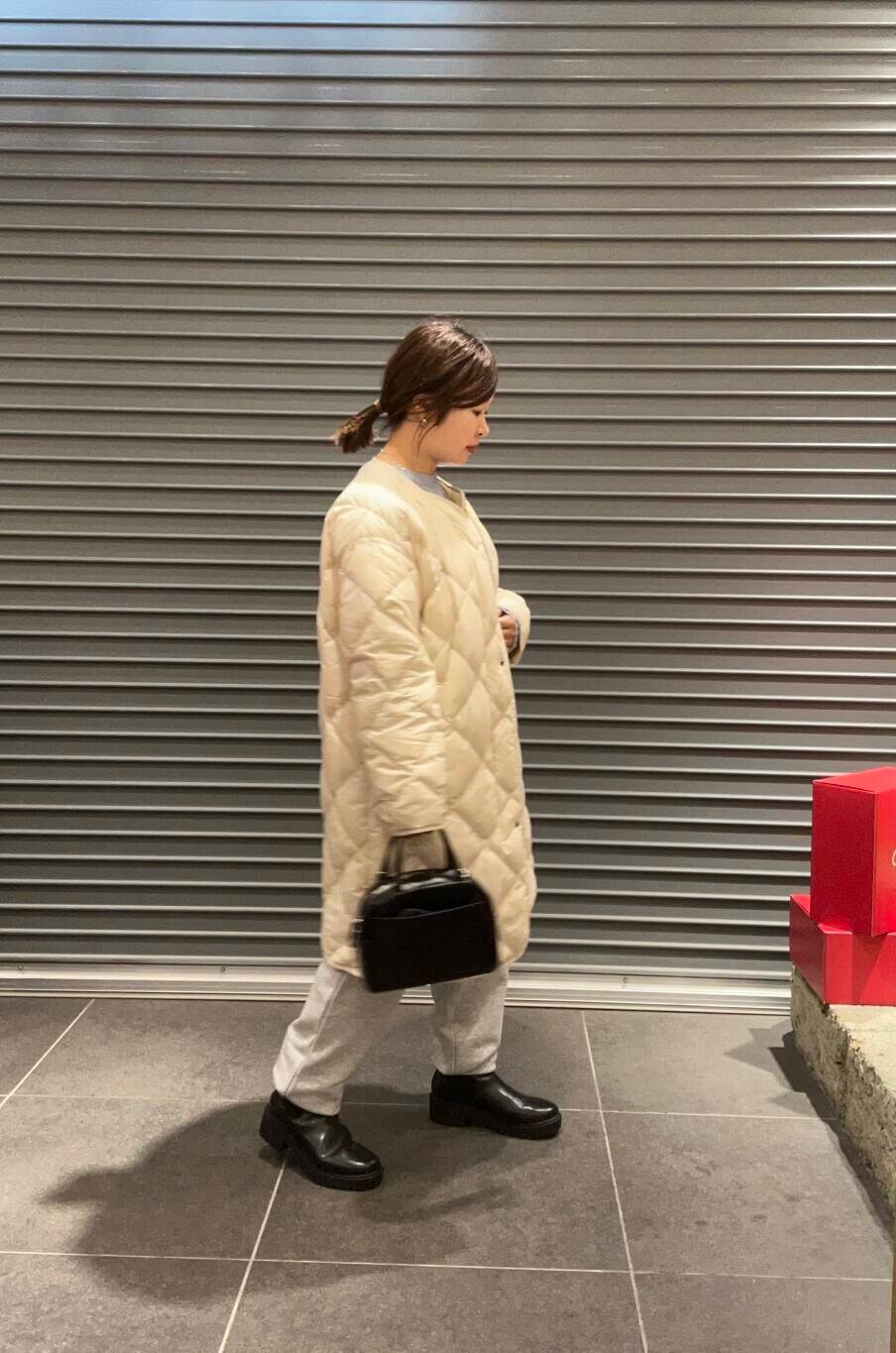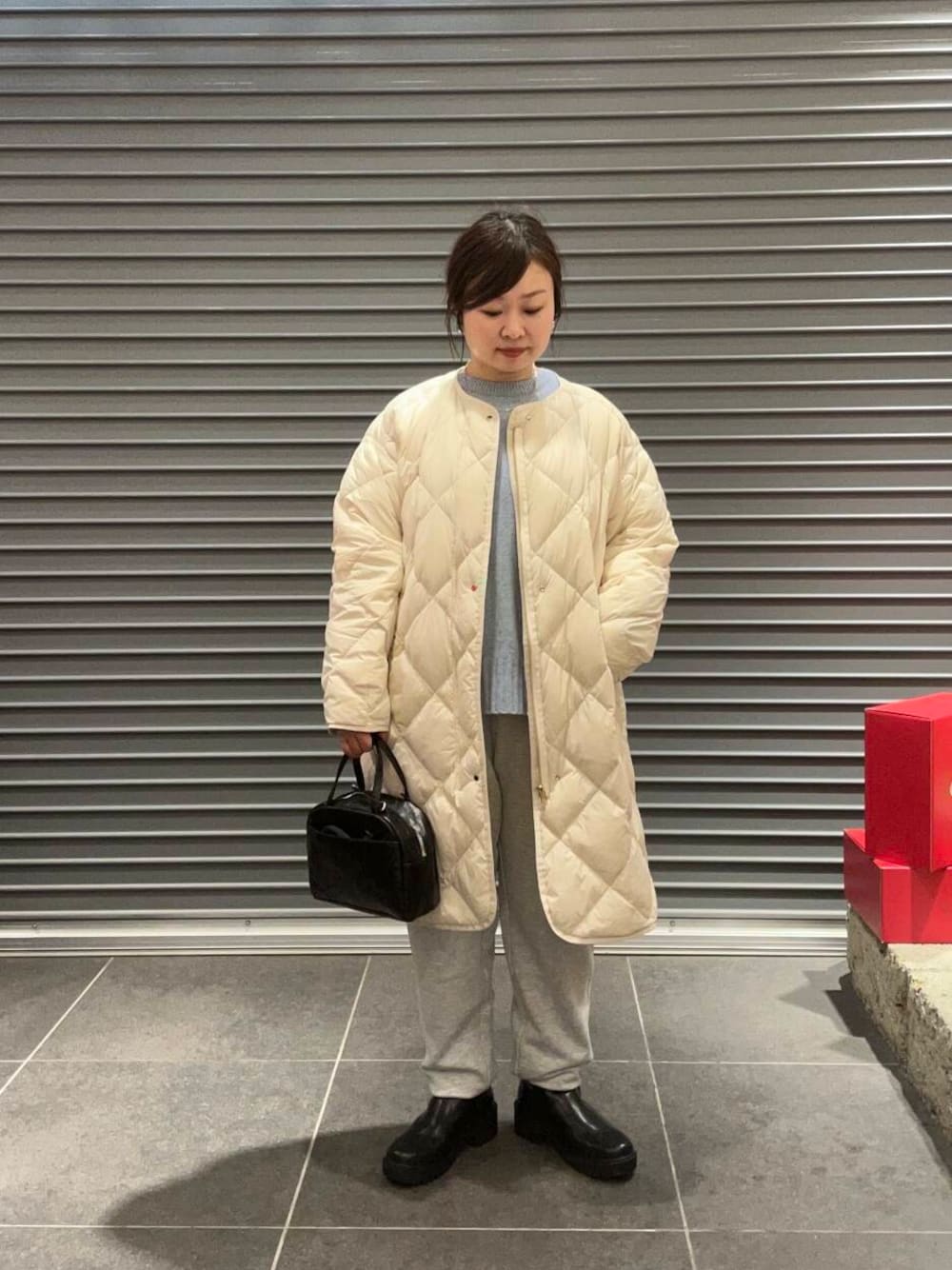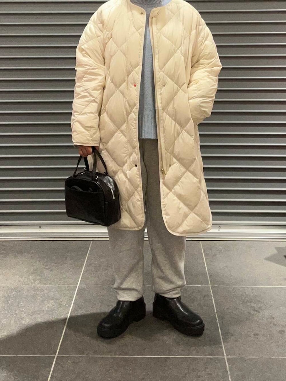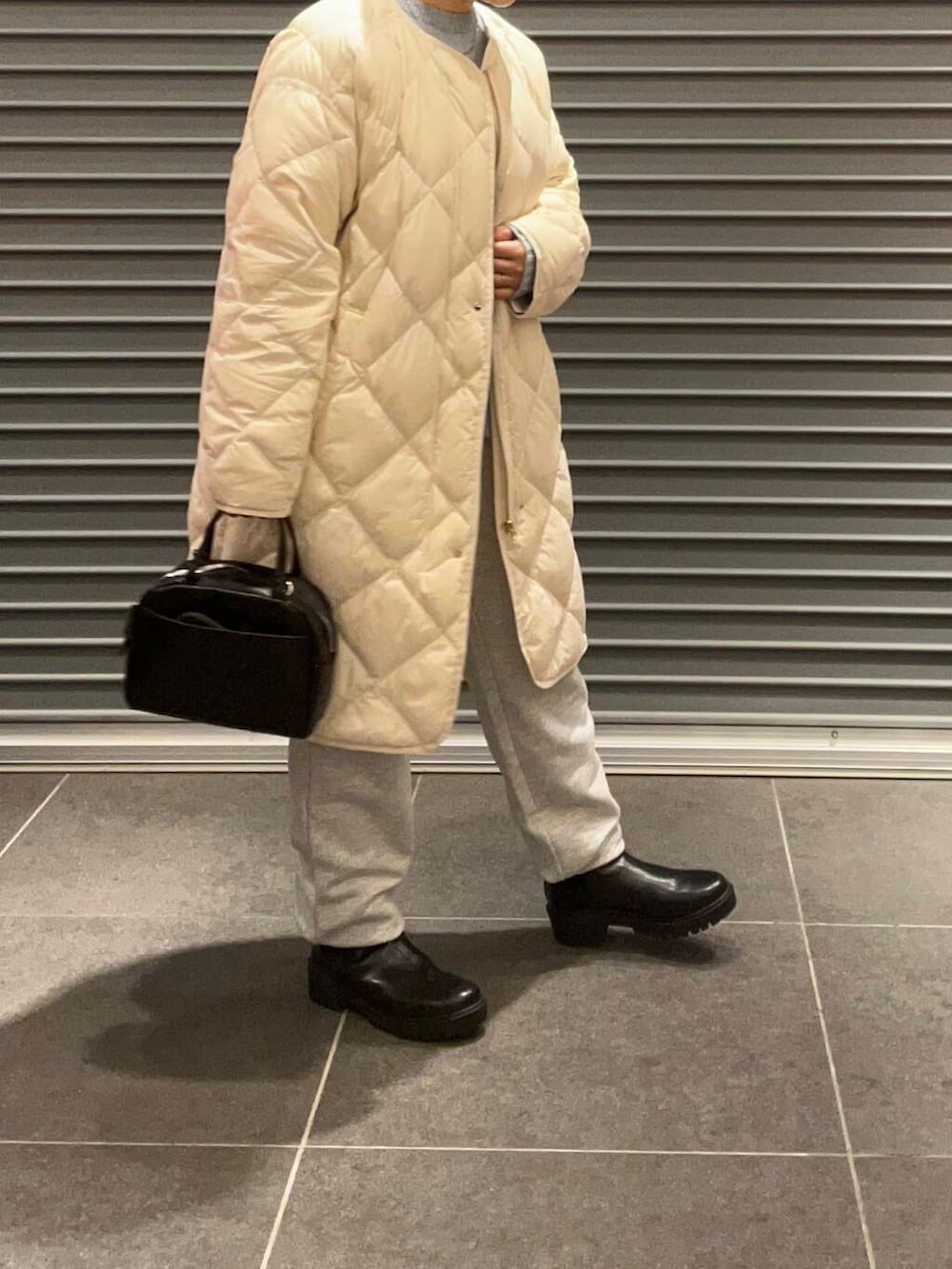 ボトムスはスウェットでラフに!ライトブルーニット×ホワイトダウンで軽さを出しました🩵全体的に柔らかいカラーなので、小物のブーツ、バックはブラックでしめました🐦⬛