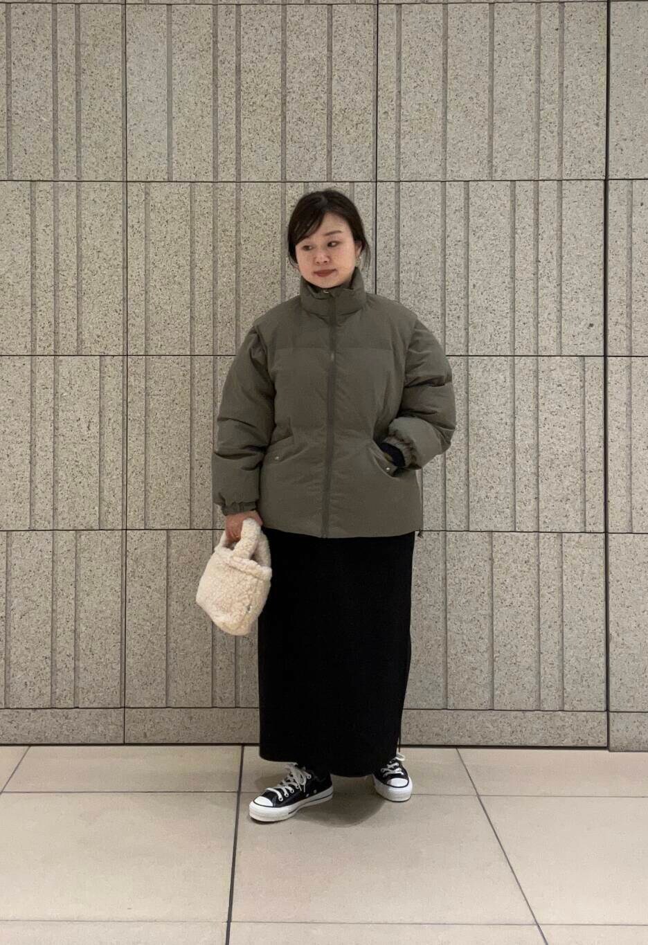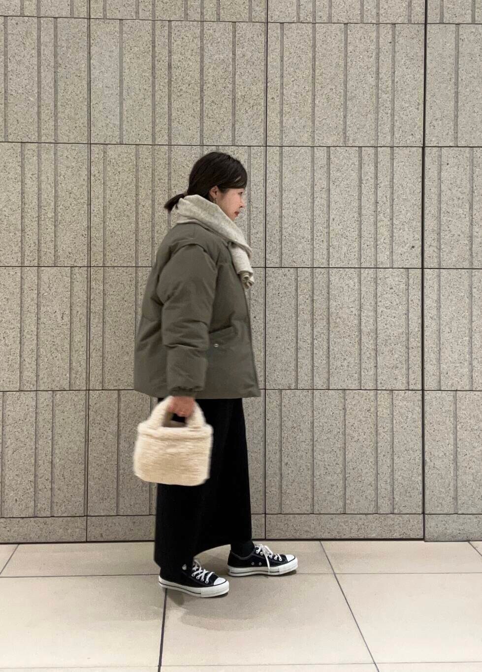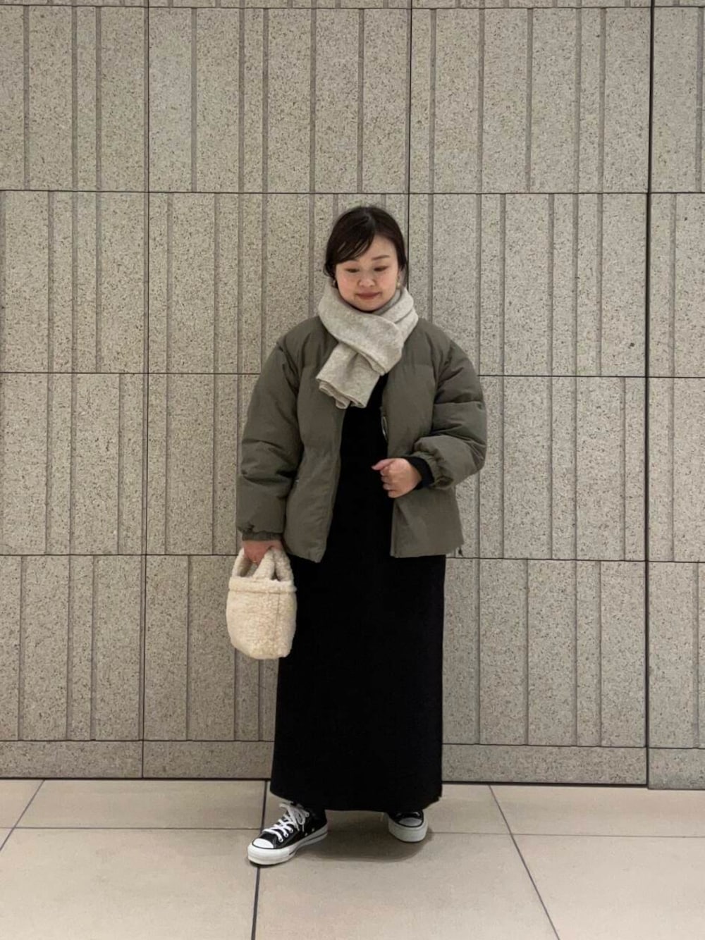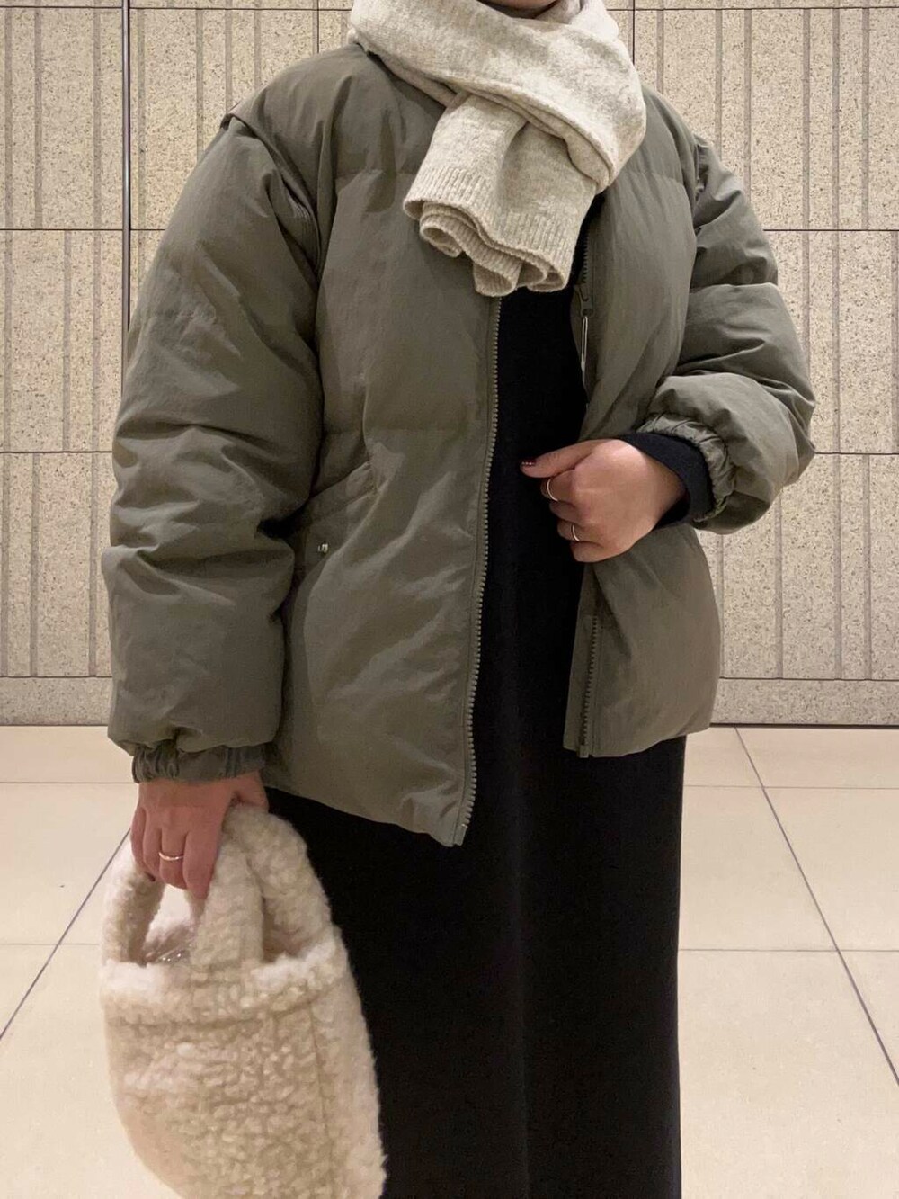 スタンドカラーで首周りもすっきりしているデザインなので、寒い日はストール合わせも🧣