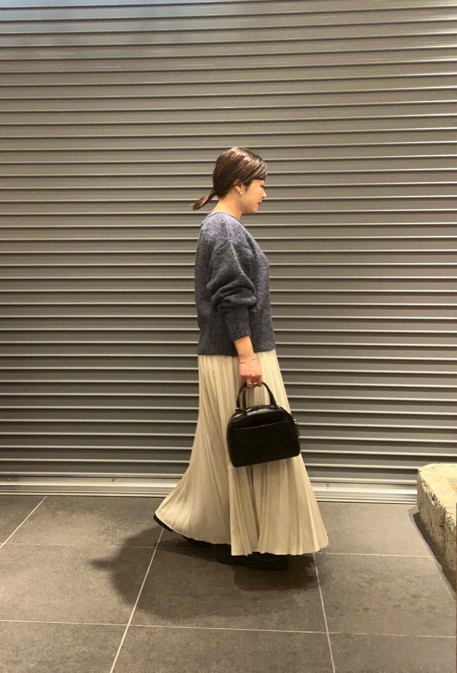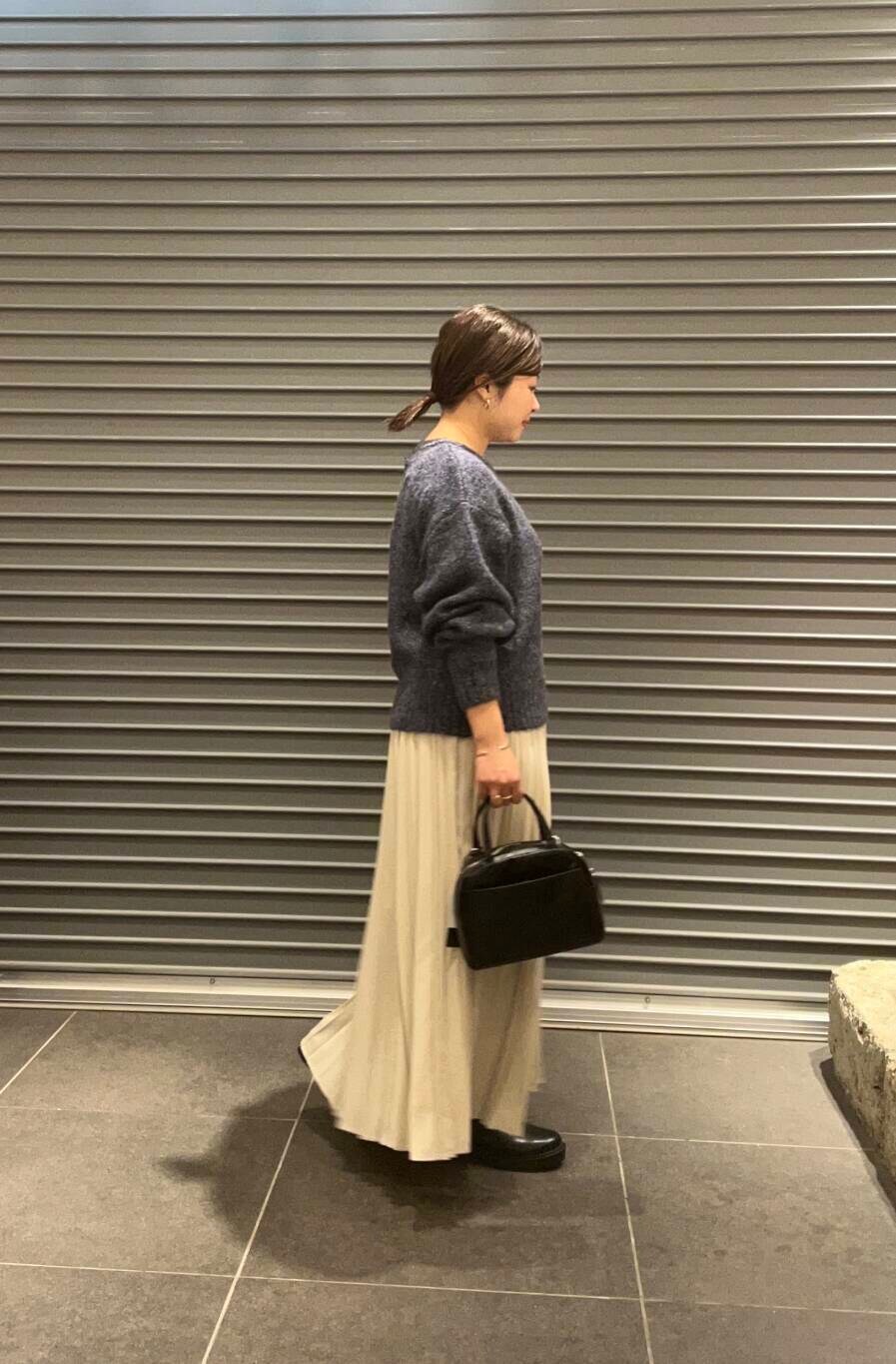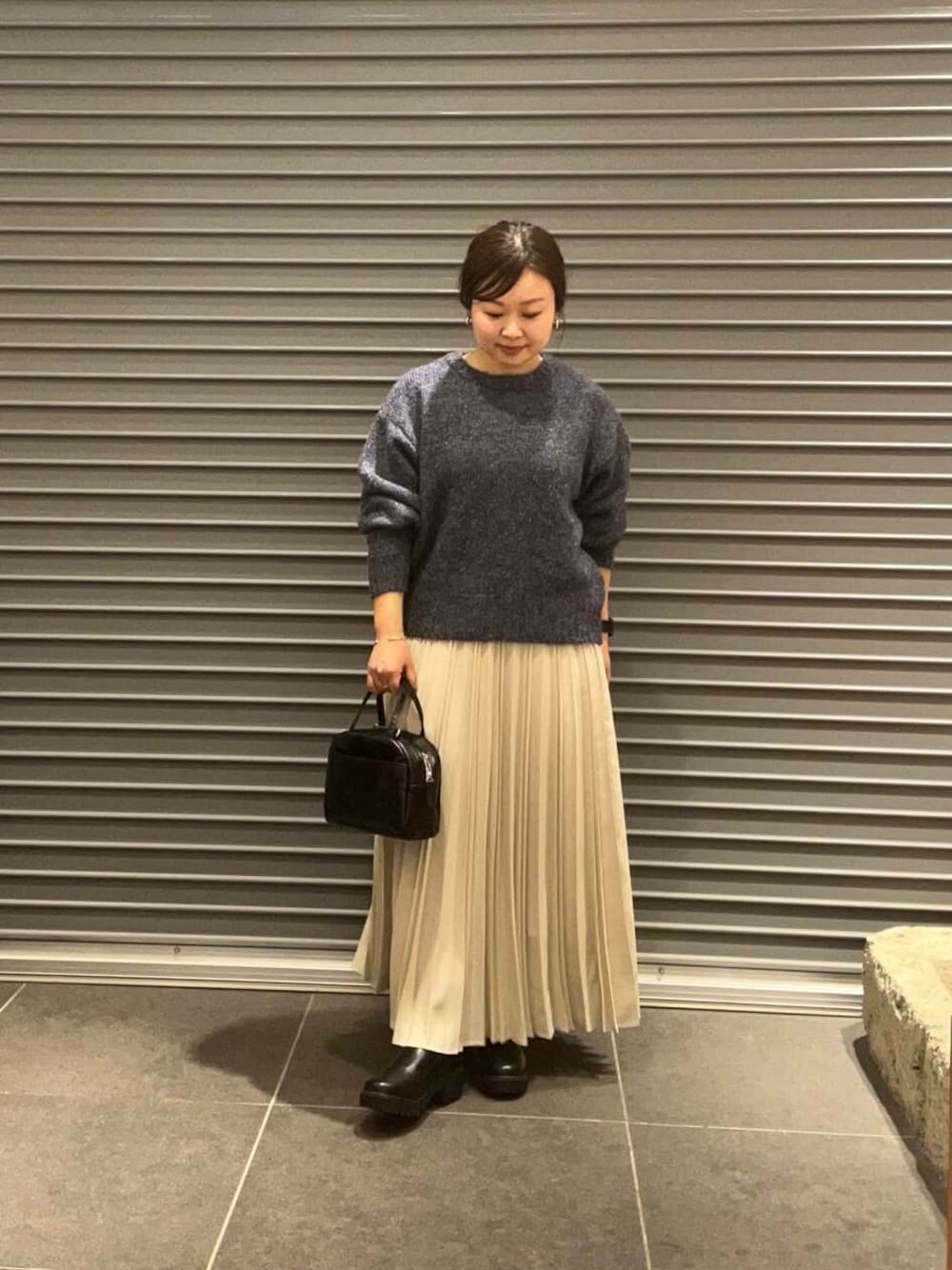 店頭でも人気のラメニットに、プリーツスカートで少しキレイめにしました。