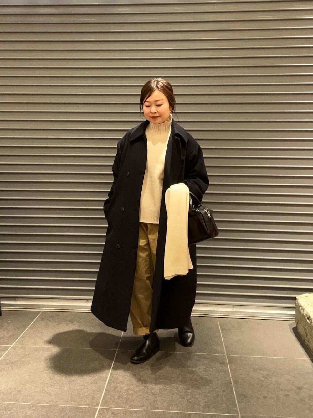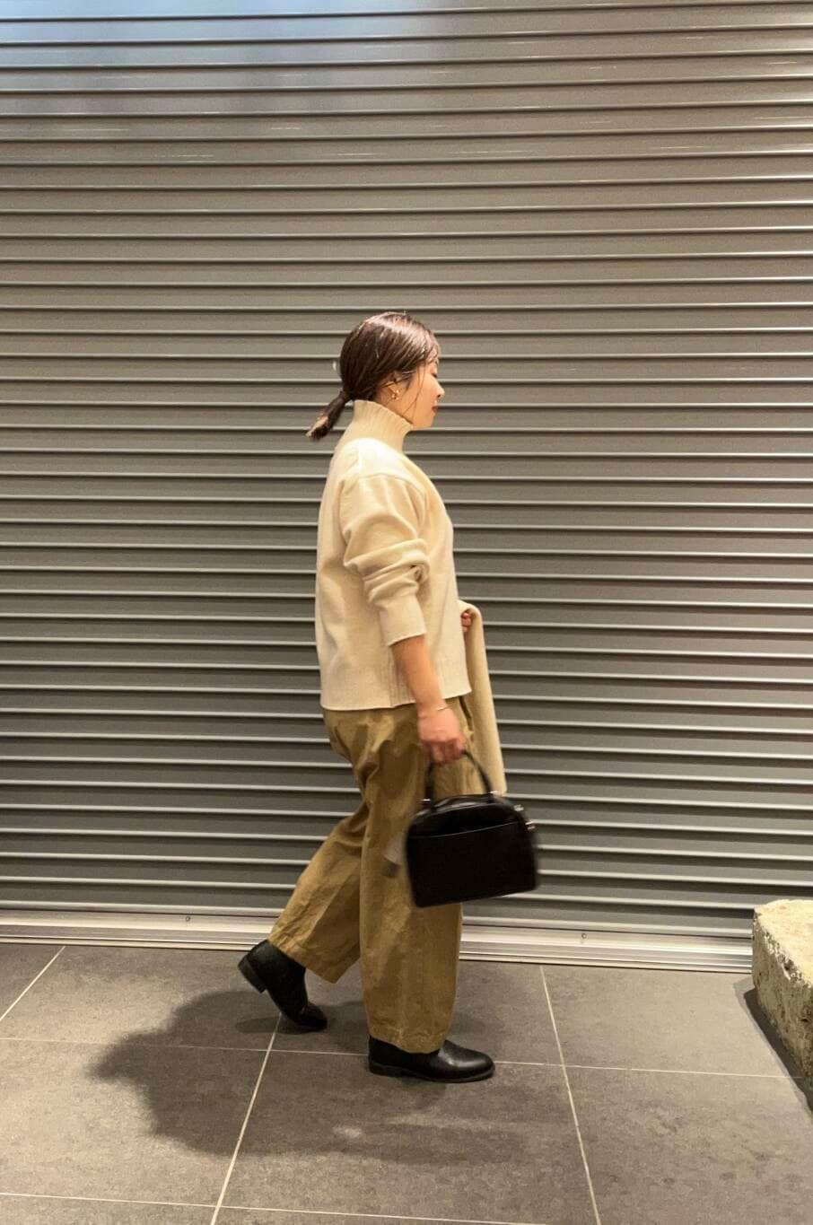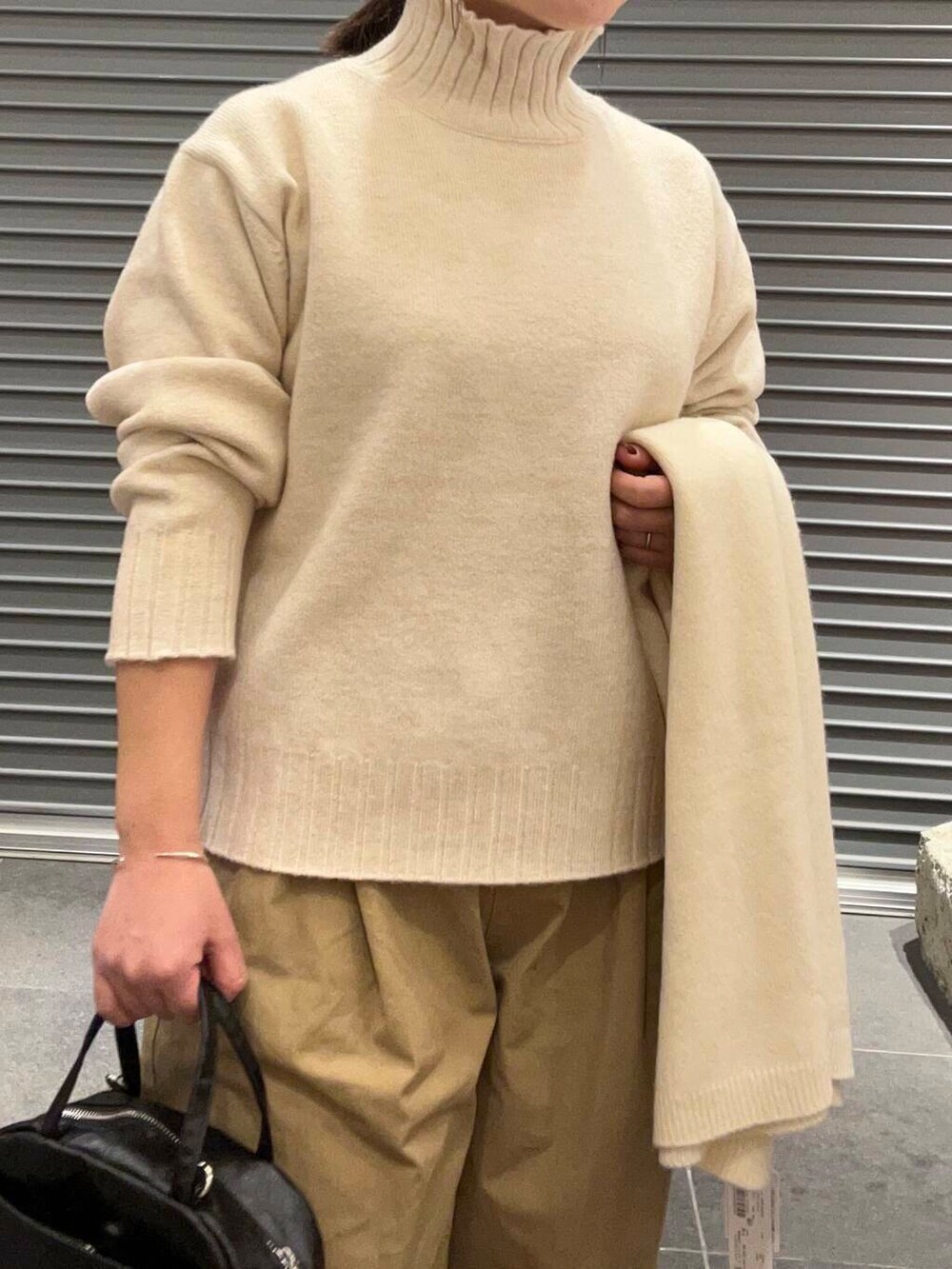 中はタートルネックにベージュパンツでカジュアルにコーディネートしてみました。