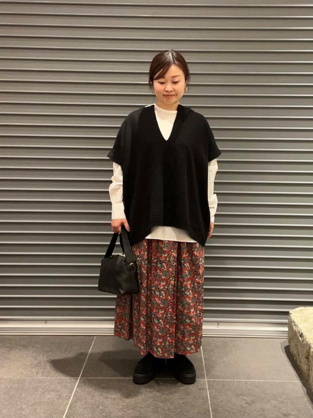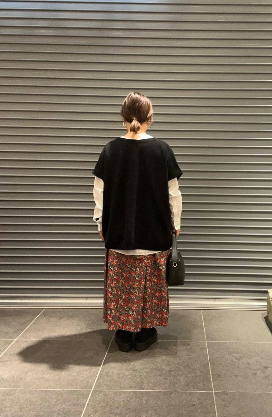 ニットベストはゆるっと着れて、シャツやカットソーとレイヤードを楽しめます。ベストでも袖が少し肩にかかる長さなので暖かいです。