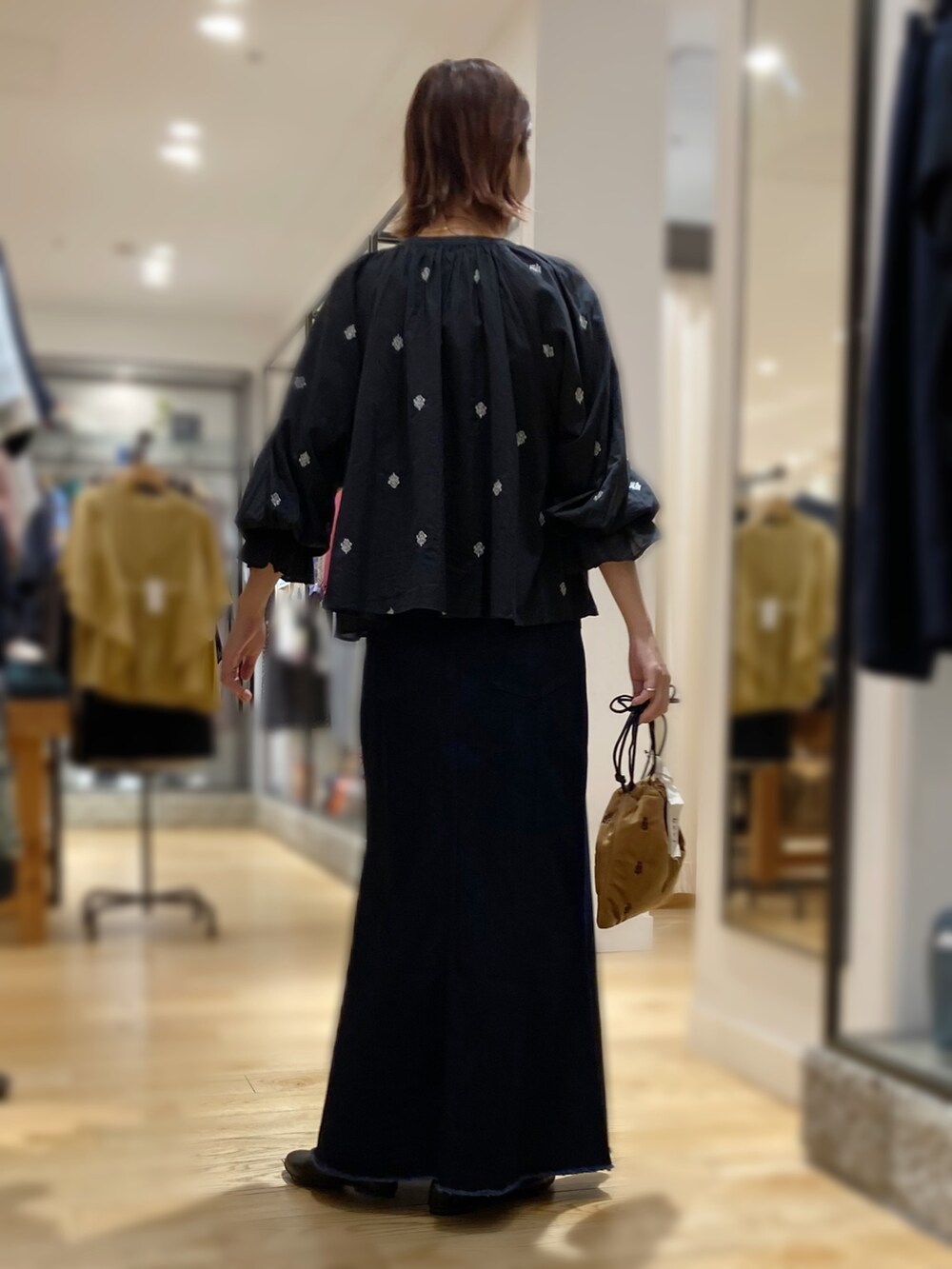 サイズ感:ウエスト少し余裕あり。元々長めの丈感ですが、今年はスレスレの着丈が気分なのでMサイズにしました。裾の切りっぱなしのデザインのおかげでロング丈でも軽めに着ていただけます!