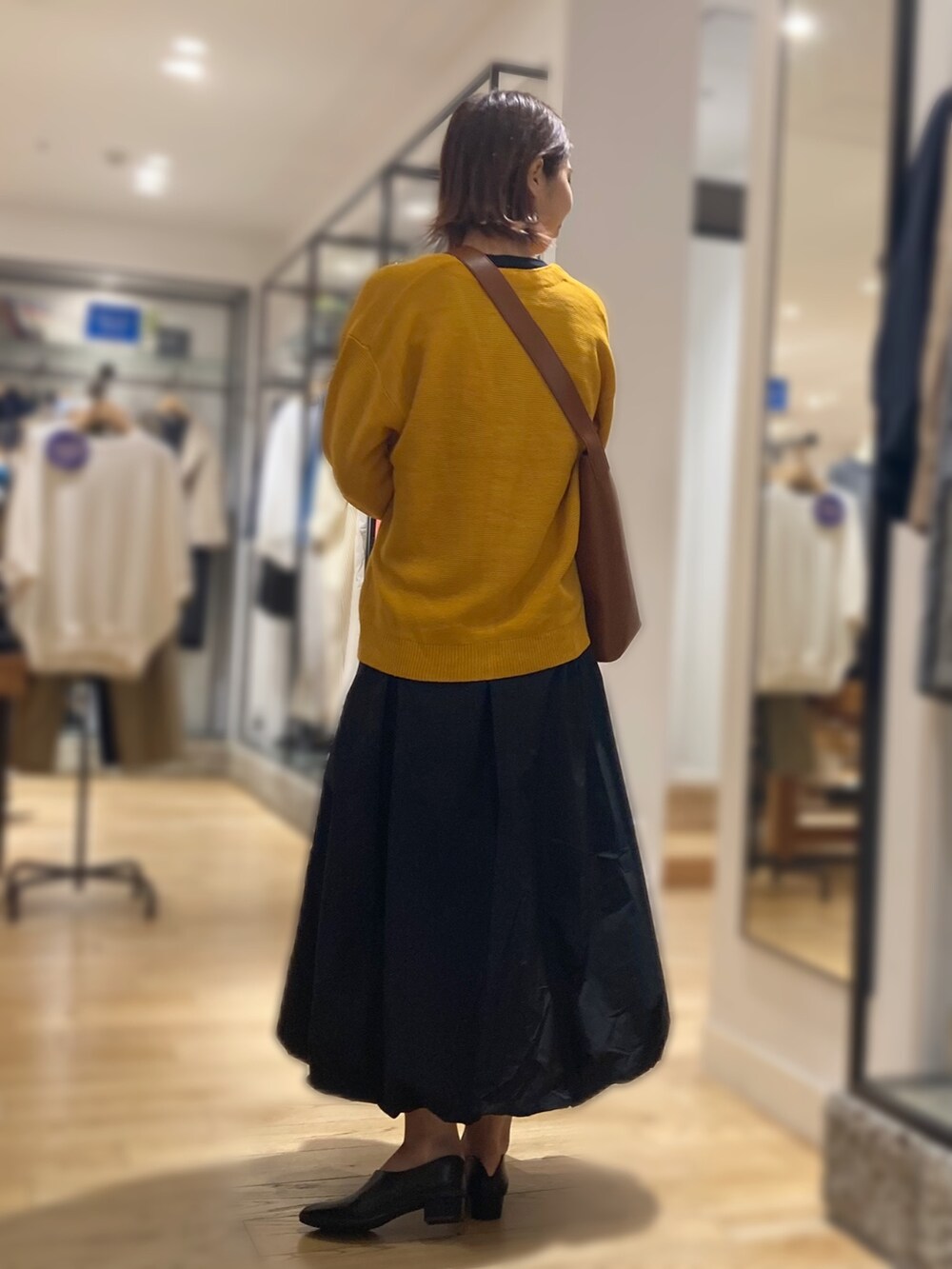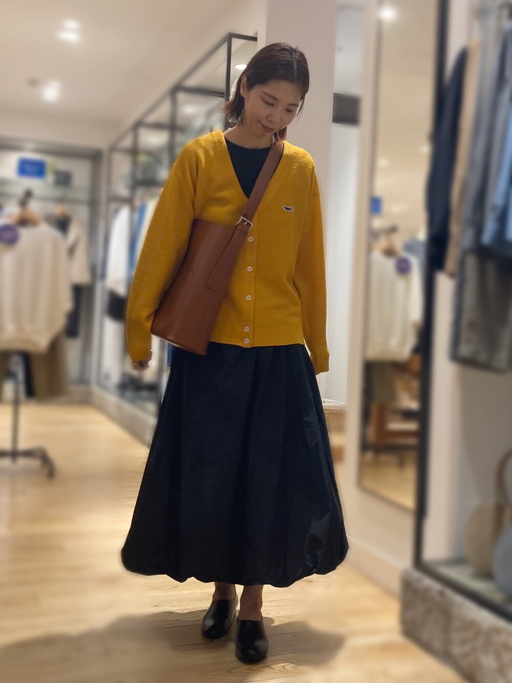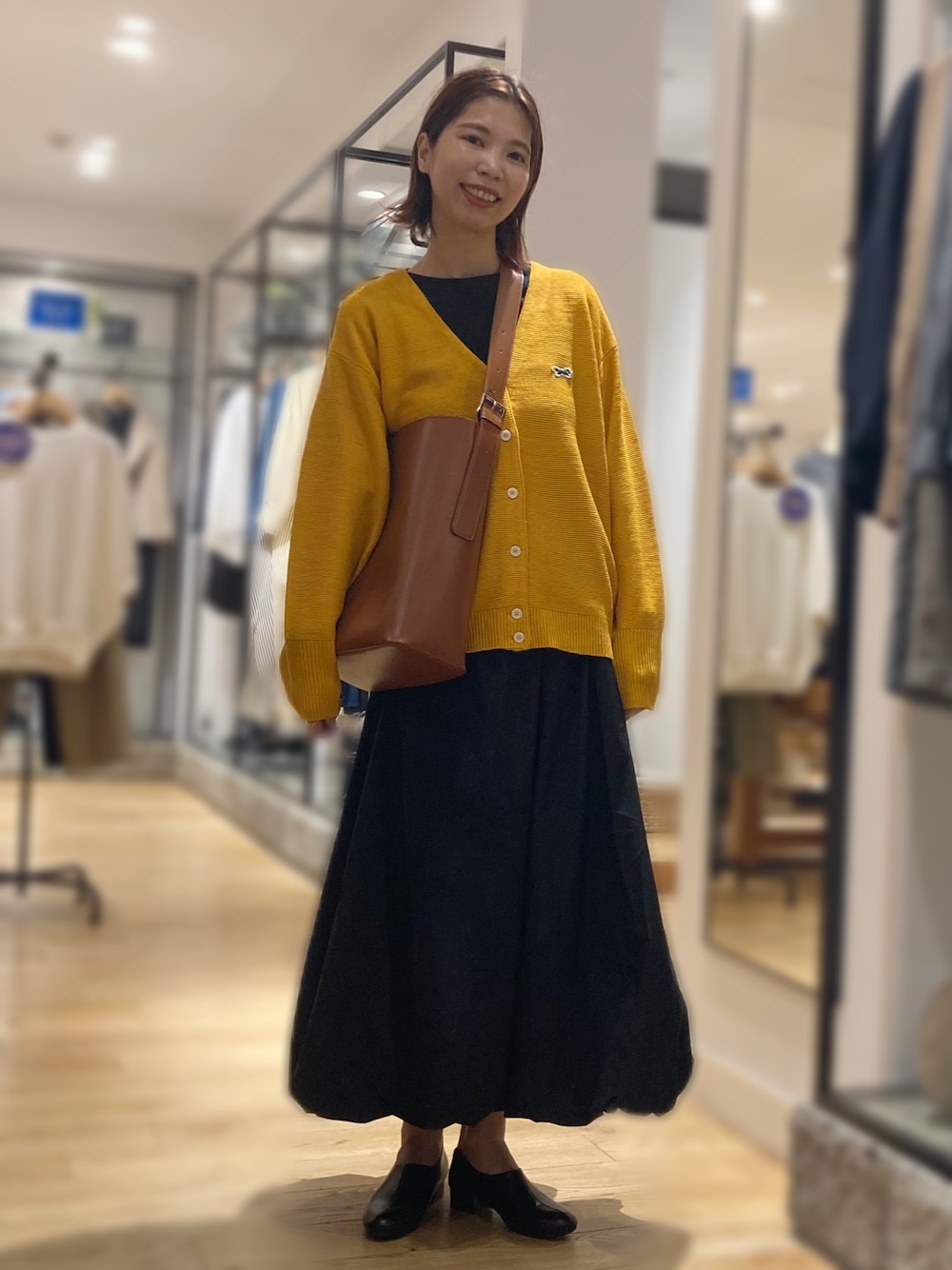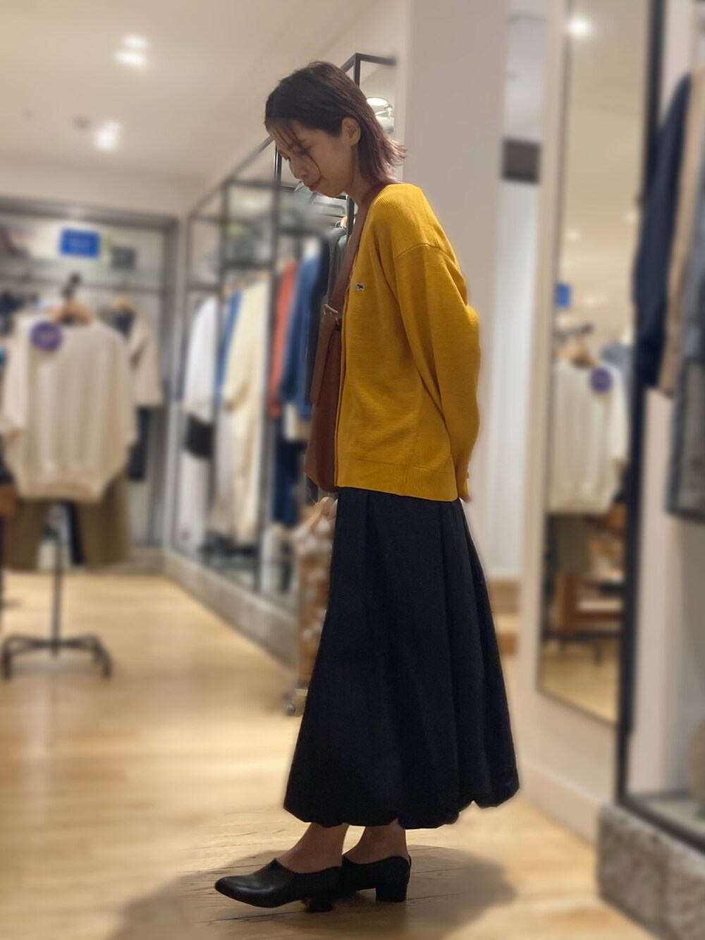 イエべ秋の方に是非着ていただきたいマスタードカラーのカーディガン!他のアイテムはブラックでまとめクラシカルな雰囲気にしてみました。大きめショルダーも今の気分にピッタリ。