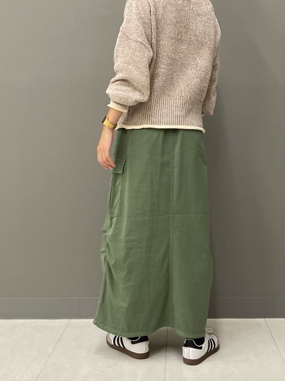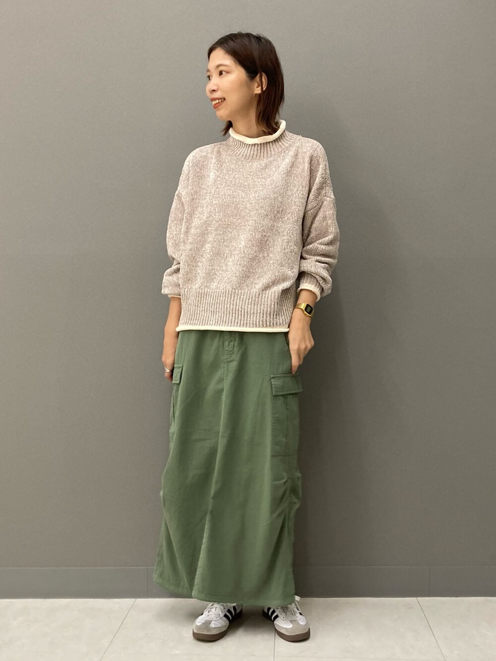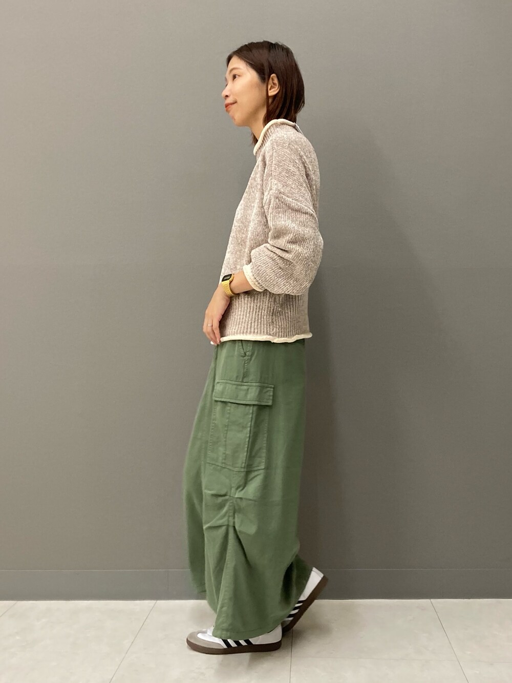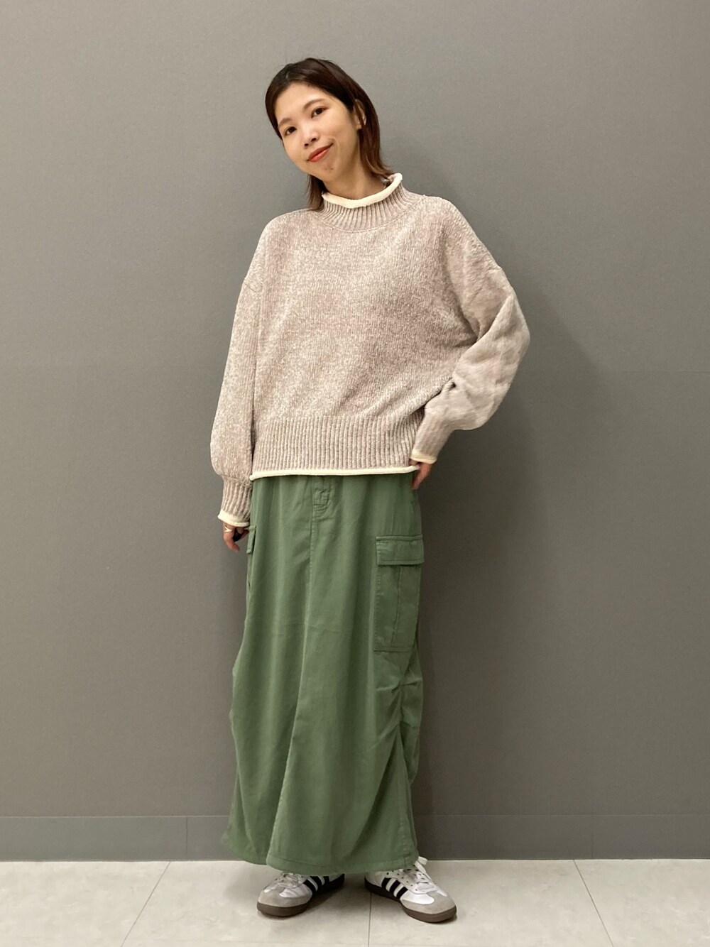 全色配色が可愛いのですが、中でもベージュは女性らしく柔らかなトーンなので色物のボトムスともすんなり合わせて頂けますよ(^^)