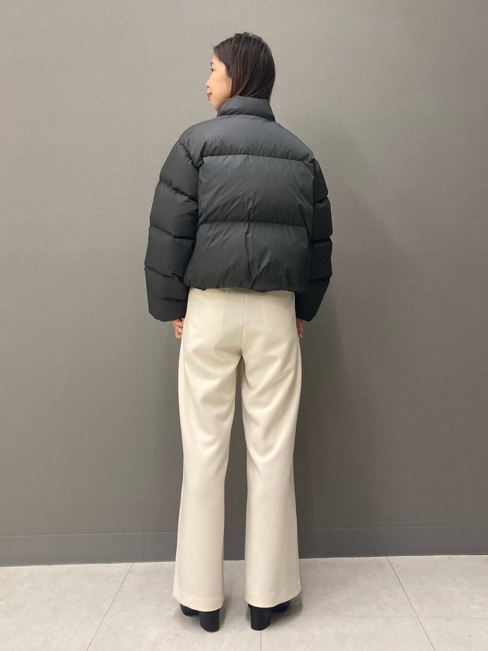 トップスとボトムスをオールホワイトにして、トレンド感たっぷりのショート丈のダウンをメインに!