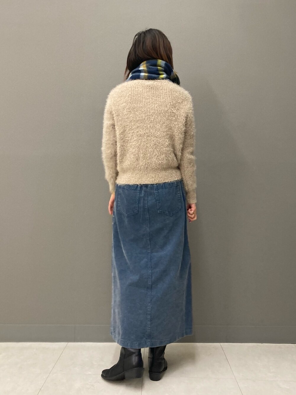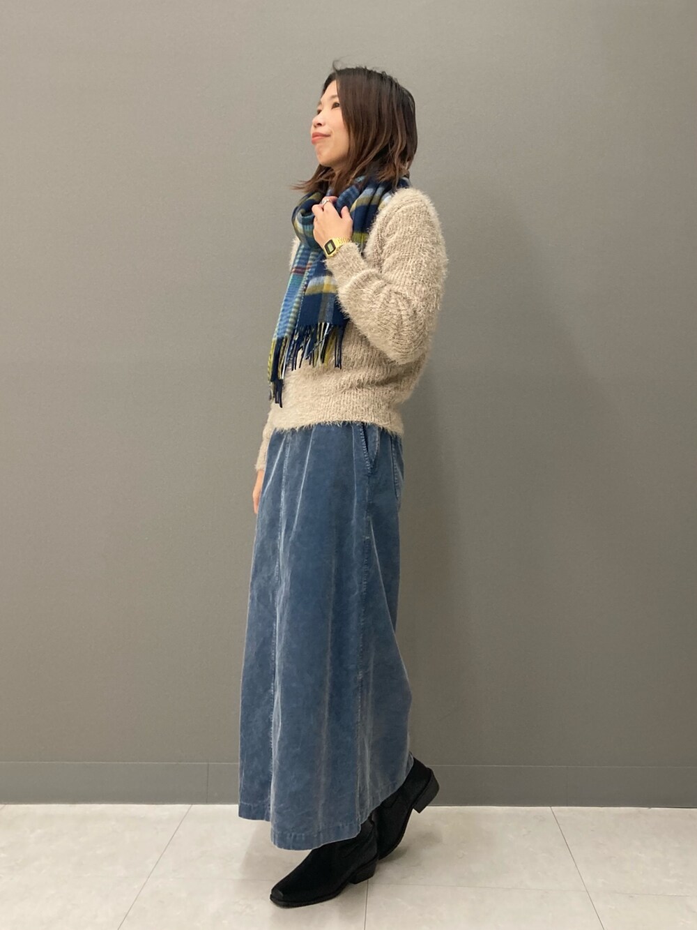 コーデュロイスカートとマフラーをブルー系でまとめ、冬ならではのブルーコーデにしてみました(^^)