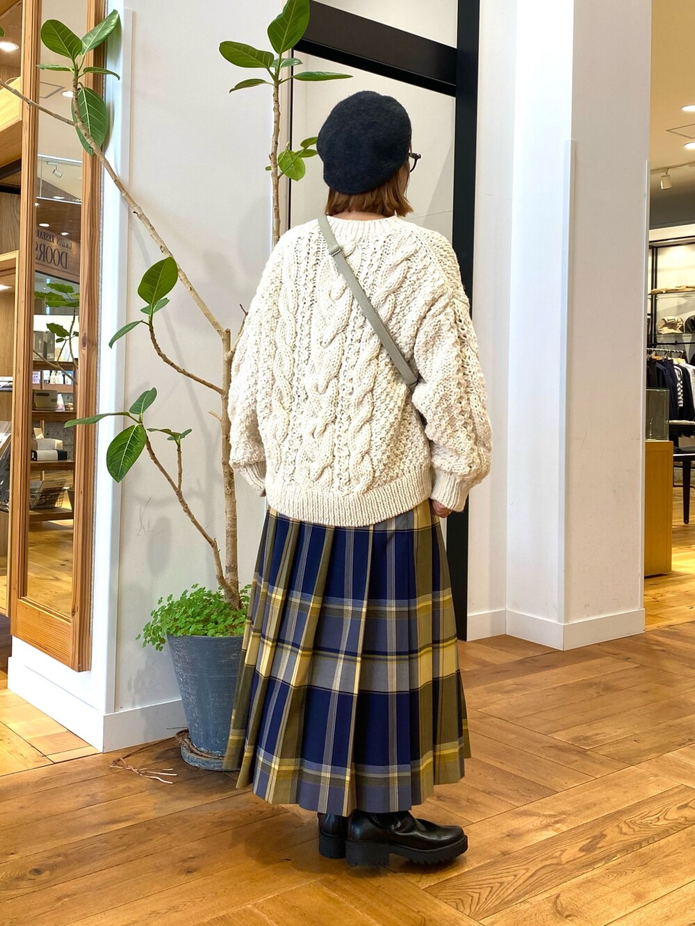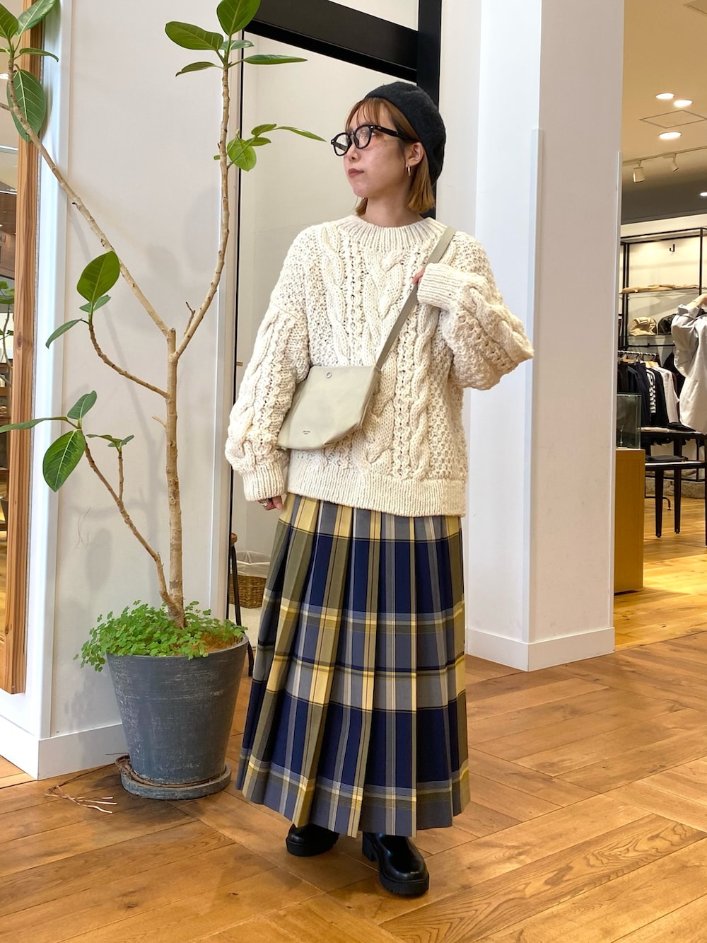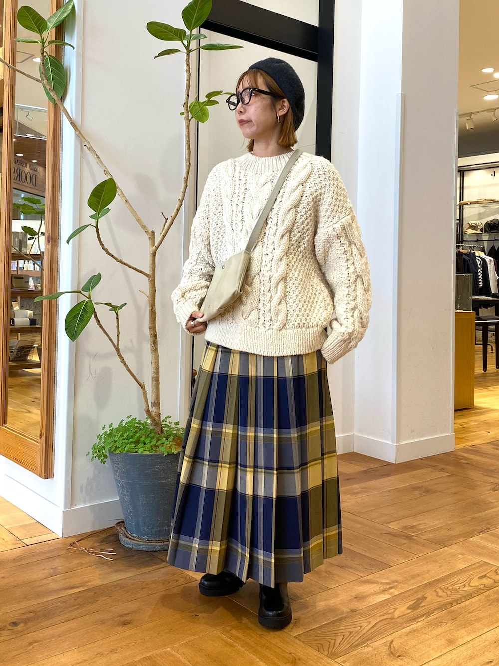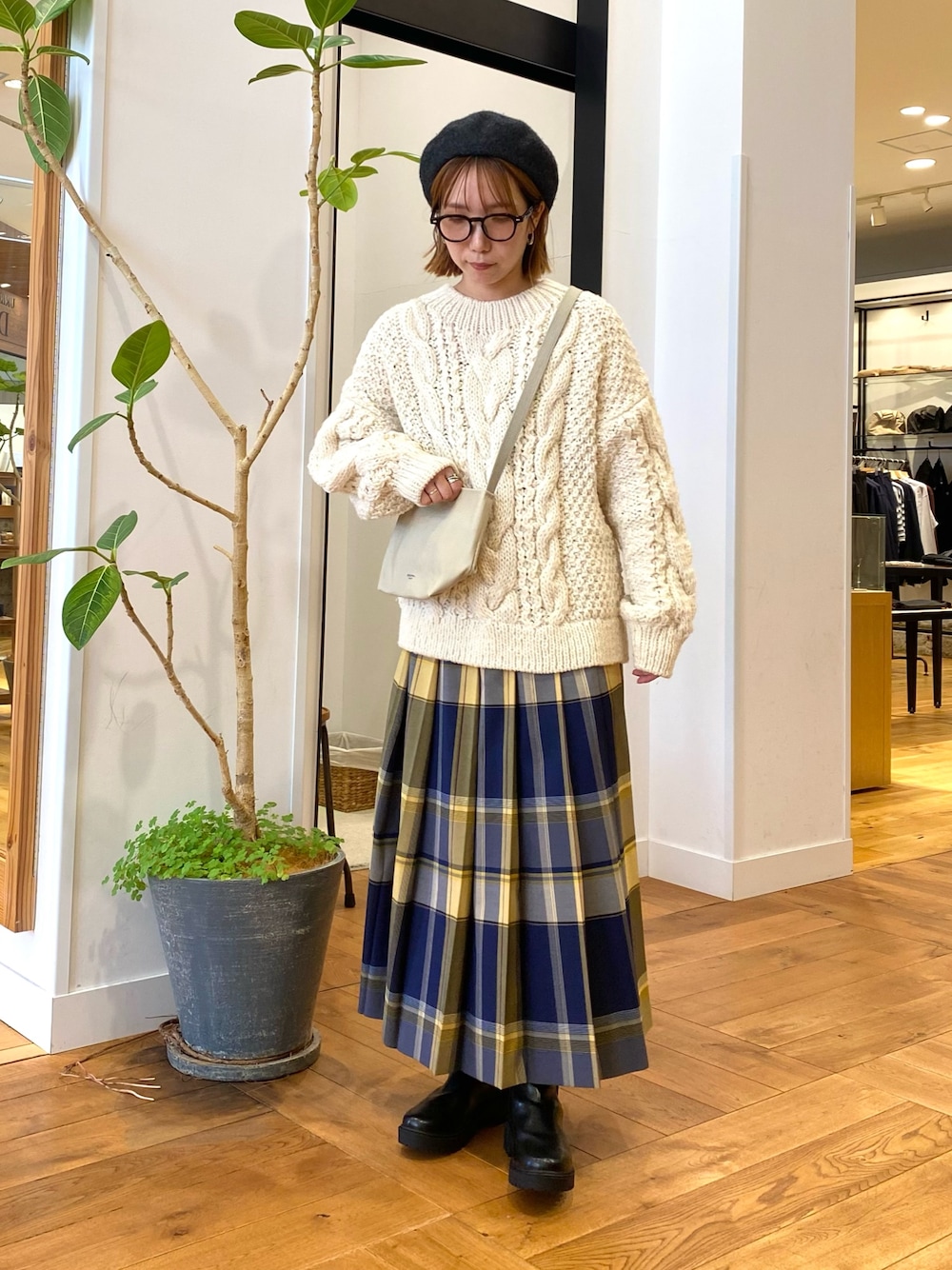 かぐれのアランニットを主役にチェックスカートで合わせて大人かわいいスタイリングにしました。