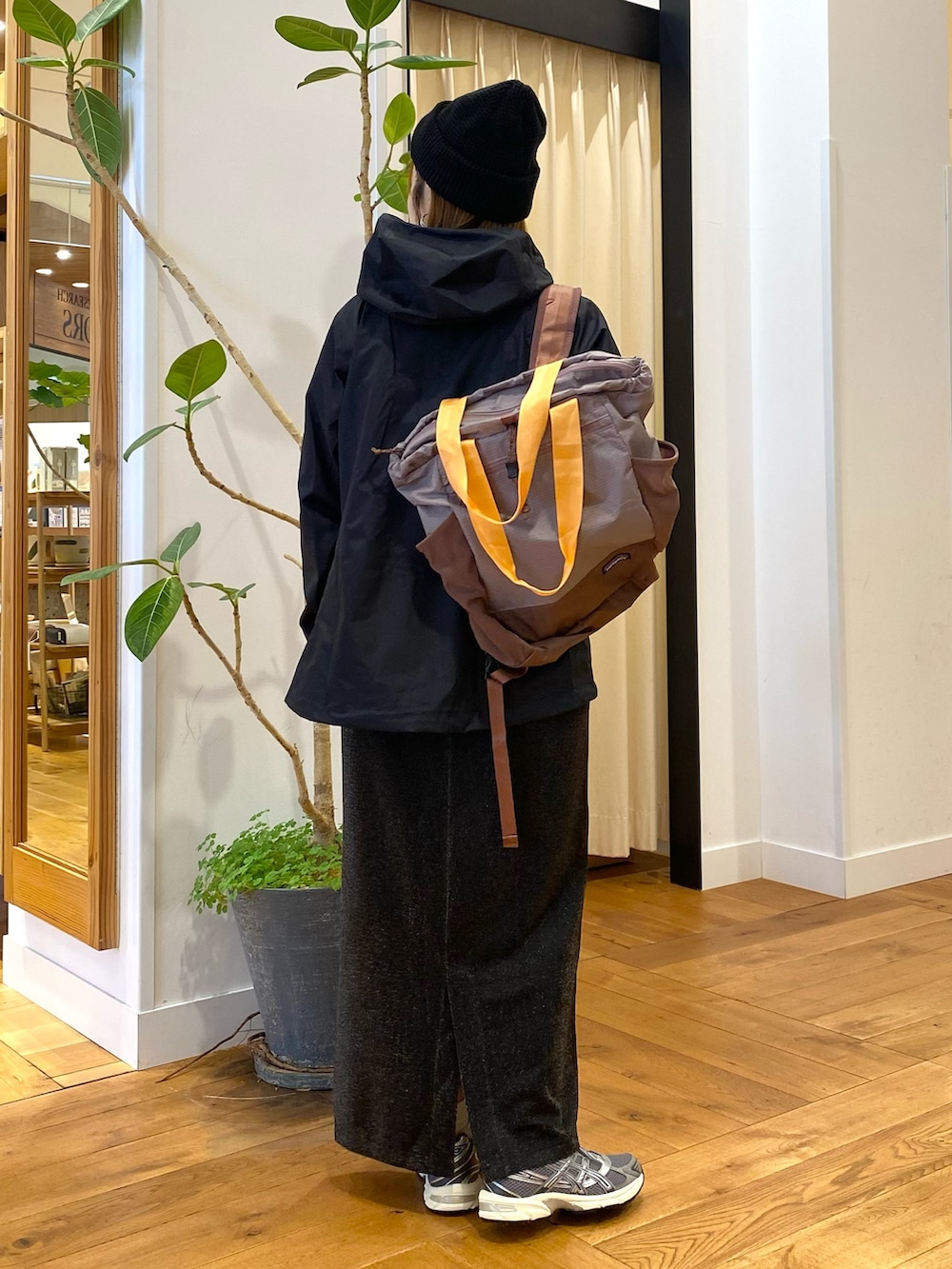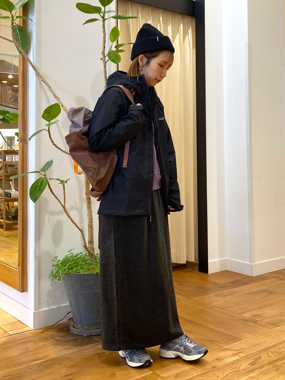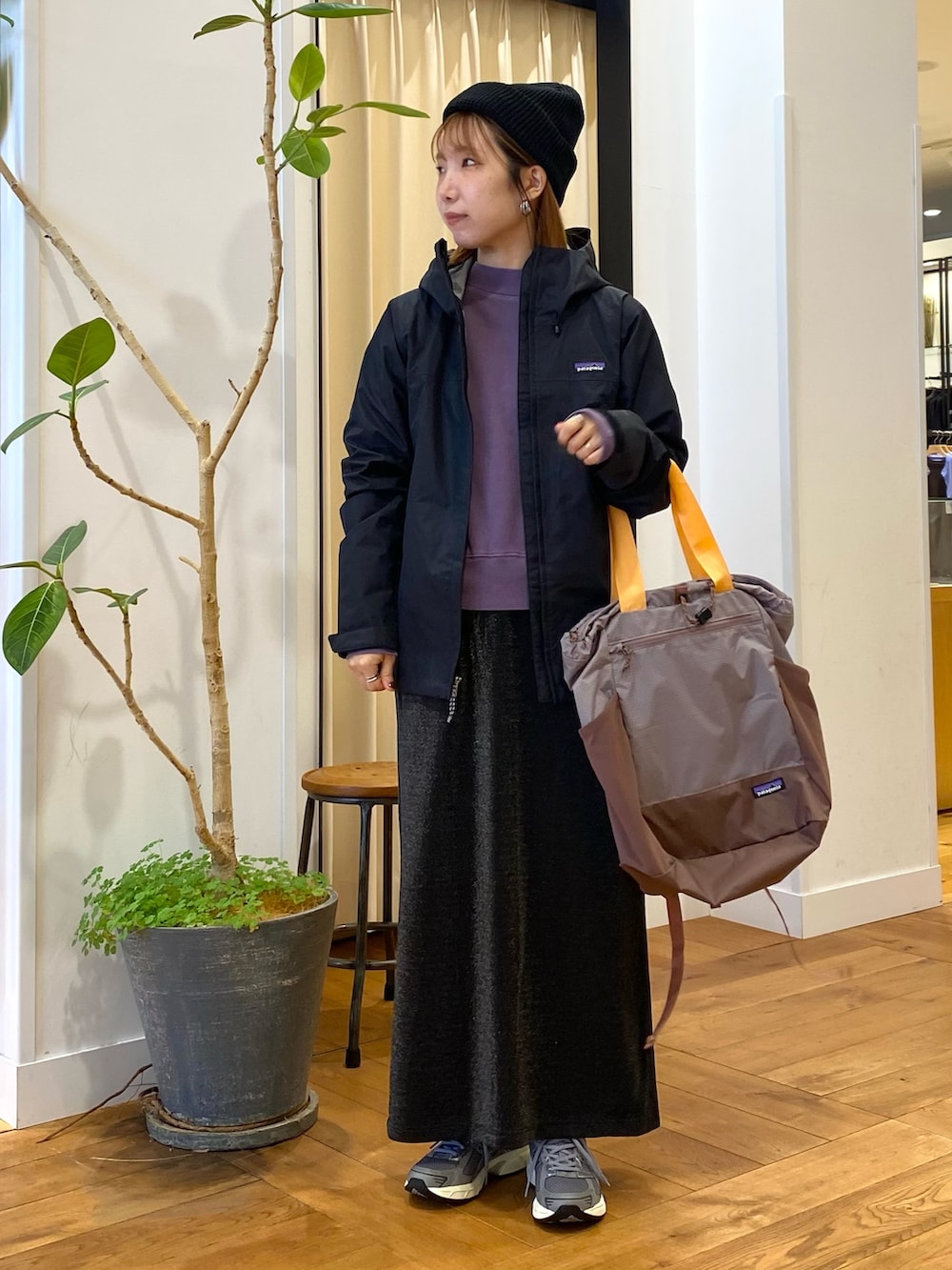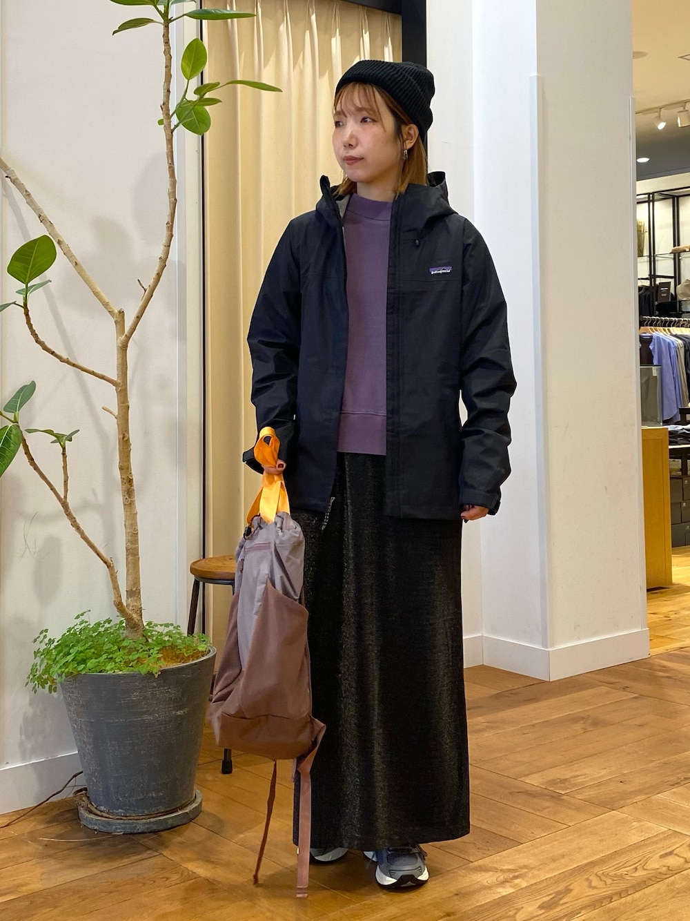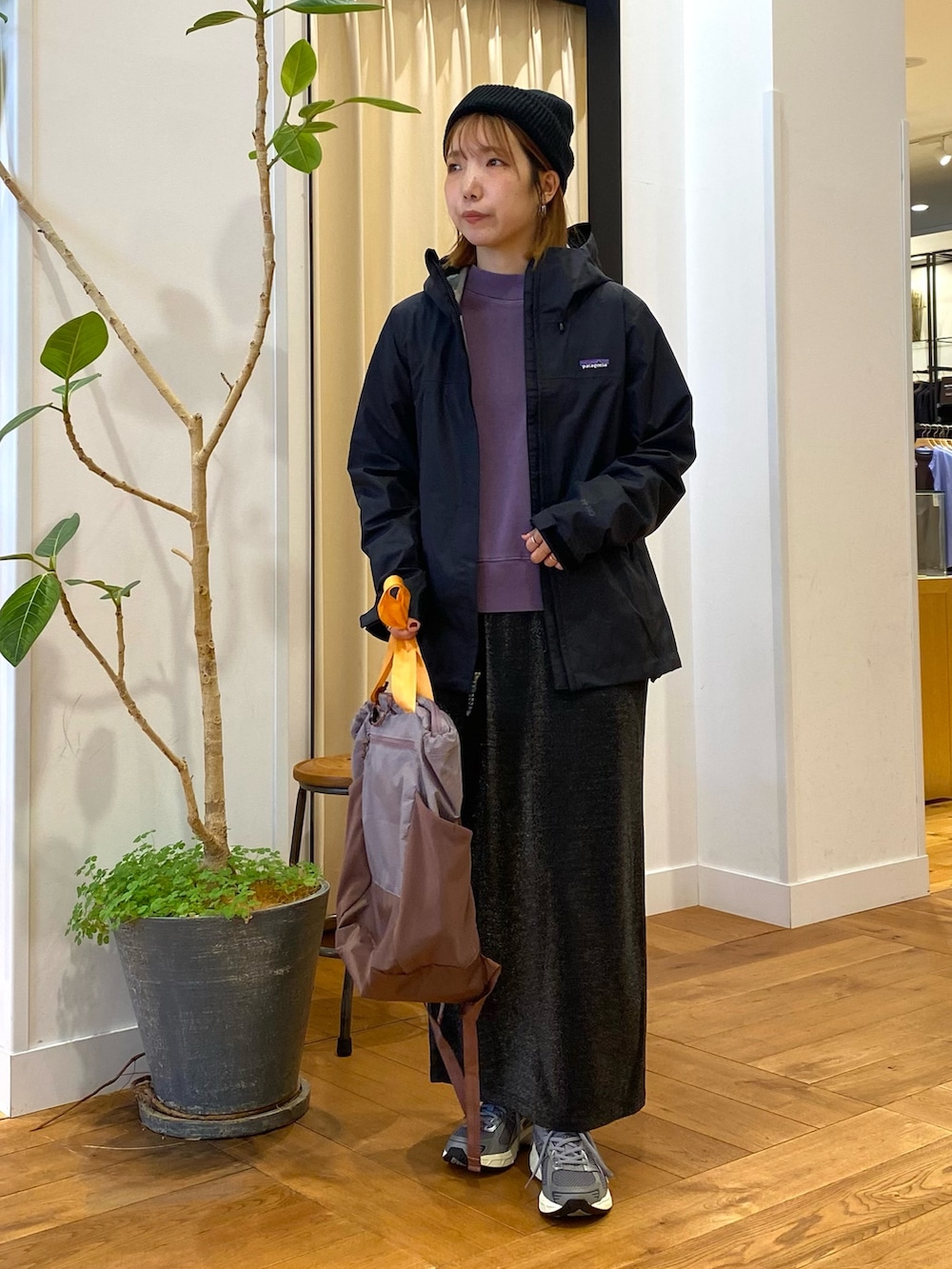 レインジャケットをメインに、中はFORK&SPOONのパープルのスウェットを差し色にして、大人っぽくタイトスカートで合わせました。