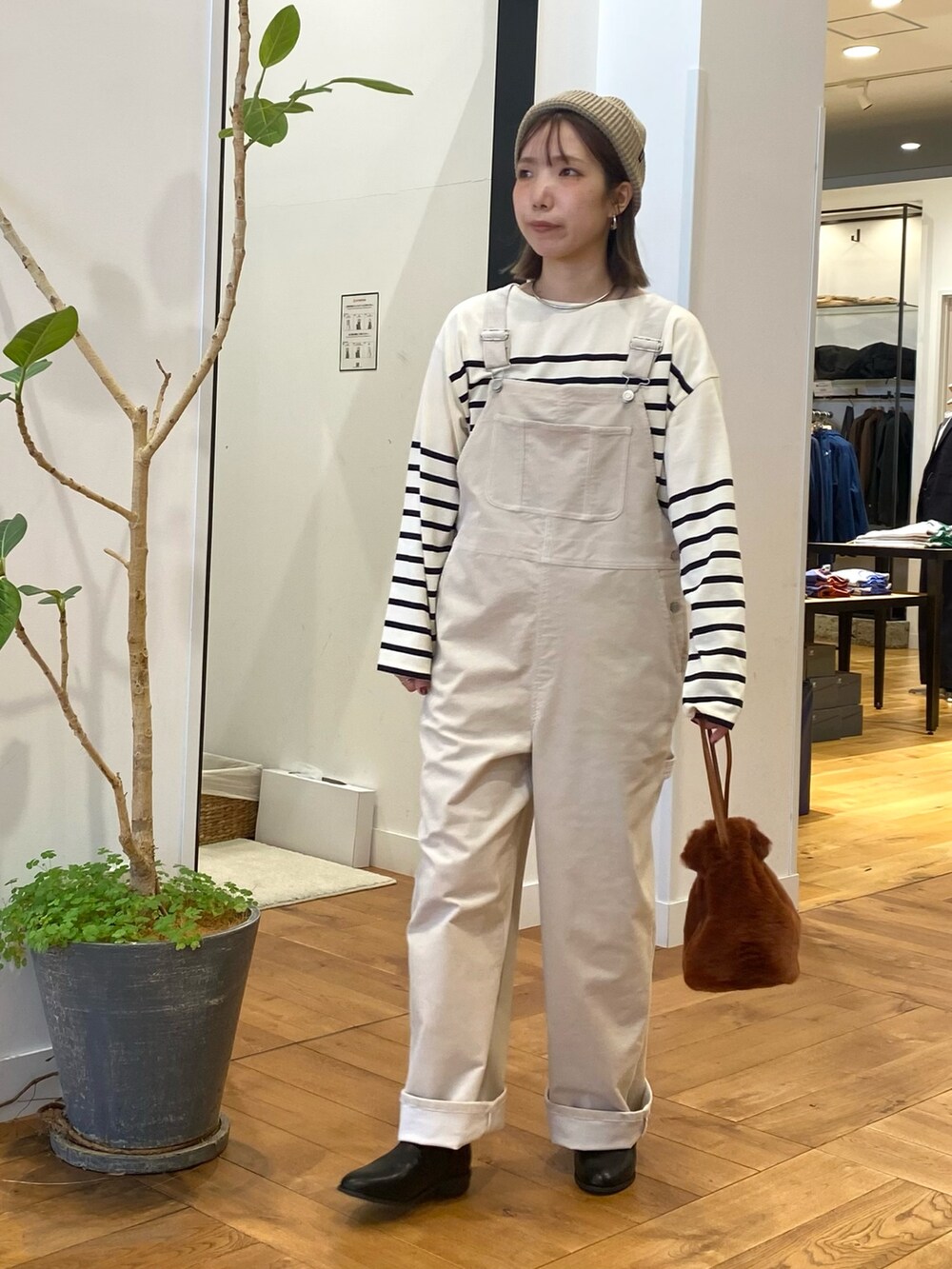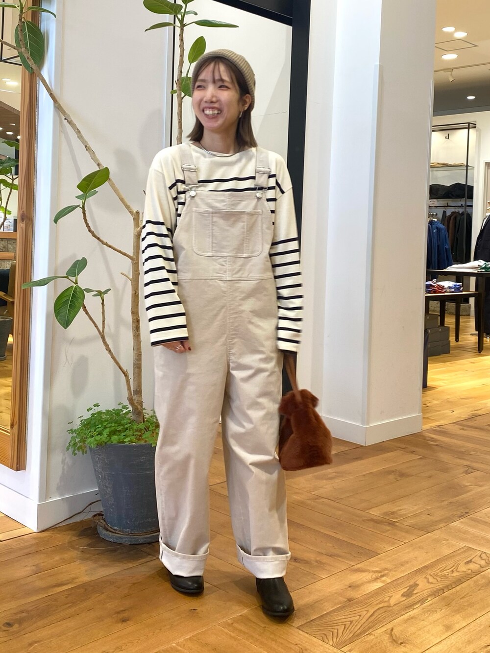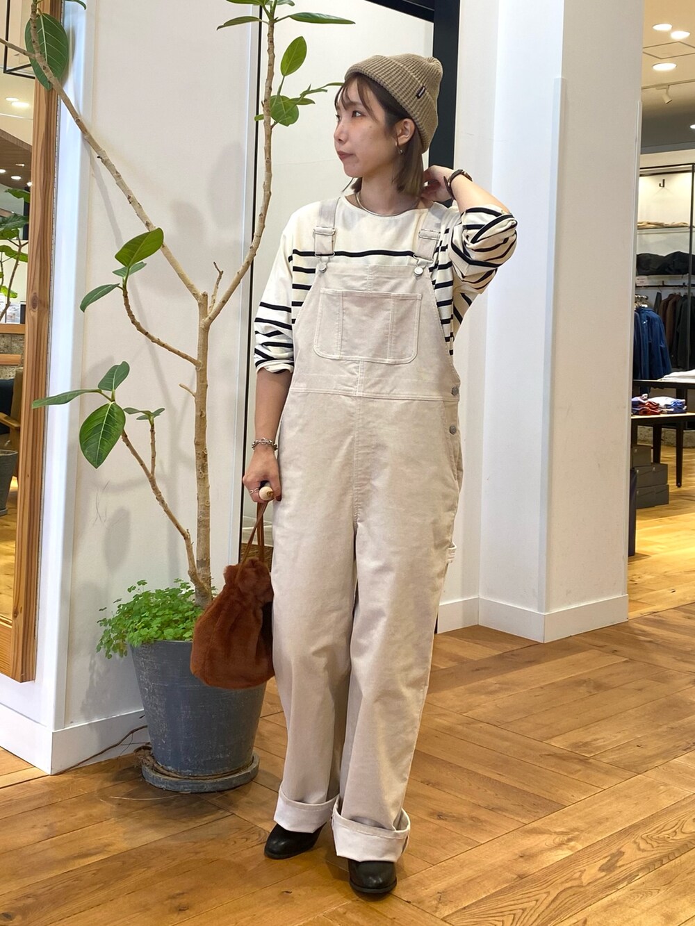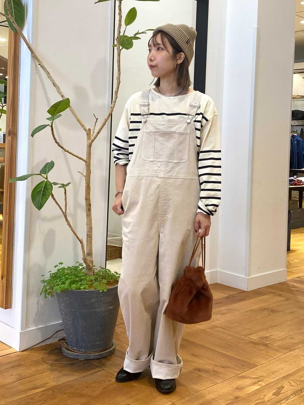 コーデュロイのサロペット、アイボリーを合わせてナチュラルなスタイリングにしました。