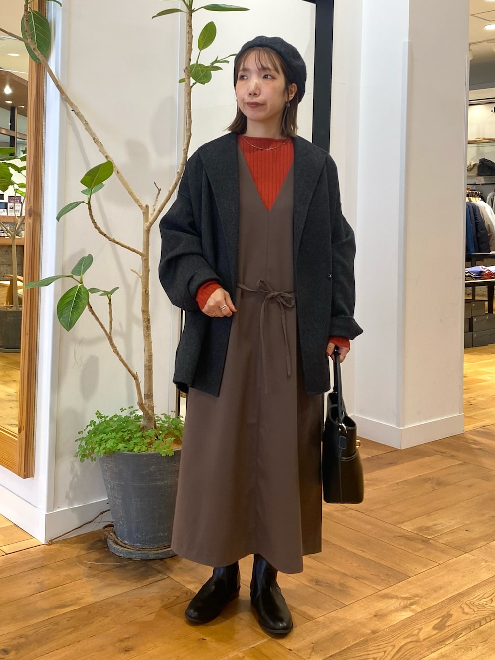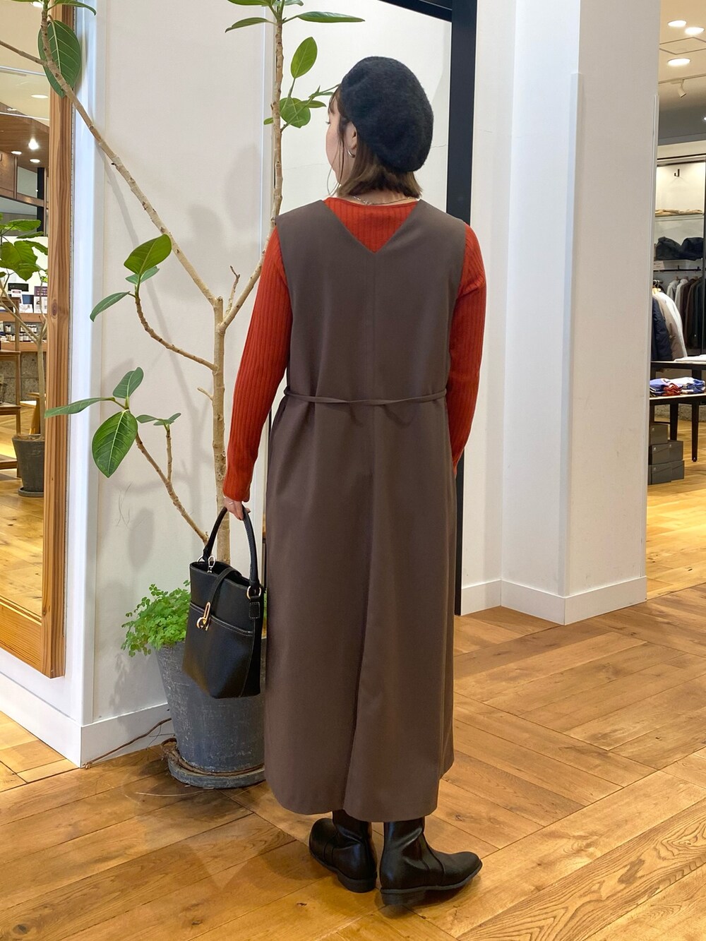 大人っぽいジャンパースカートに合わせて、シンプルなのにきちんと感のあるお手軽よそ行きコーデに。