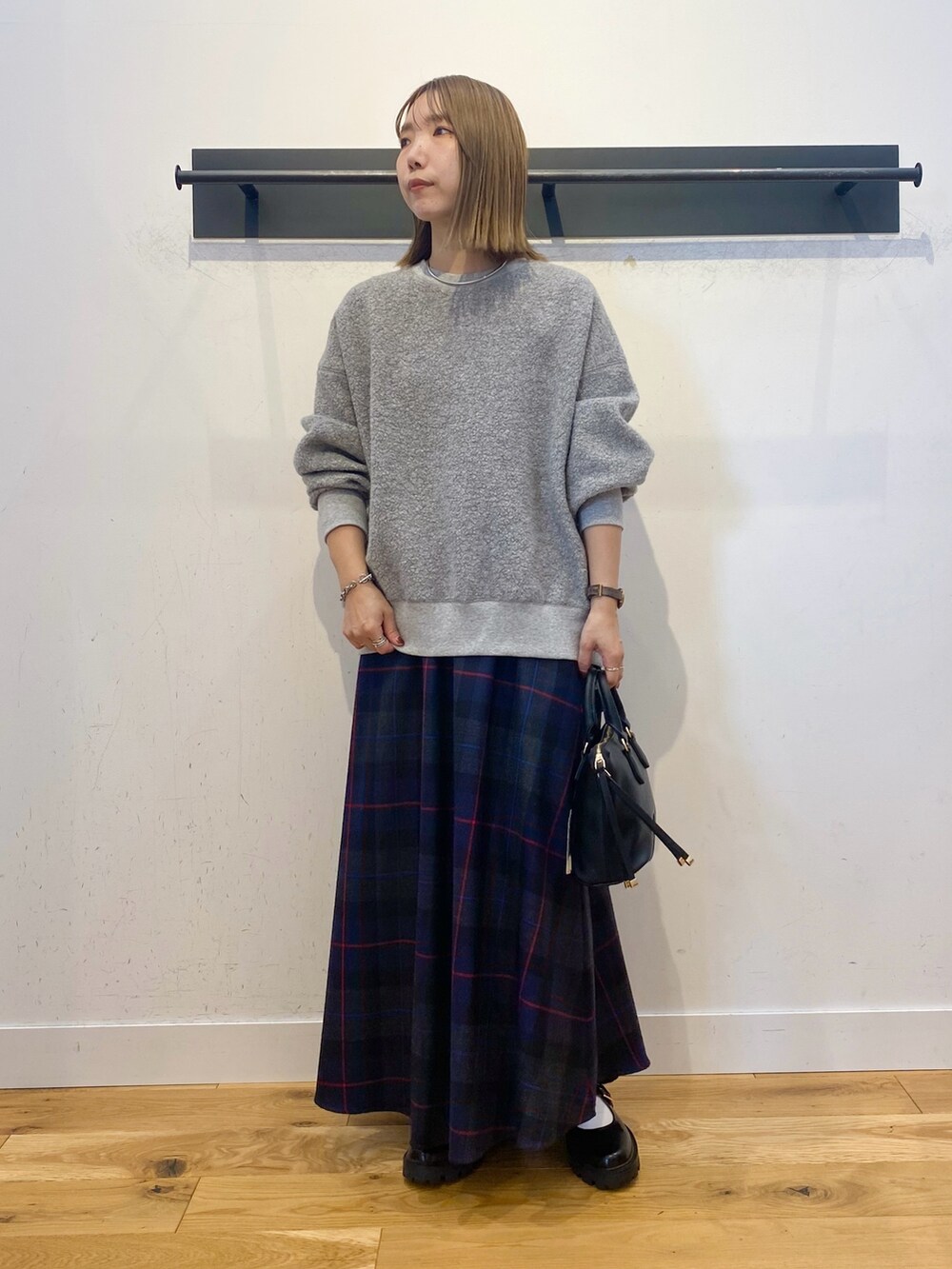 オニールのスカートはフレアで動きがでるシルエットです。程良いボリュームの為厚みのあるニットにも合わせやすく着やすいアイテムです。