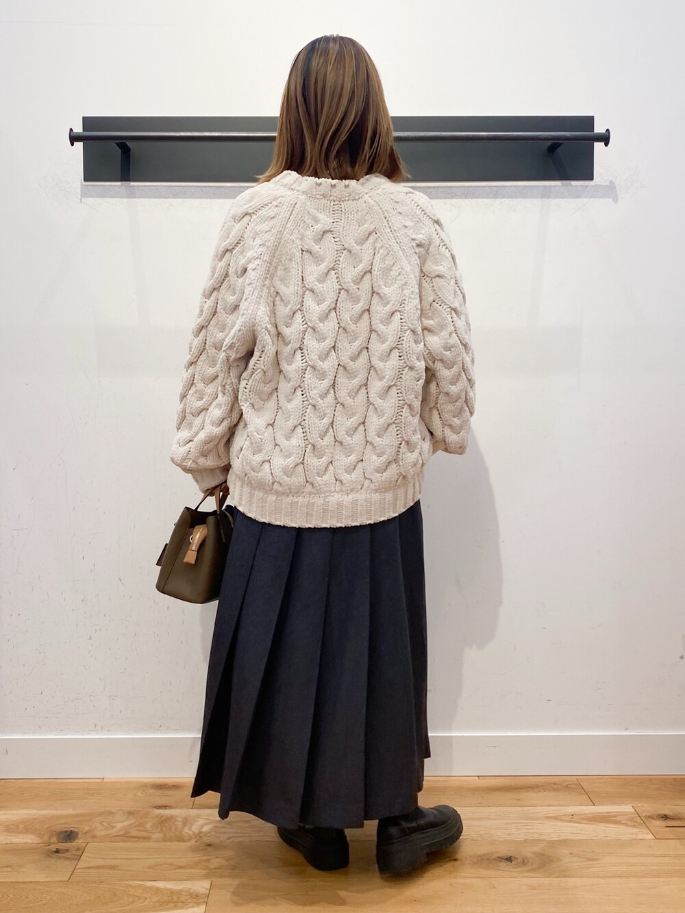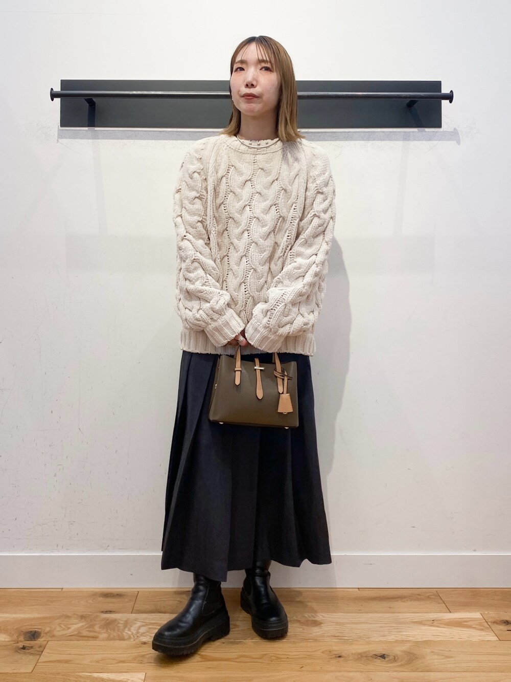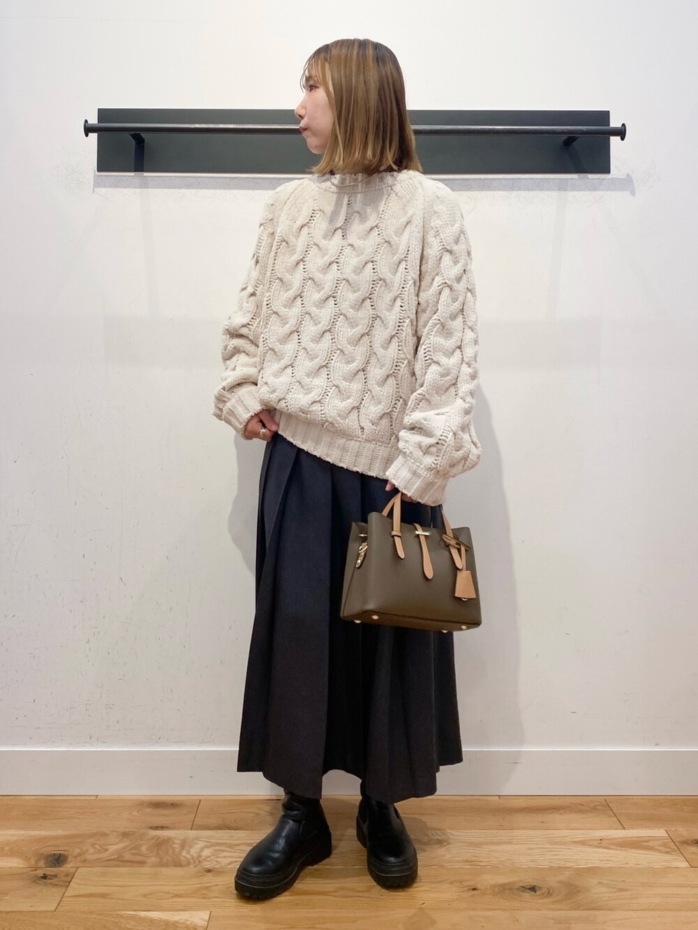 可愛い印象のニットに、カチッとした太いプリーツスカートを合わせて大人かわいいスタイルを意識しました。