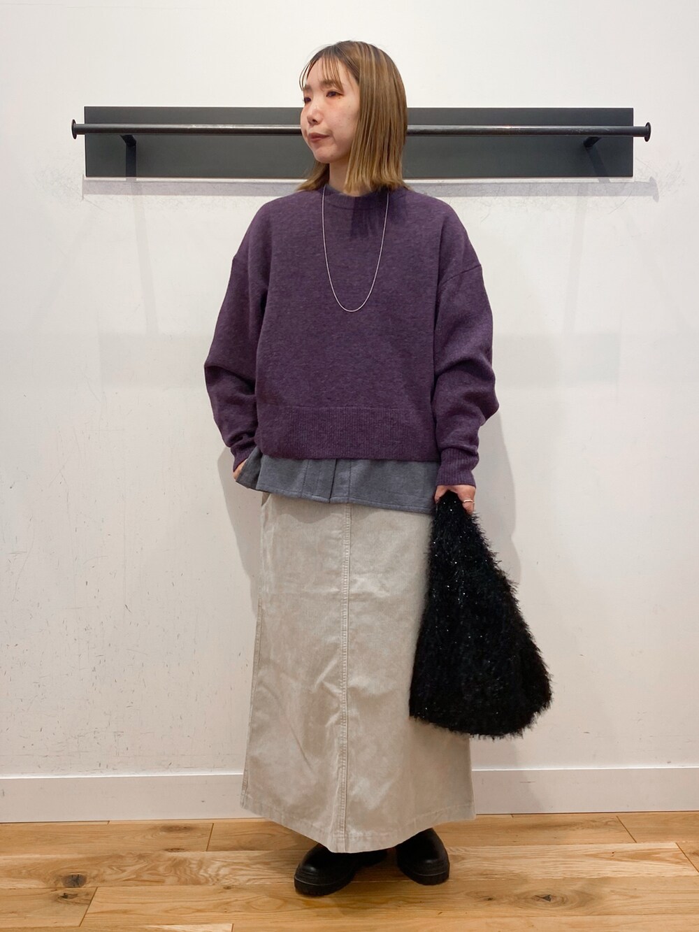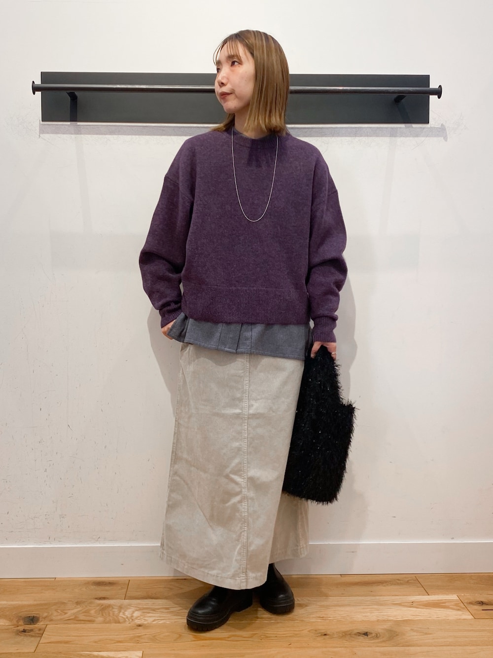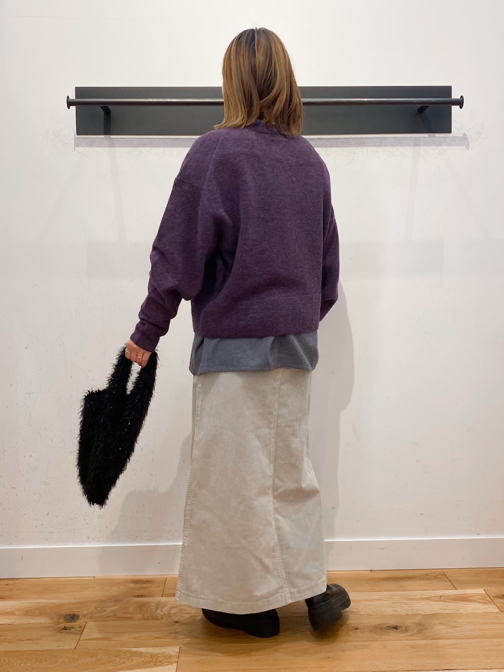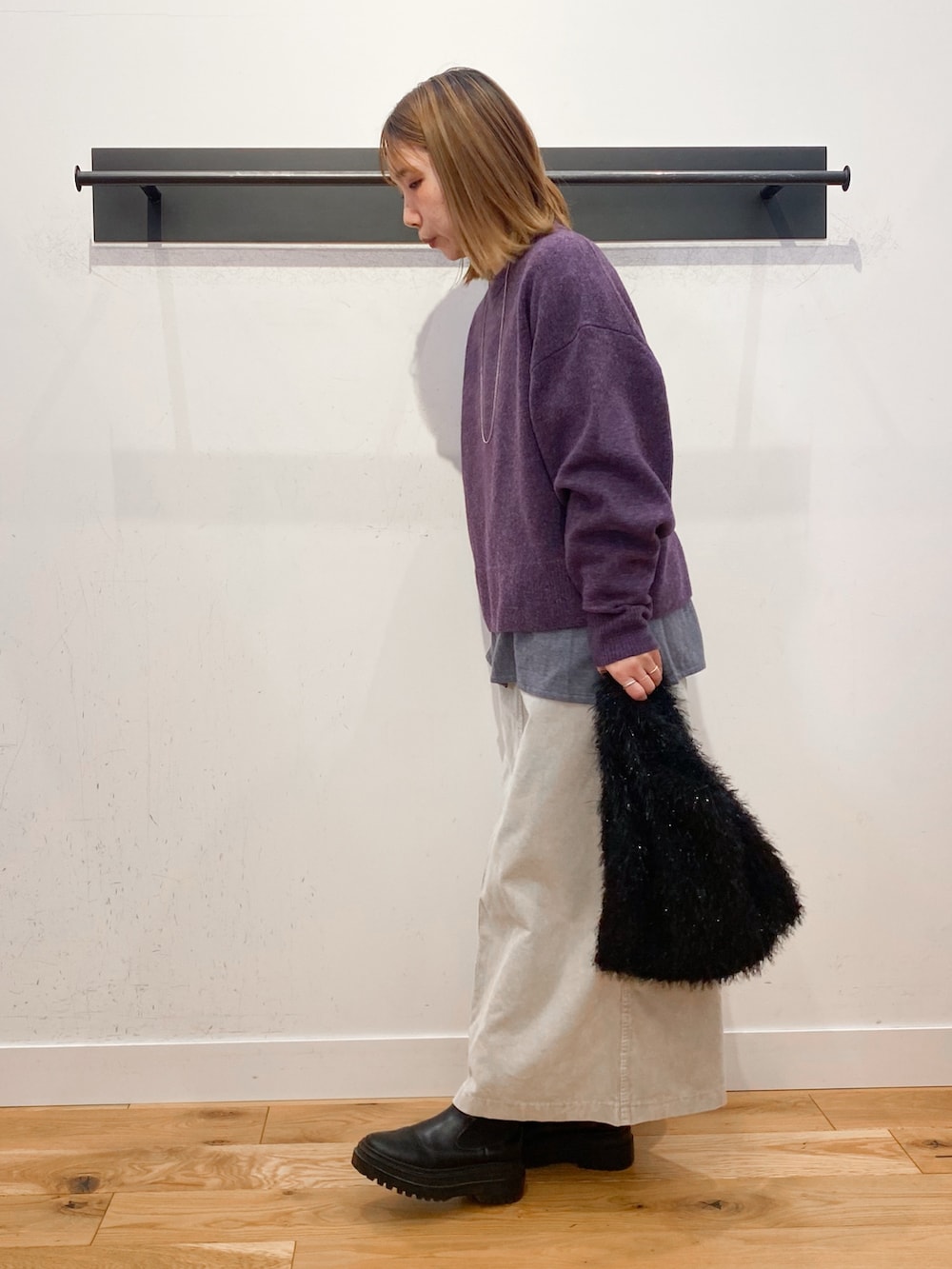 かぐれのパープルニットをメインに、落ち着いた大人カジュアルコーデを組みました。