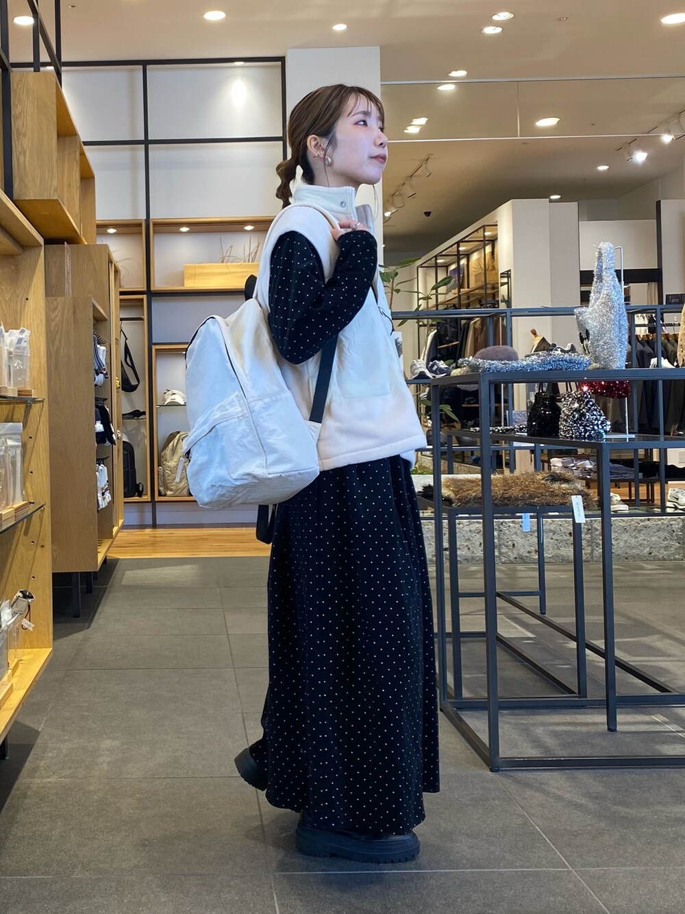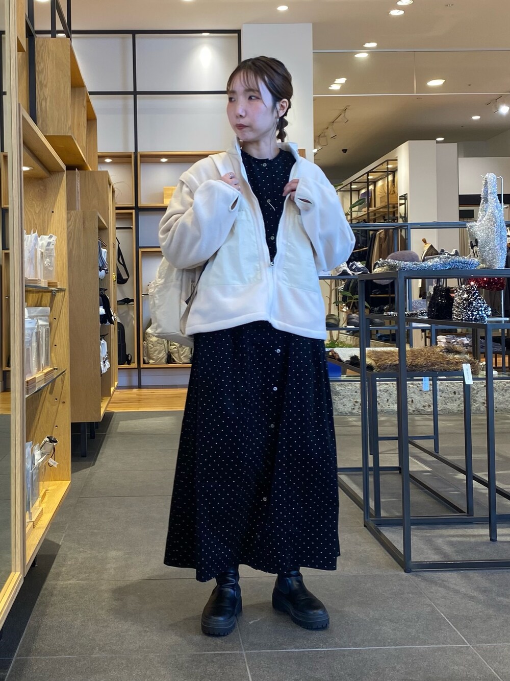 かぐれのドットワンピースをカジュアルにスタイリング。