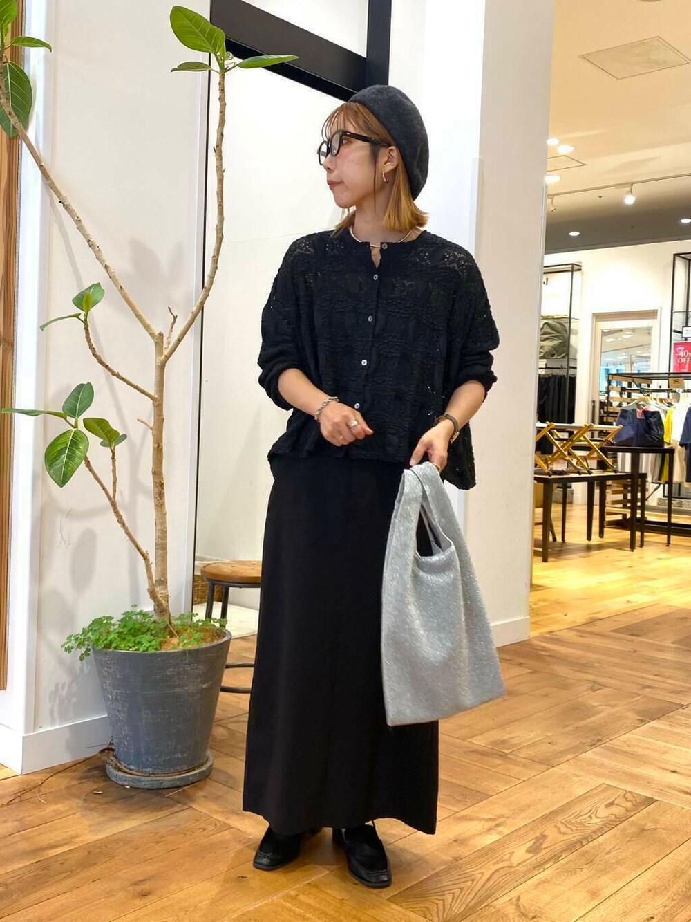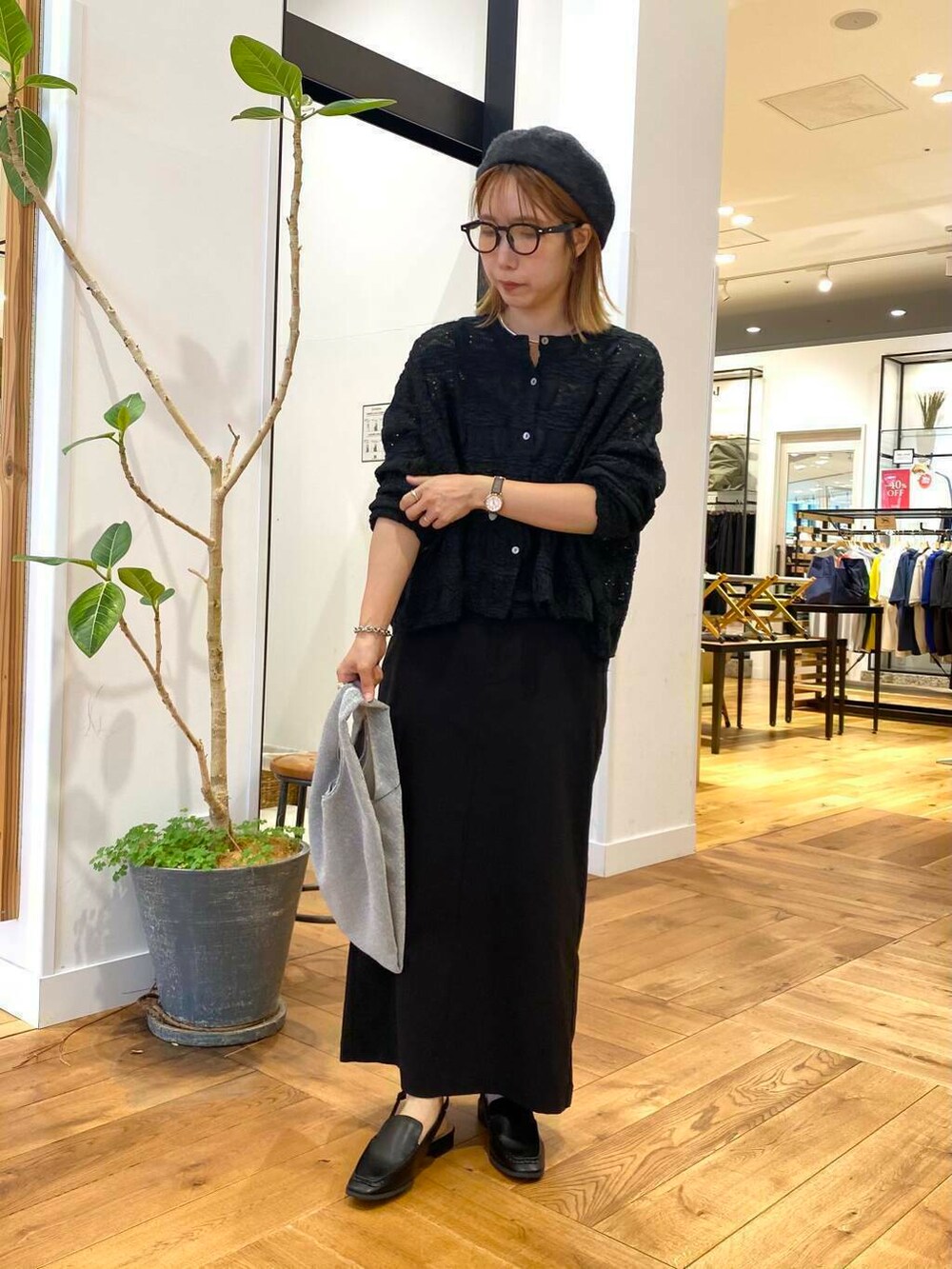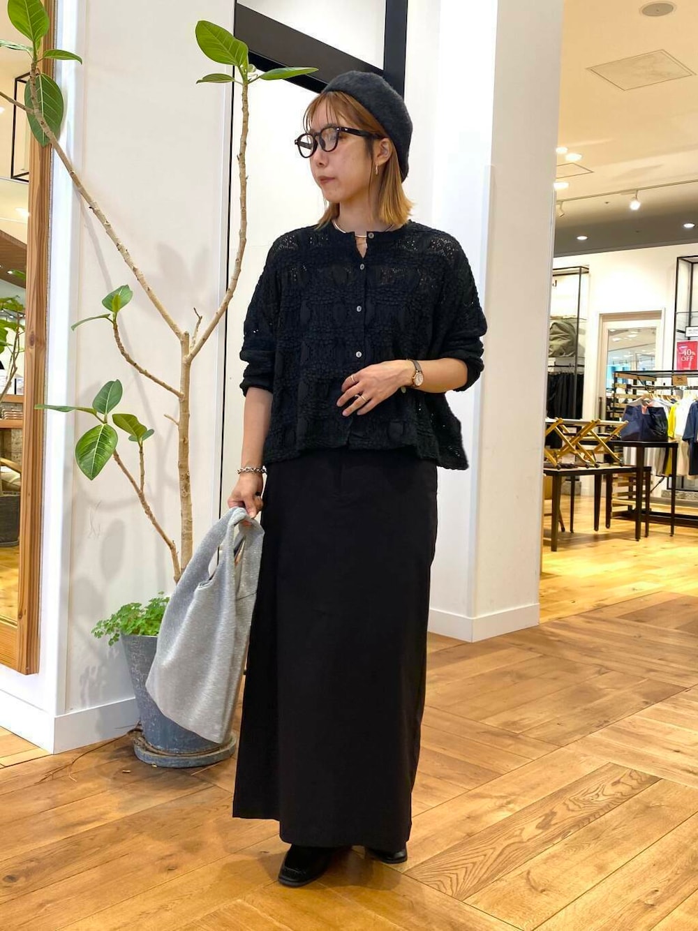 カーディガンの透け感と柄を生かすために全体的にシンプルにコーディネートしました。
