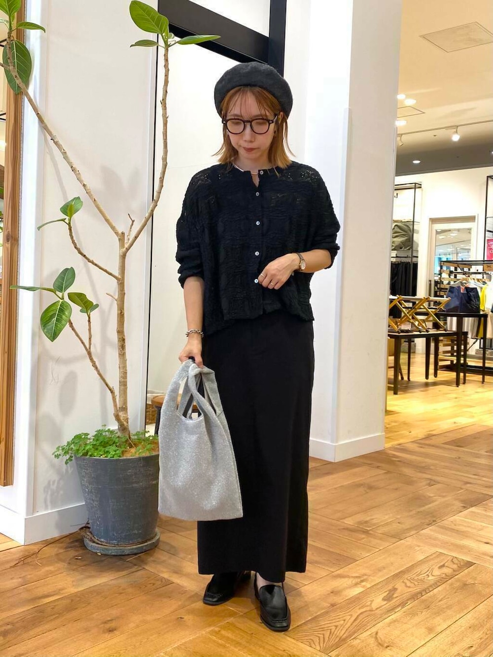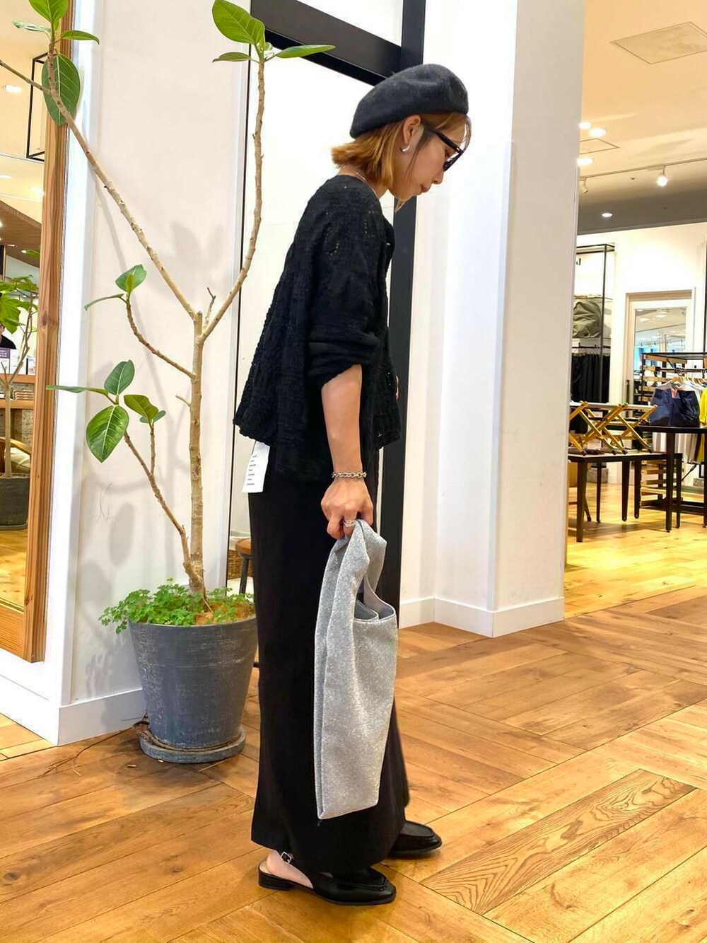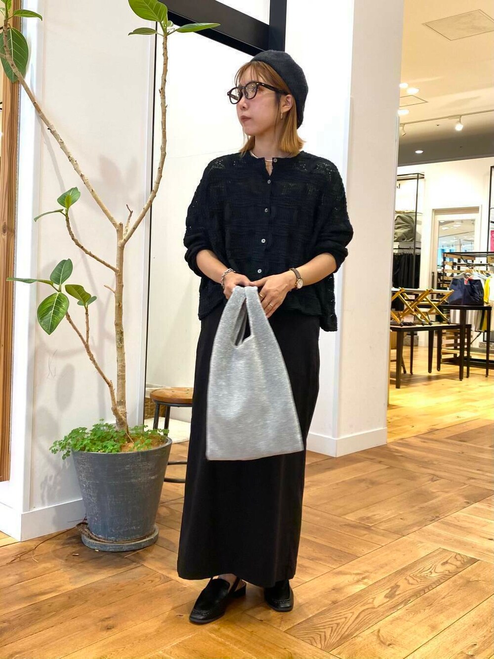 カーディガンの透け感と柄を生かすために全体的にシンプルにコーディネートしました。
