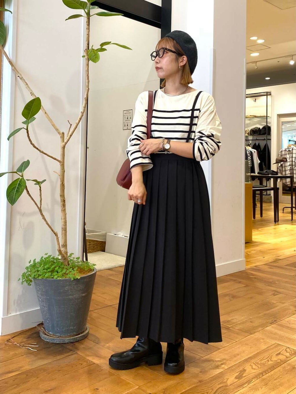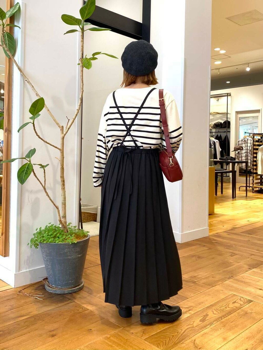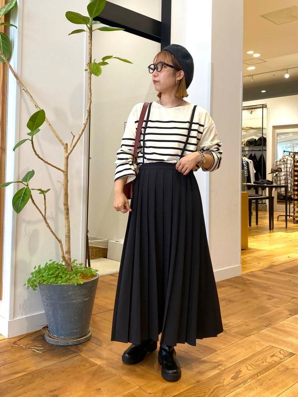 サロペットのプリーツスカートはまる子になりがちですが、品のある生地で落ち感のあるシルエットなので脚長効果もあっておすすめです。