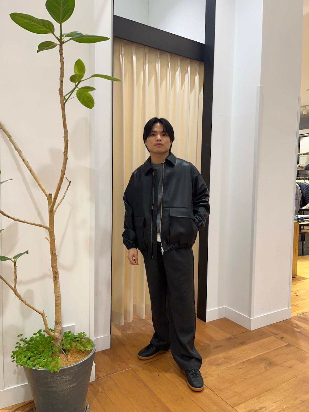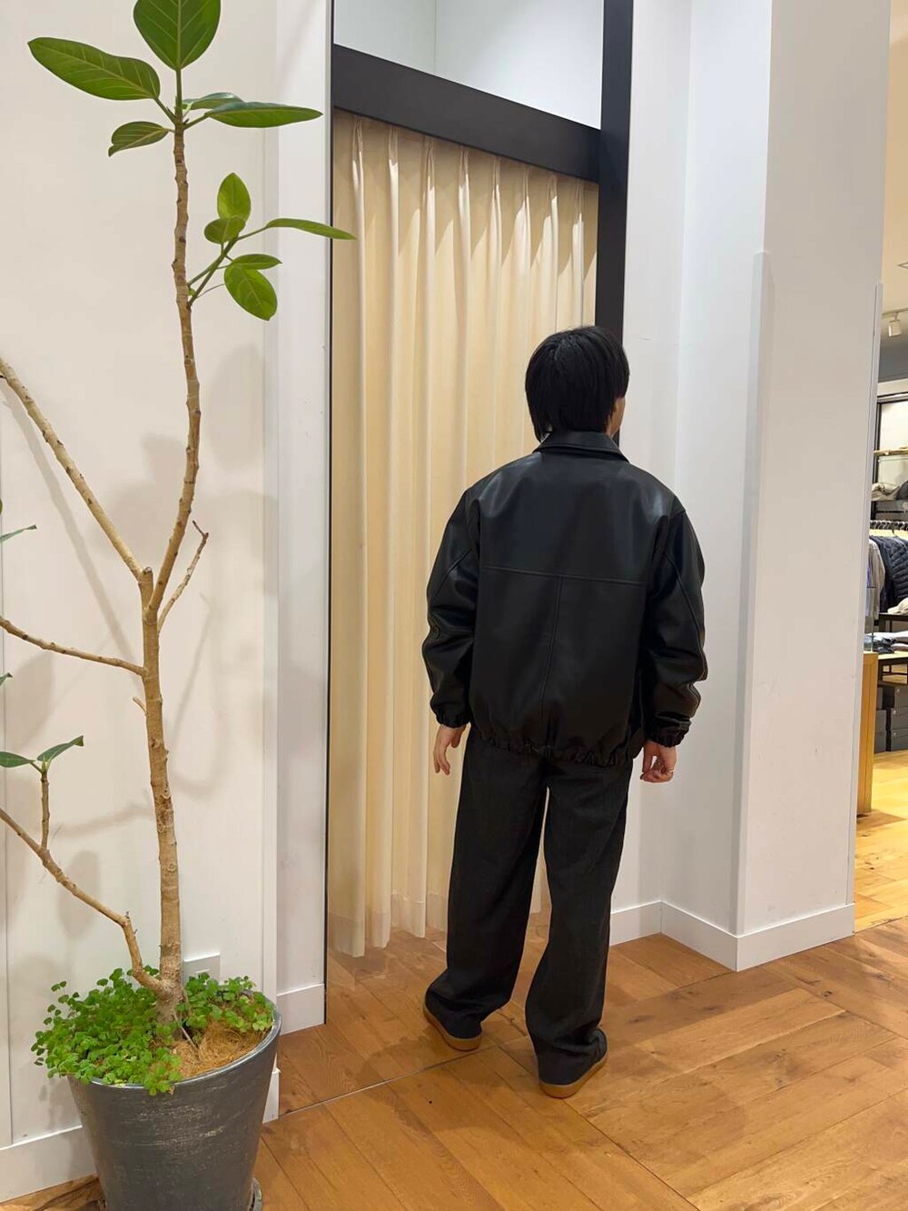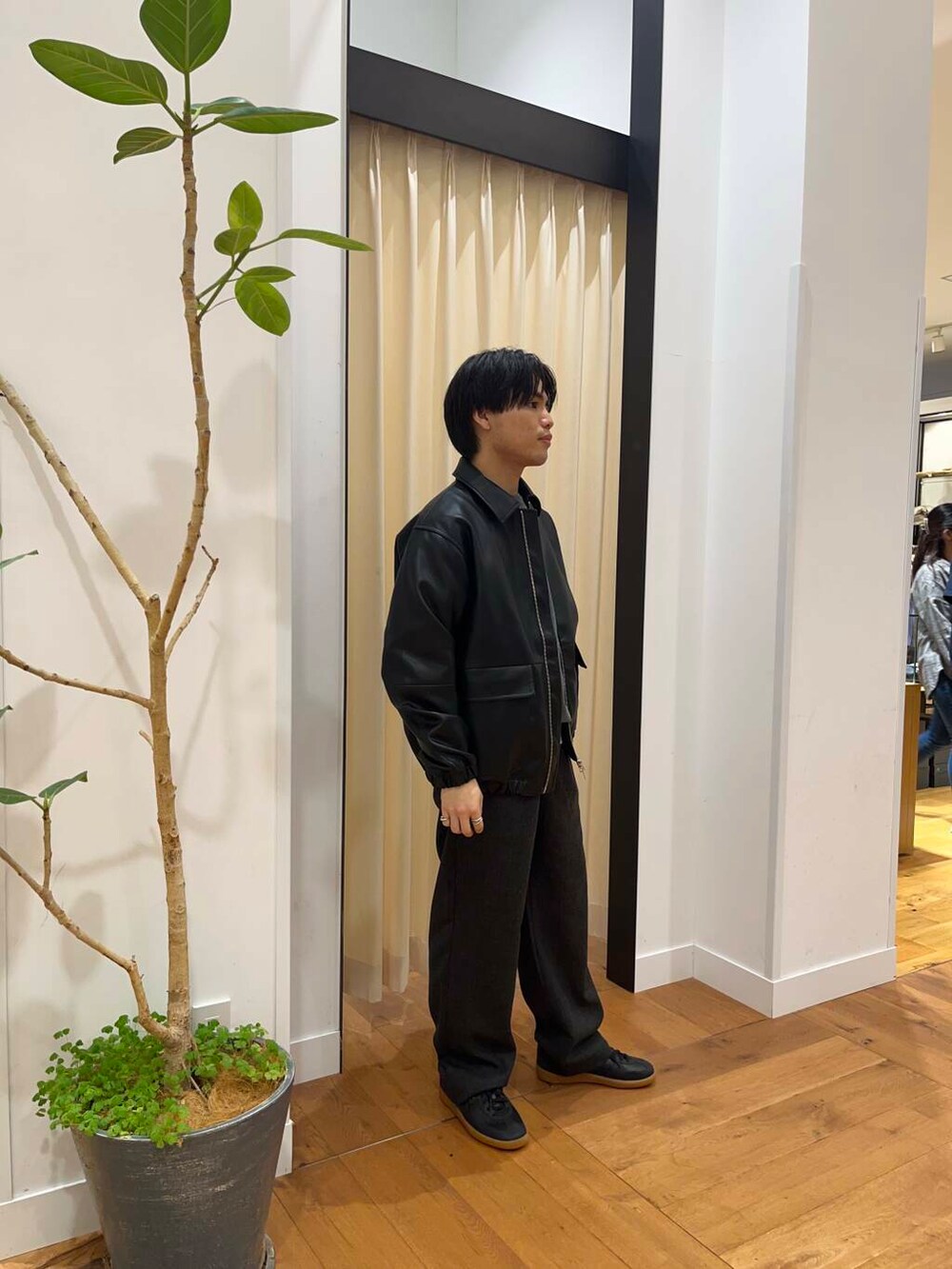 ・トレンドのレザーアウターはライダースではなくブルゾン型でやや短丈を選ぶと今らしさど真ん中です。