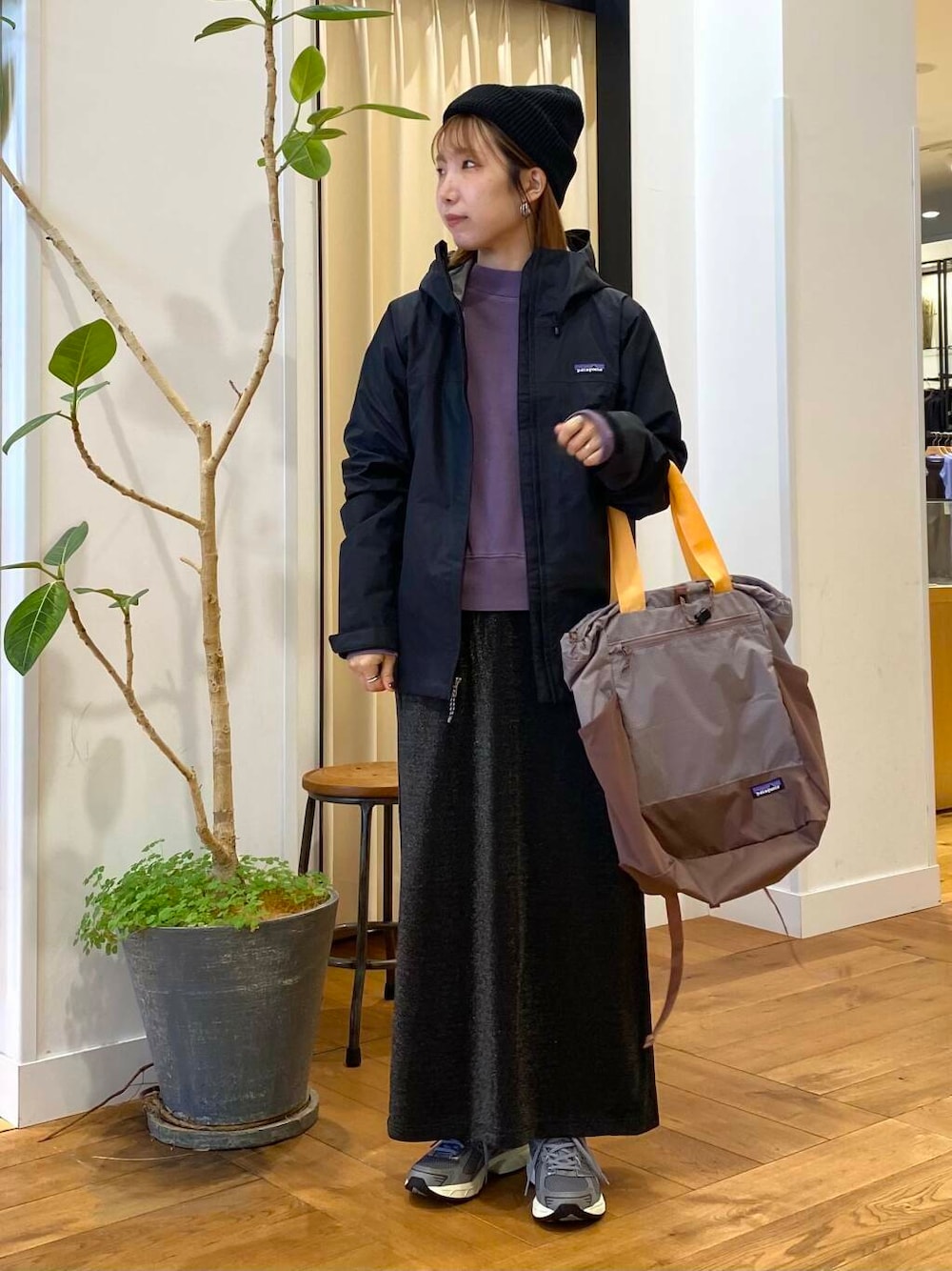 レインジャケットをメインに、中はFORK&SPOONのパープルのスウェットを差し色にして、大人っぽくタイトスカートで合わせました。