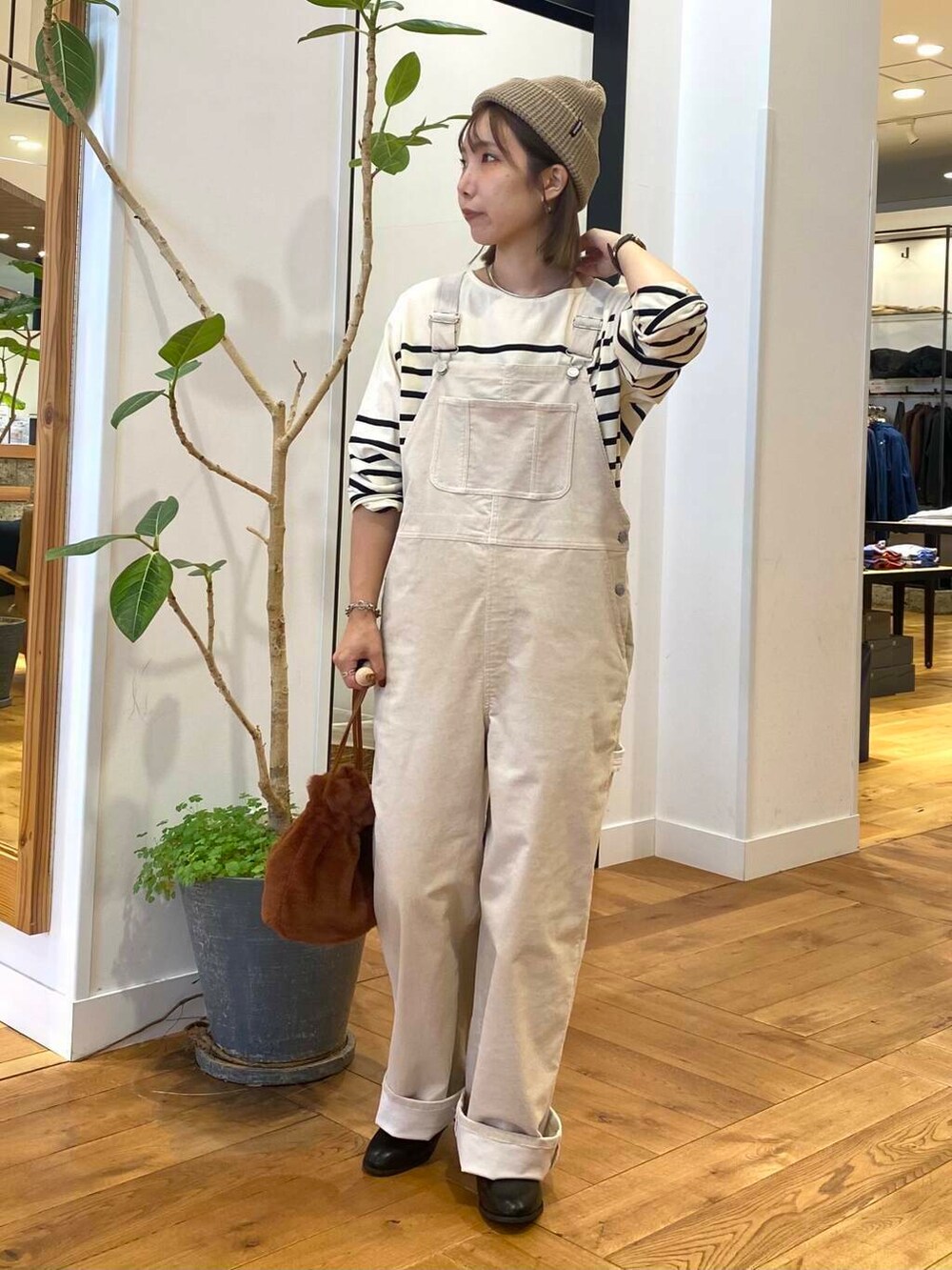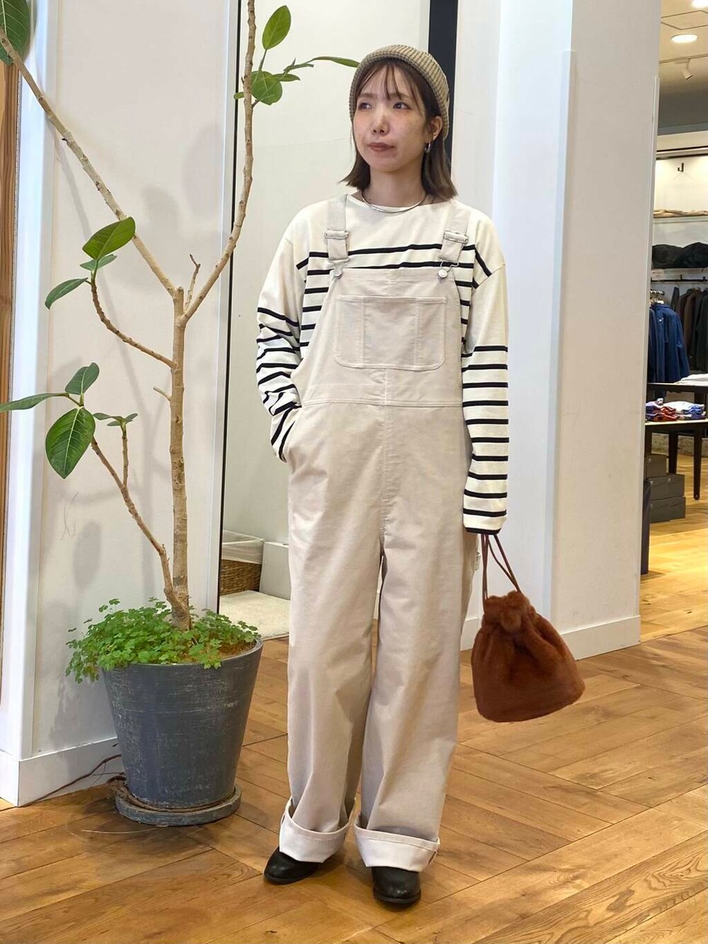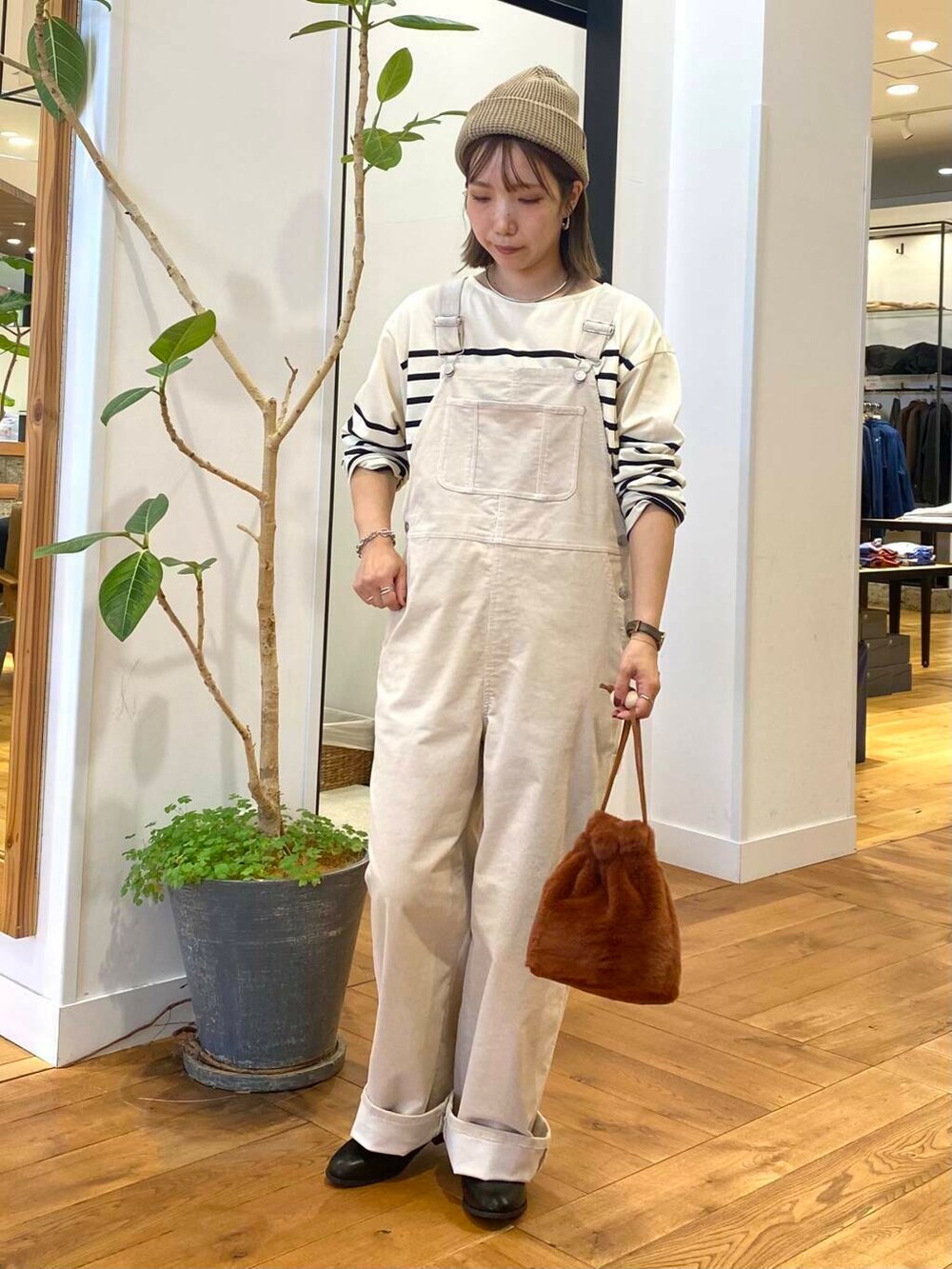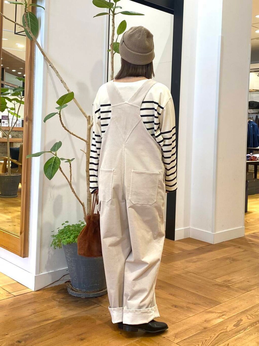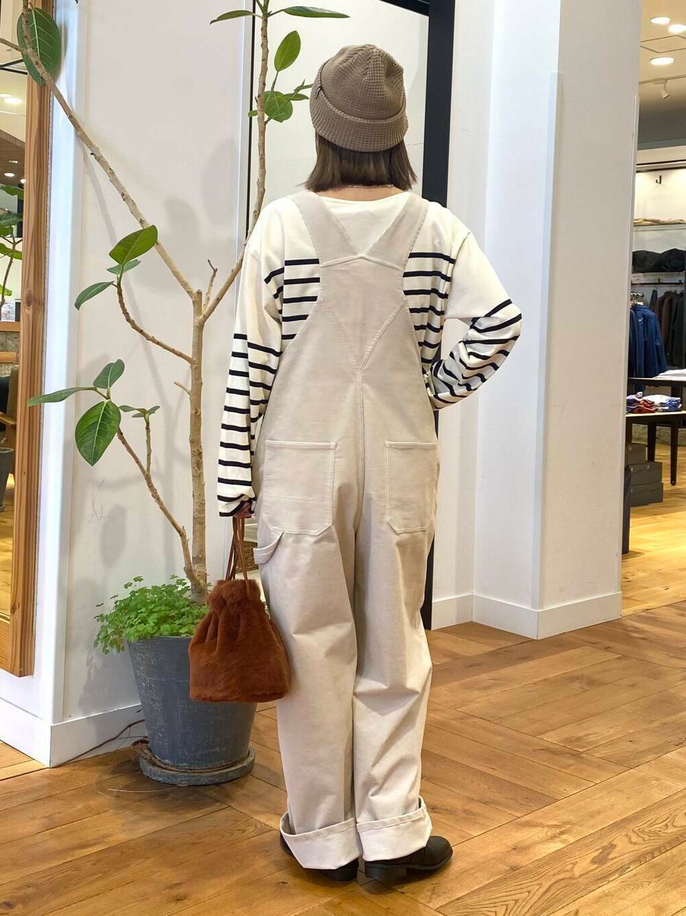 コーデュロイのサロペット、アイボリーを合わせてナチュラルなスタイリングにしました。