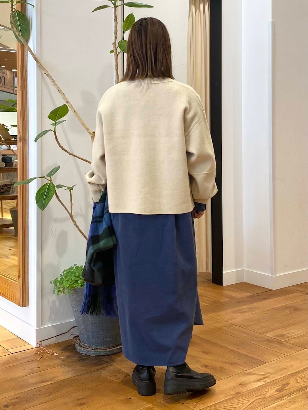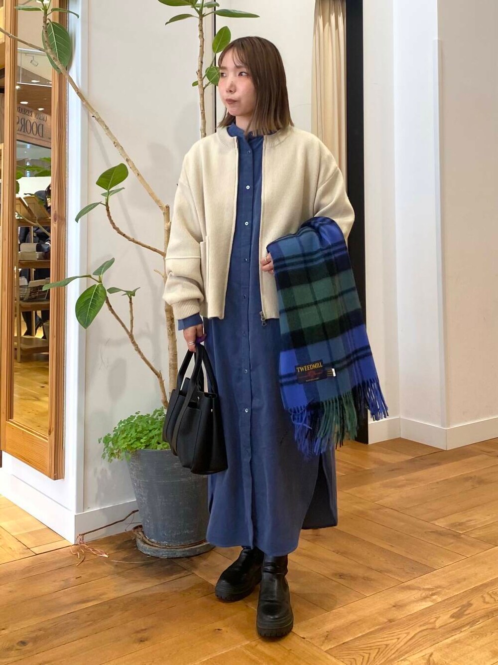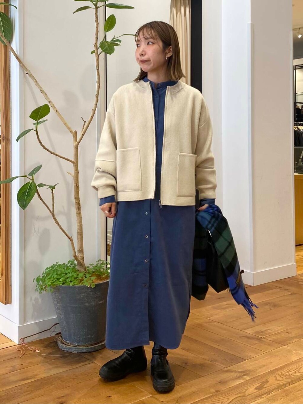 ブルーの鮮やかなコーデュロイワンピースにあたたかなニットのジップカーディガンを合わせて、デートや旅行に行きたい明るい印象のスタイリングにしました。