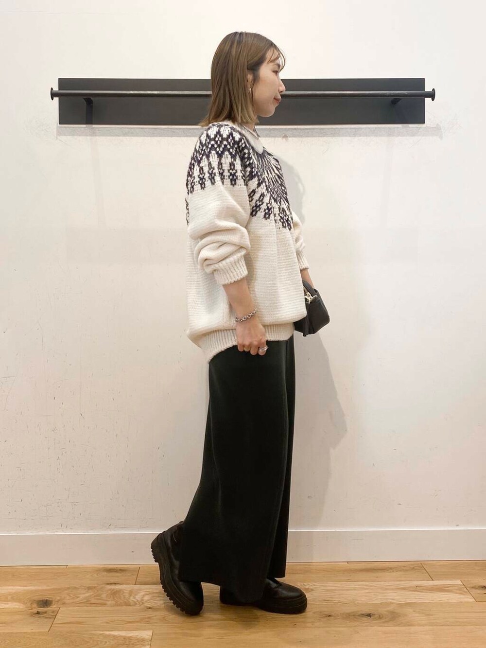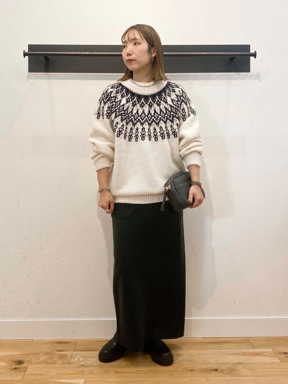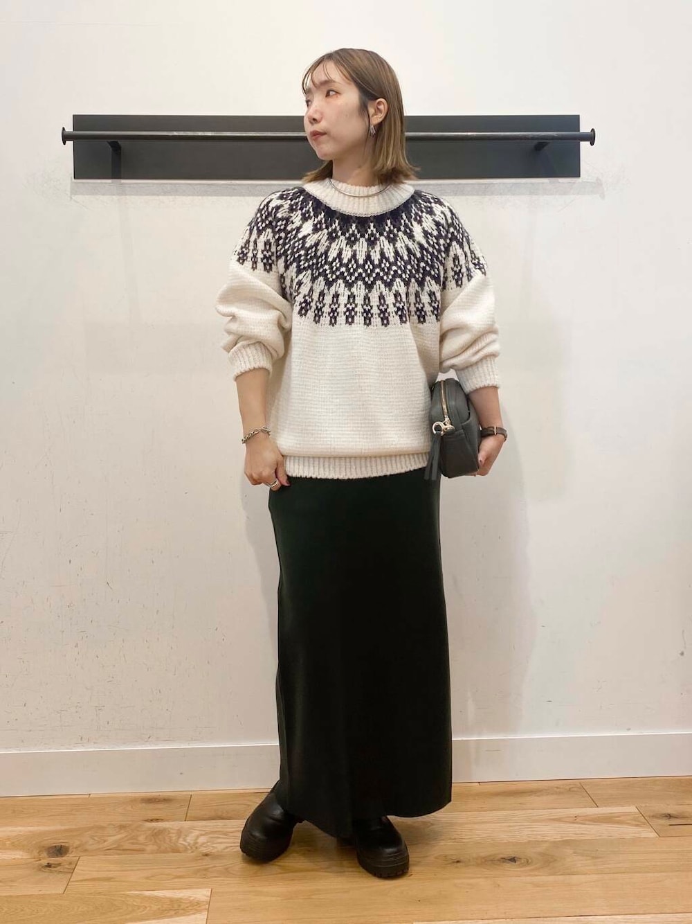 メンズの求人柄ニットでゆったりシルエットに、ボトムはタイトなカラースカートを合わせてメリハリをつけました🎄