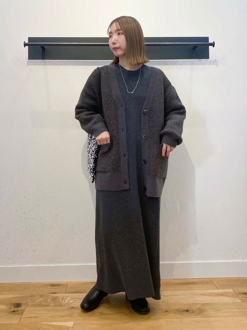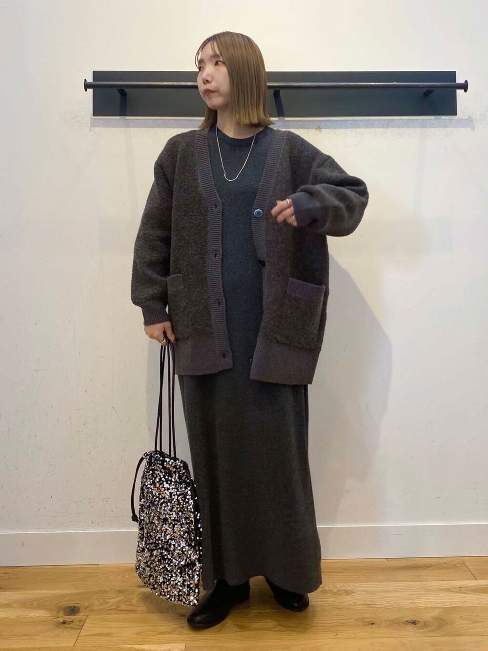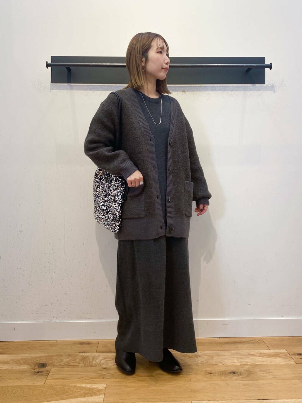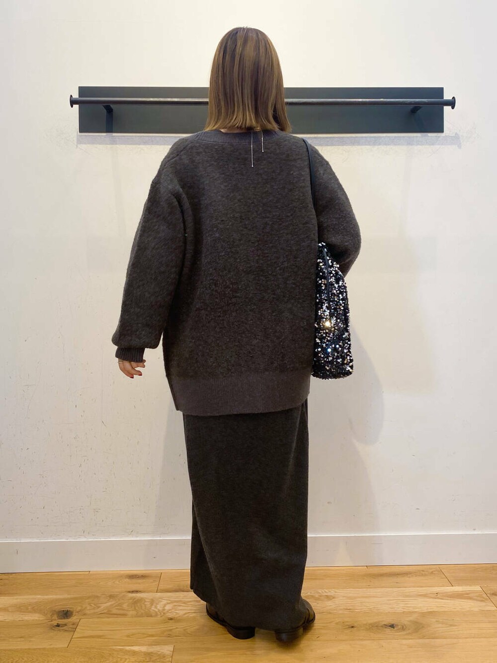 ニットのワンピースにニットのカーディガンをあえて合わせて、スパンコールの鞄をアクセントに、スタイリングがラフなので靴はブーツで引き締めました◎