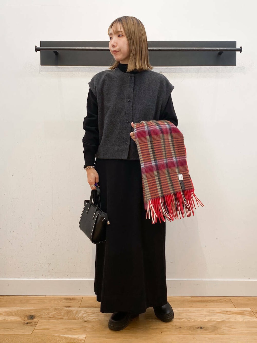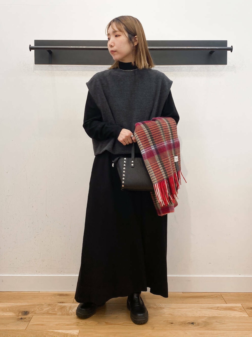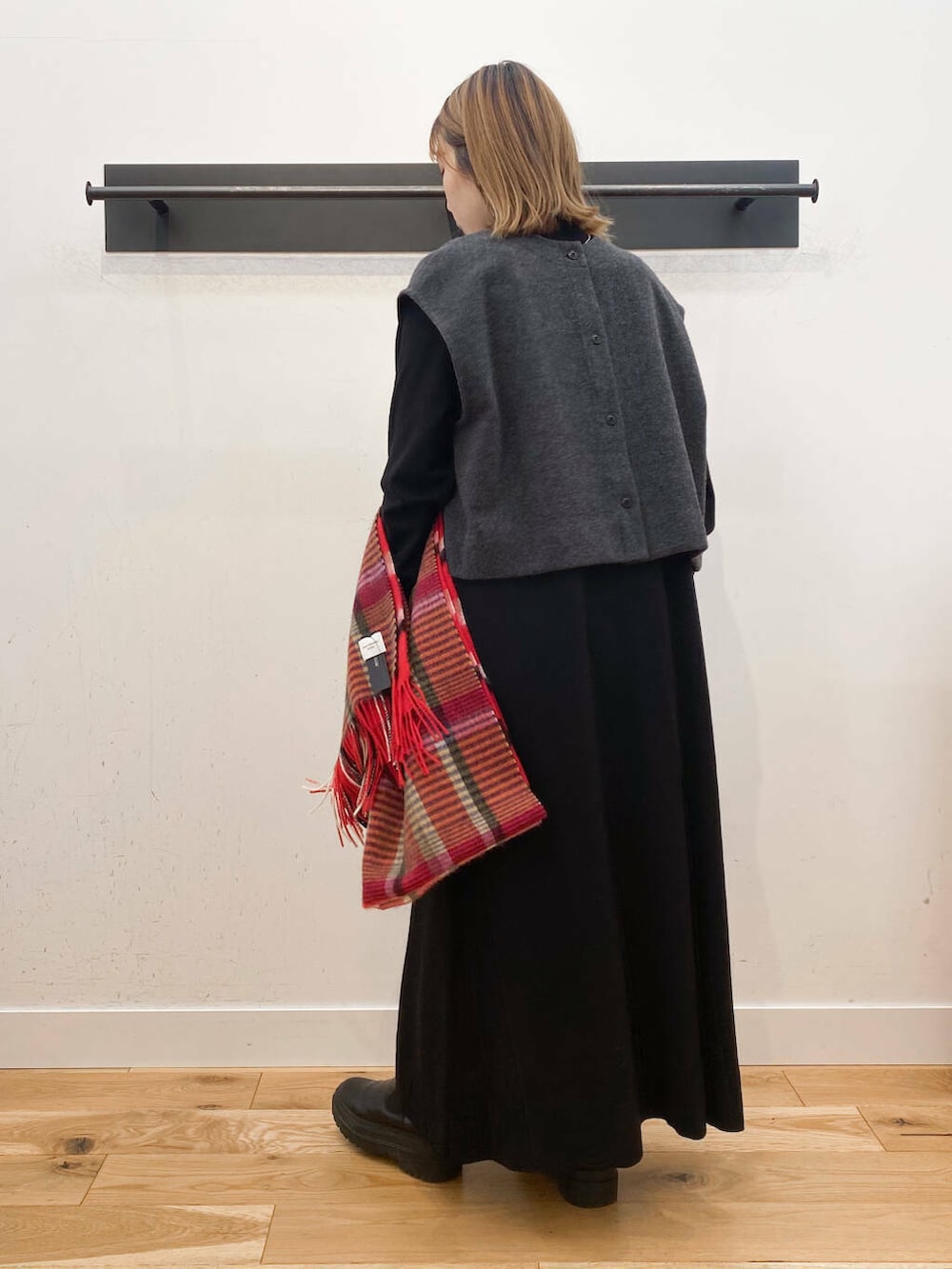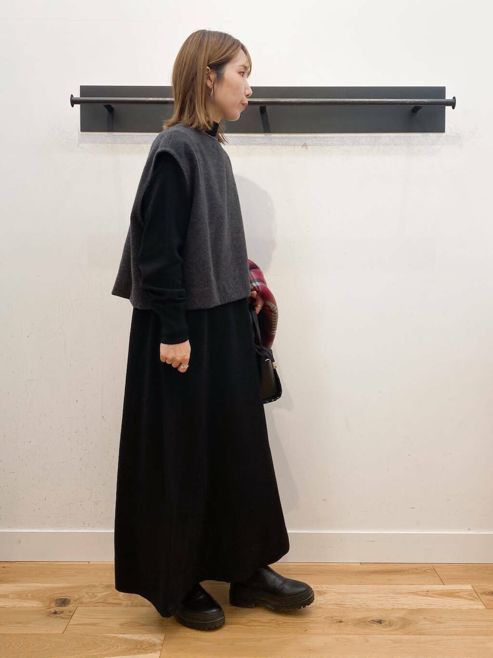 フレアハイネックニットが薄手で着やすいので、かぐれのベストを合わせて見ました。