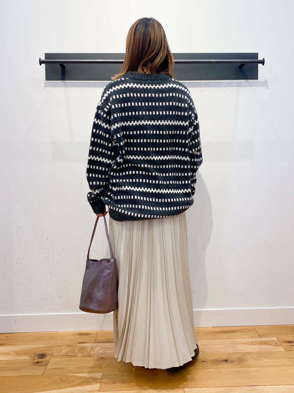 ボトムはプリーツスカートで女性らしく、色が暗くならないように明るい色を選び、全体的にモノトーンに。