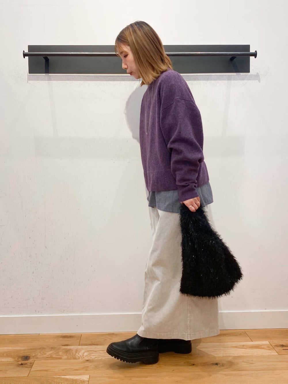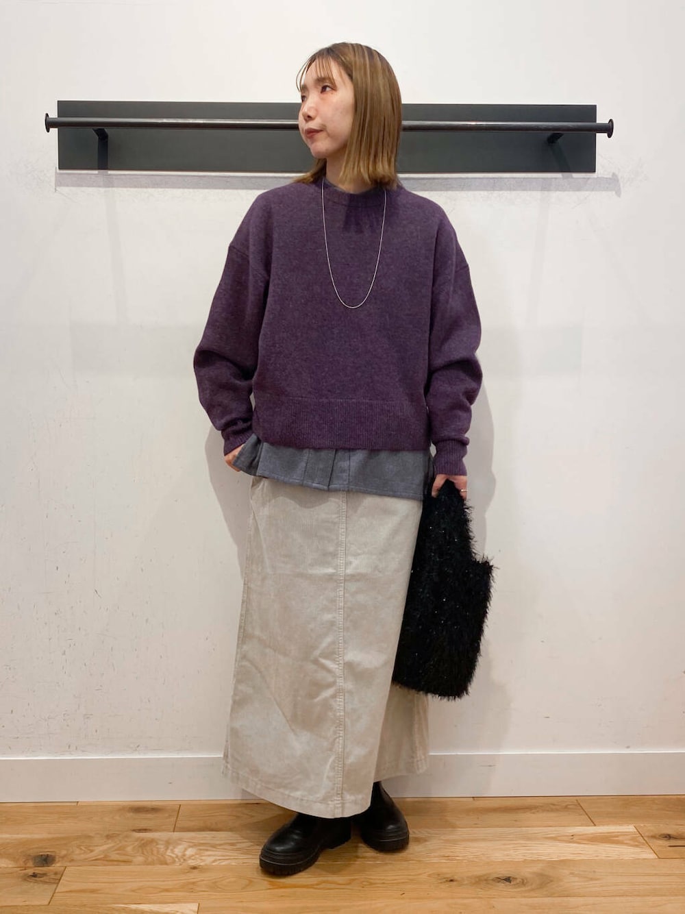 かぐれのパープルニットをメインに、落ち着いた大人カジュアルコーデを組みました。