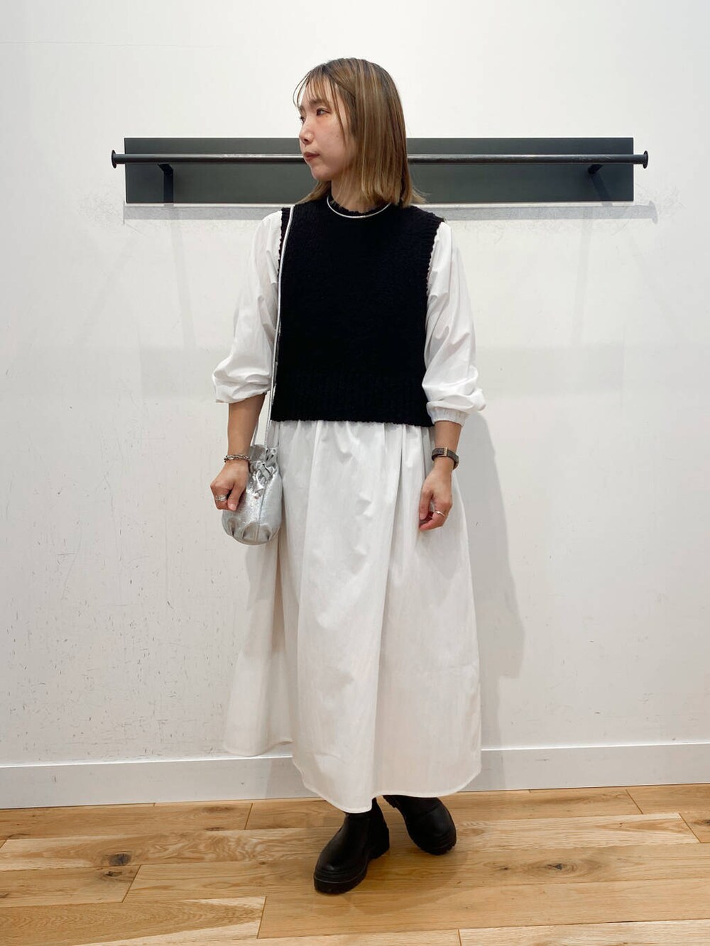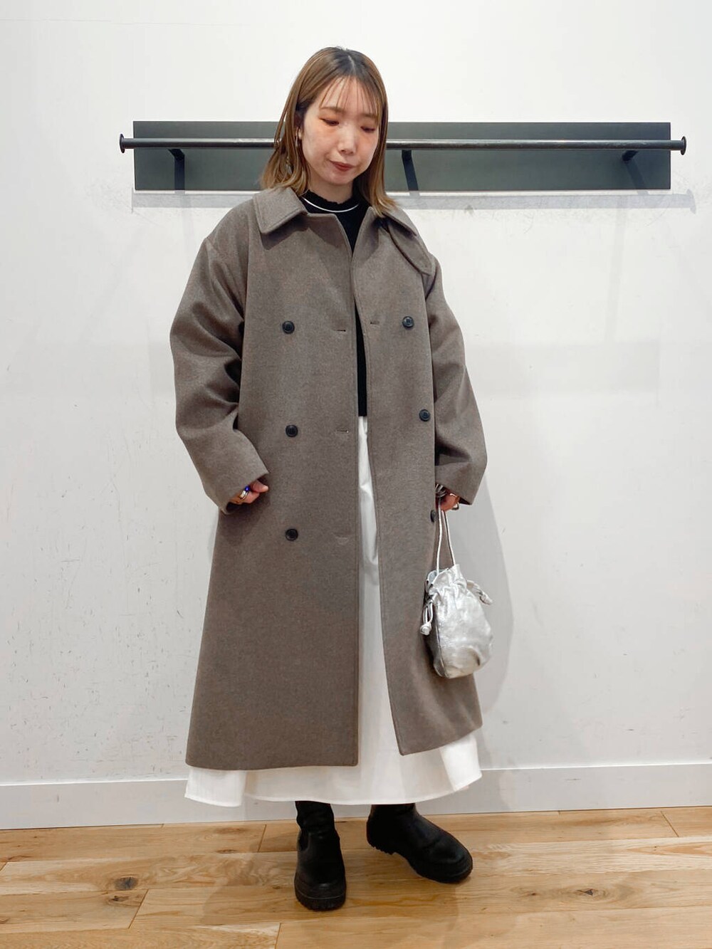ウールロングコートで大人っぽいスタイリングにしました。重くならないように中は明るい色をもってきました。